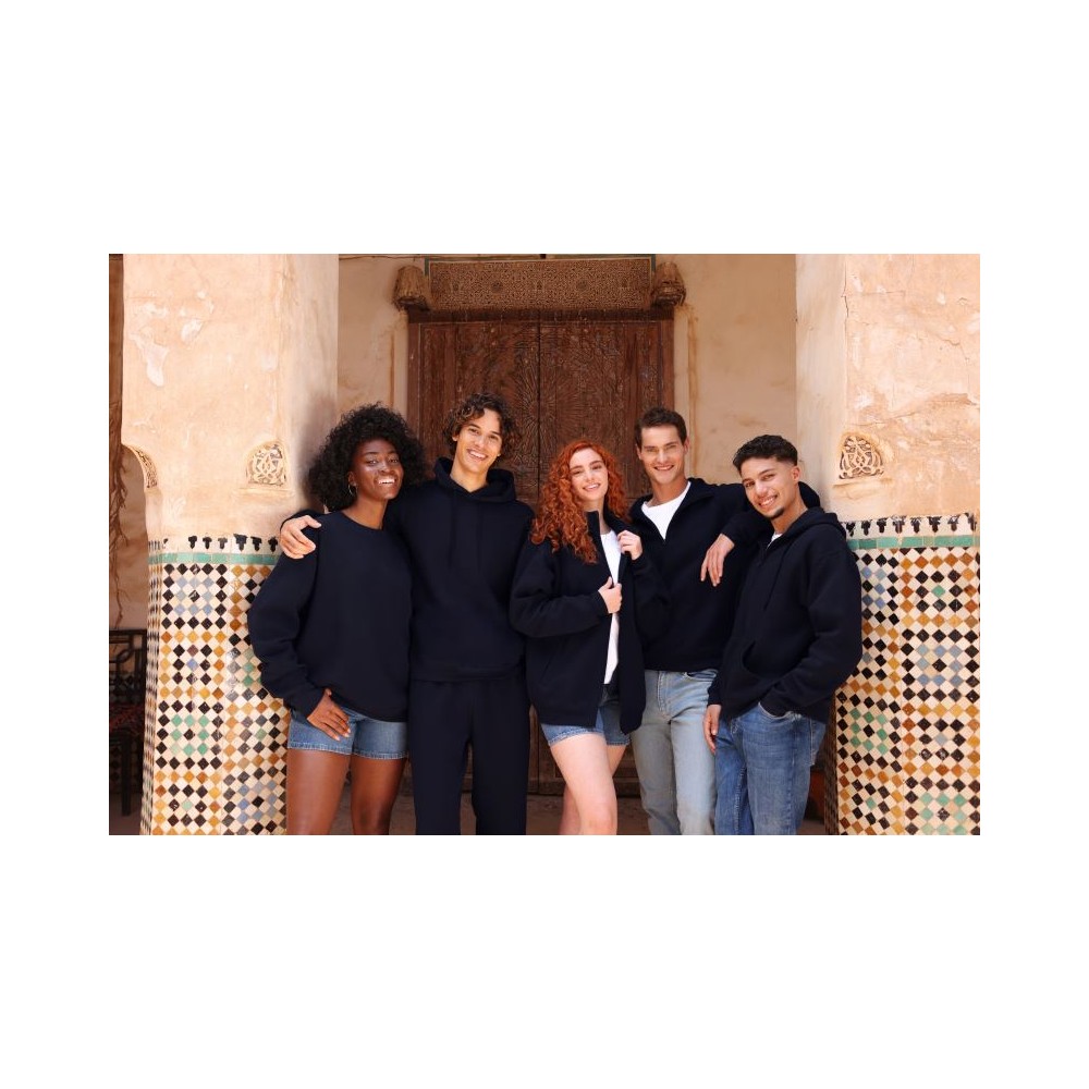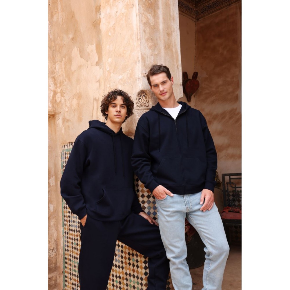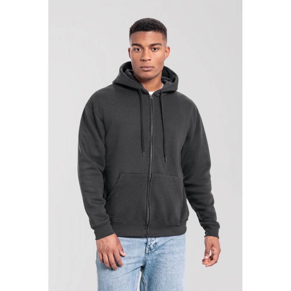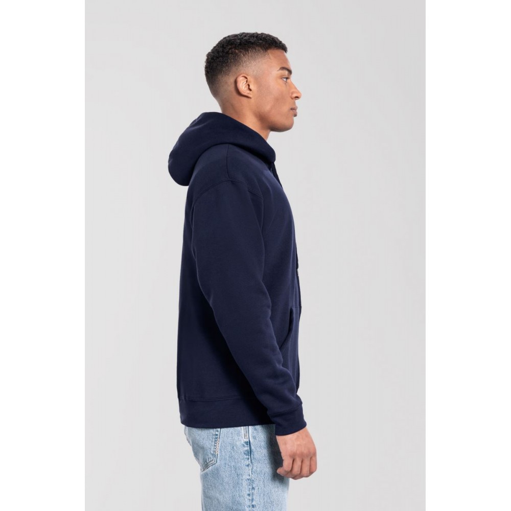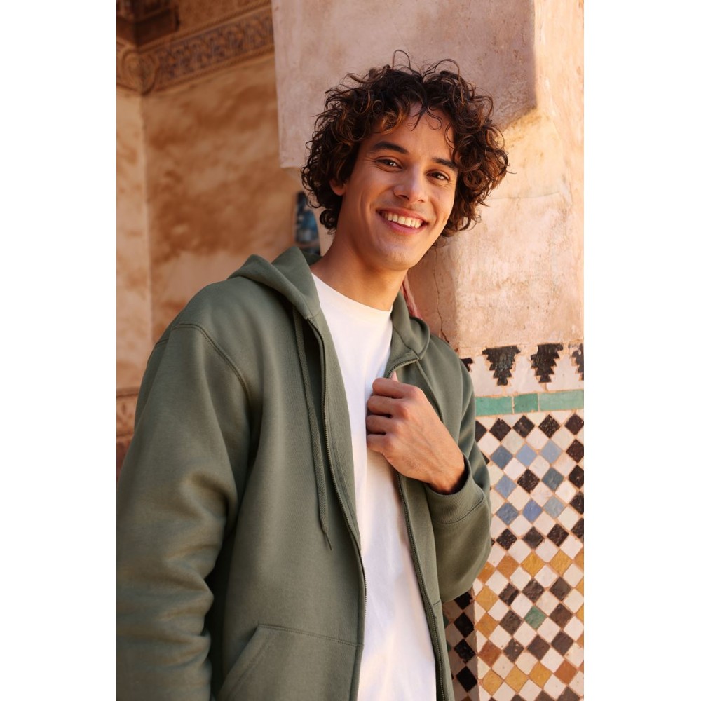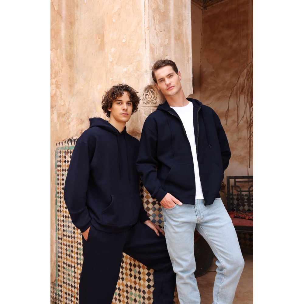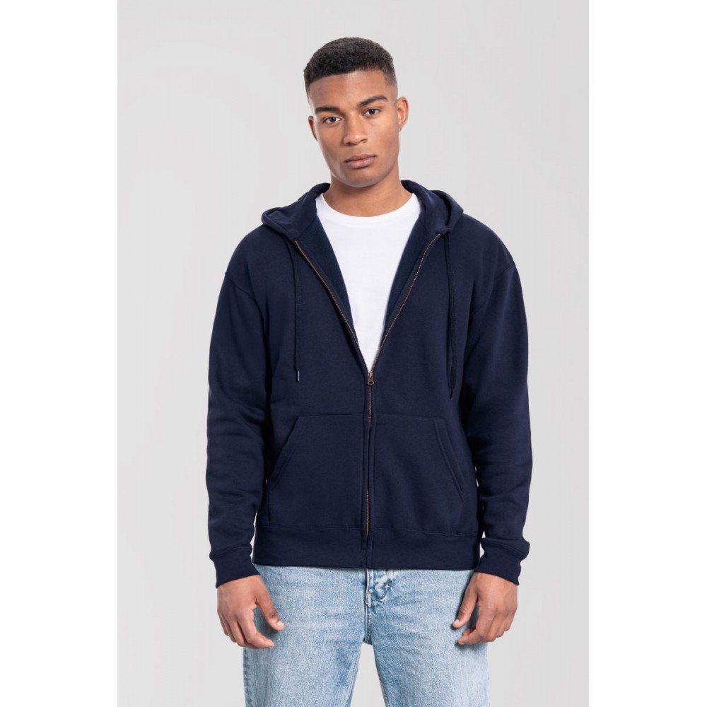 Klasický střih, podšitá kapuce s plochou šňůrkou tón v tónu, žebrované manžety na rukávech a lemu s Lycrou®, skrytý kovový zip, klokaní kapsa, povrch ze 100% bavlny, uvnitř počesaná, Použití udržitelných vláken CiCLO®, štítek Tear Away, pratelné na 40°, lze sušit v sušičce při nízké teplotěg