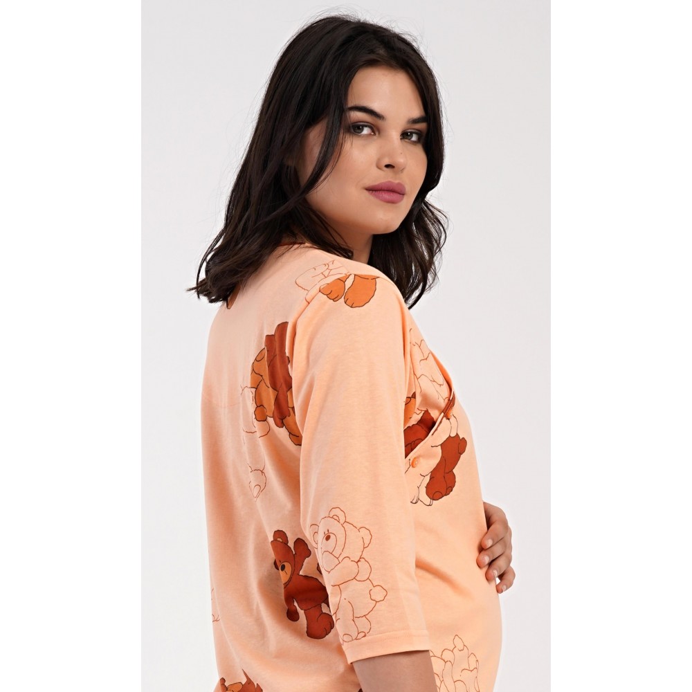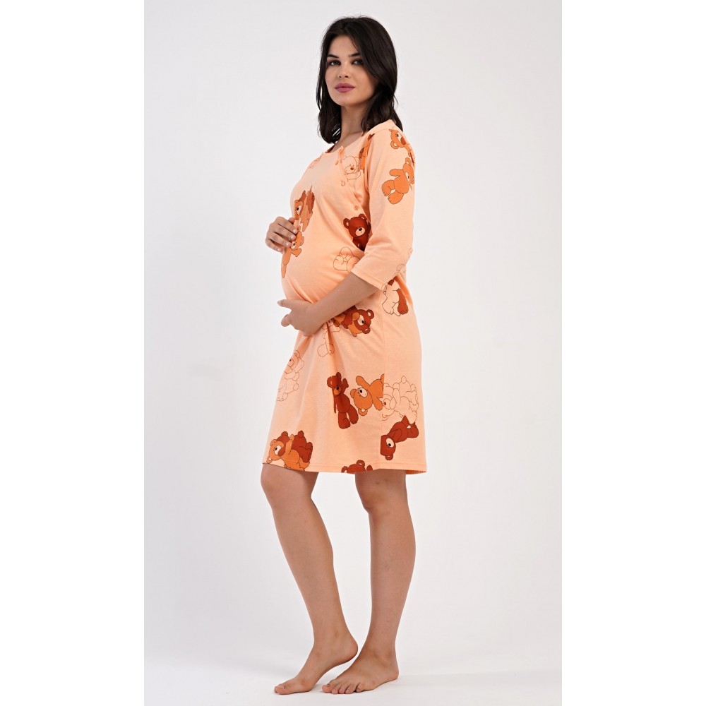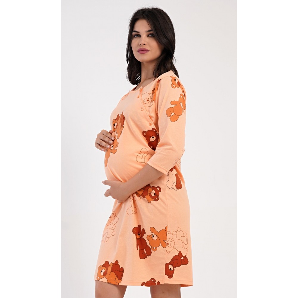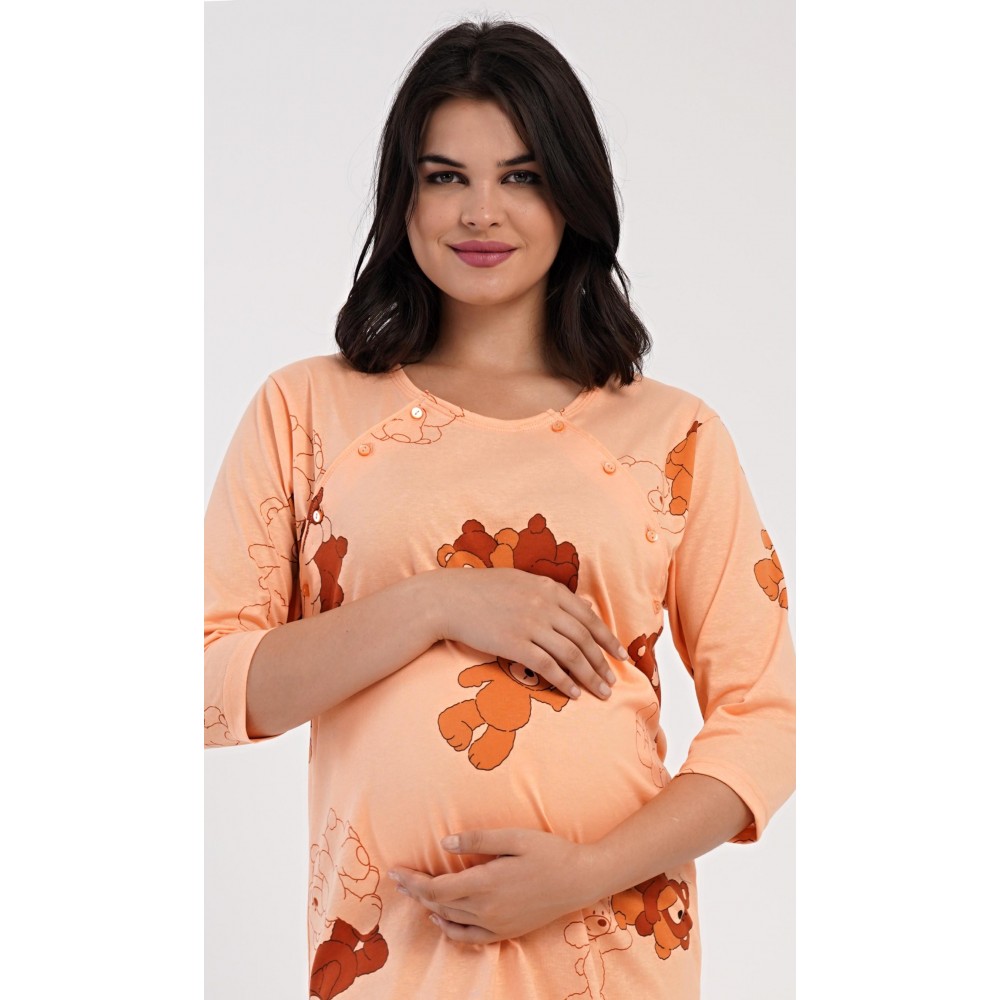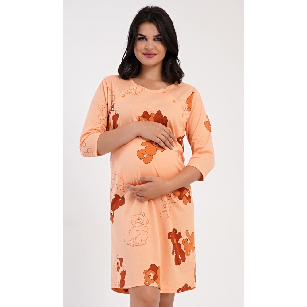 Dámská bavlněná mateřská noční košile s tříčtvrtečním rukávem Patricia. Noční košile je svým střihem určená na dobu těhotenství, do porodnice i ke kojení. Ke kojení slouží průstřihy po stranách košile, které jsou uzavíratelné na knoflíky. Jednobarevná košile je ozdobena obrázky medvídků. Použitý materiál s podílem bavlny 100% je příjemný a poddajný na dotek.