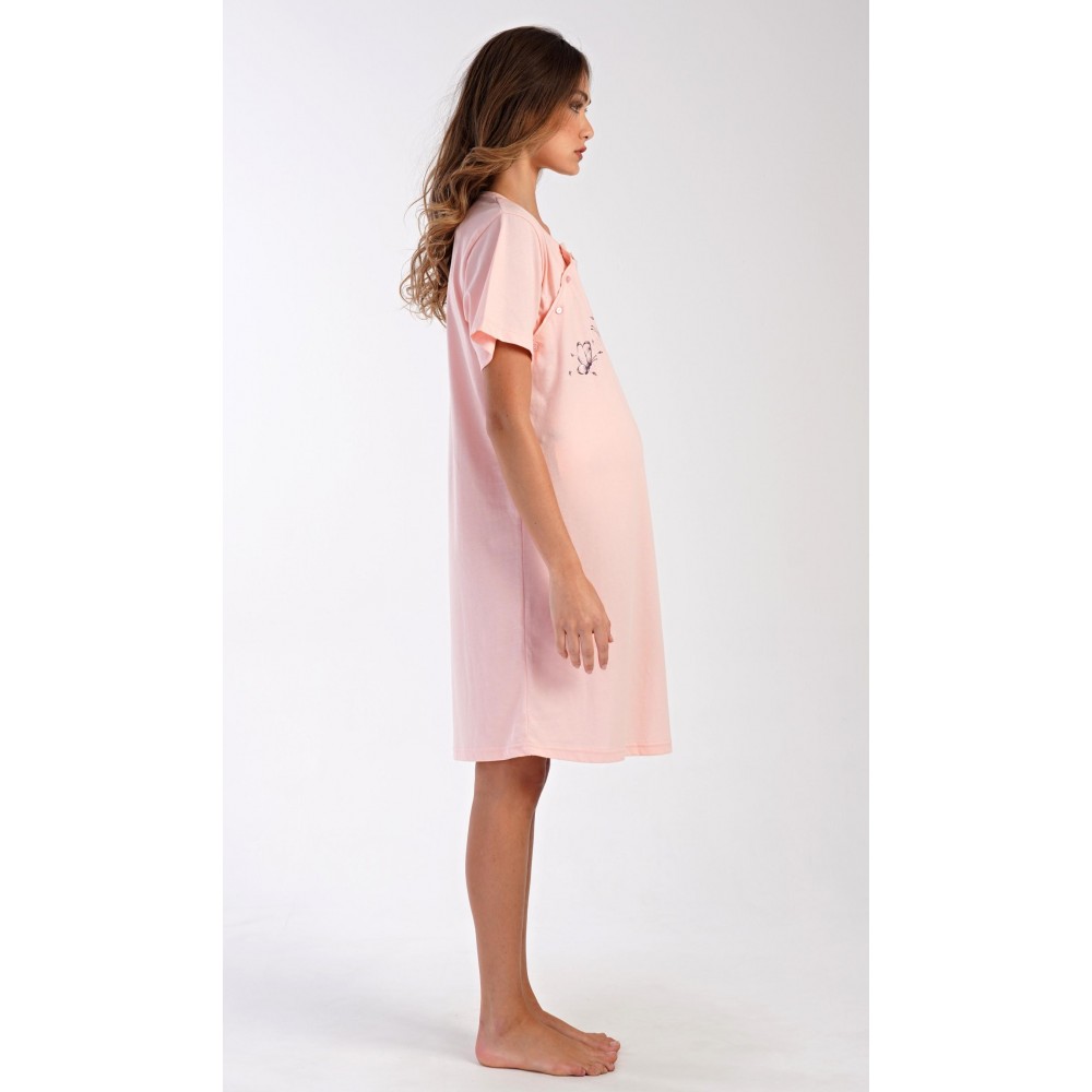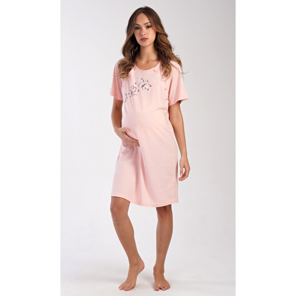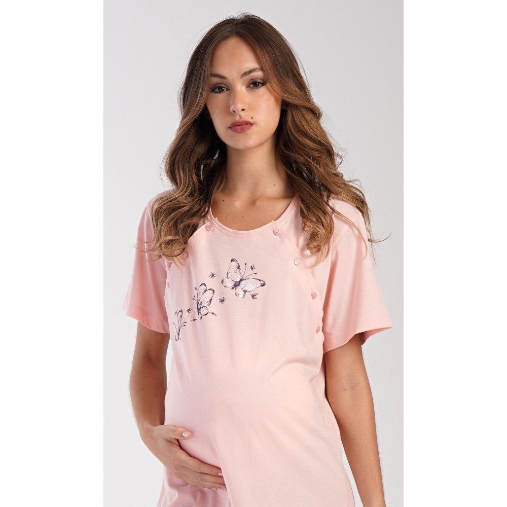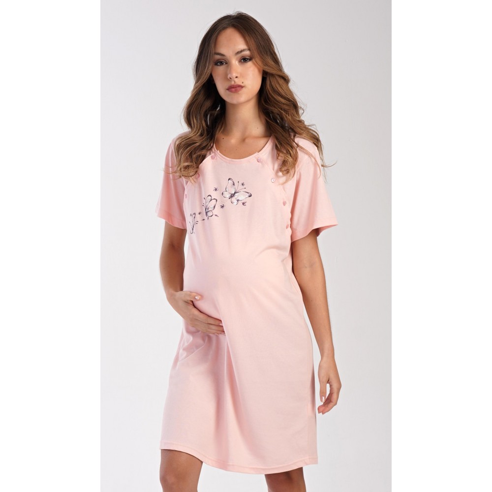 Dámská bavlněná mateřská noční košile s krátkým rukávem Butterfly. Noční košile je svým střihem určená na dobu těhotenství, do porodnice i ke kojení. Ke kojení slouží průstřihy po stranách košile, které jsou uzavíratelné na knoflíky. Jednobarevná košile je ozdobena obrázkem motýlků. Použitý materiál s podílem bavlny 100% je příjemný a poddajný na dotek.