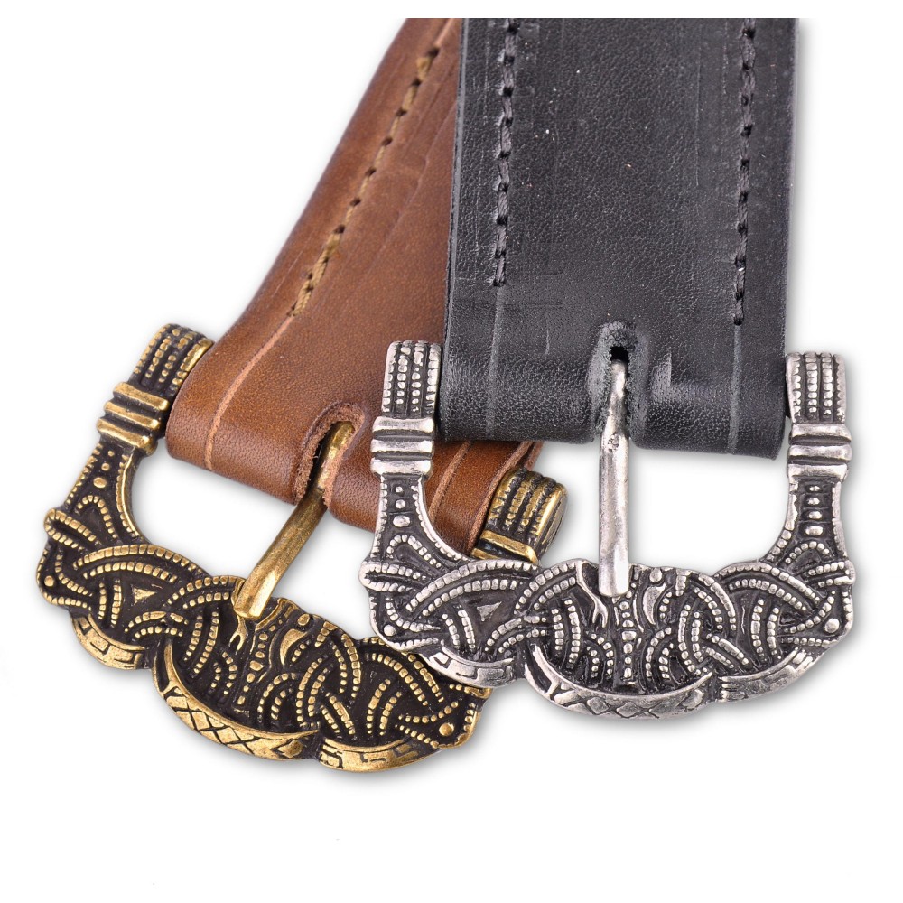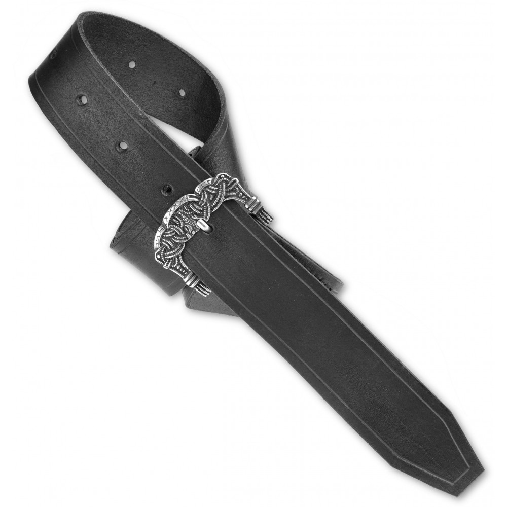 Kožený opasek s kovovou přezkou zdobenou severskými motivy. Opasek má dírky v rozmezí obvodu pasu cca 90 - 110 cm. Na přání můžeme vyrobit opasek dle požadovaných parametrů, například delší než 130 cm, jiná barva a pod. V případě zájmu nás neváhejte kontaktovat, nebo napište požadavek do poznámky k objednávce.