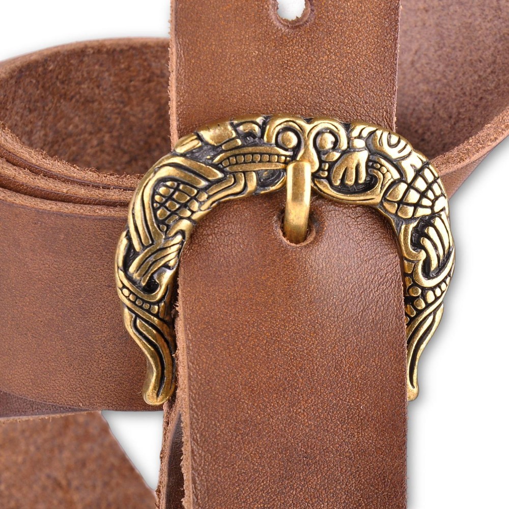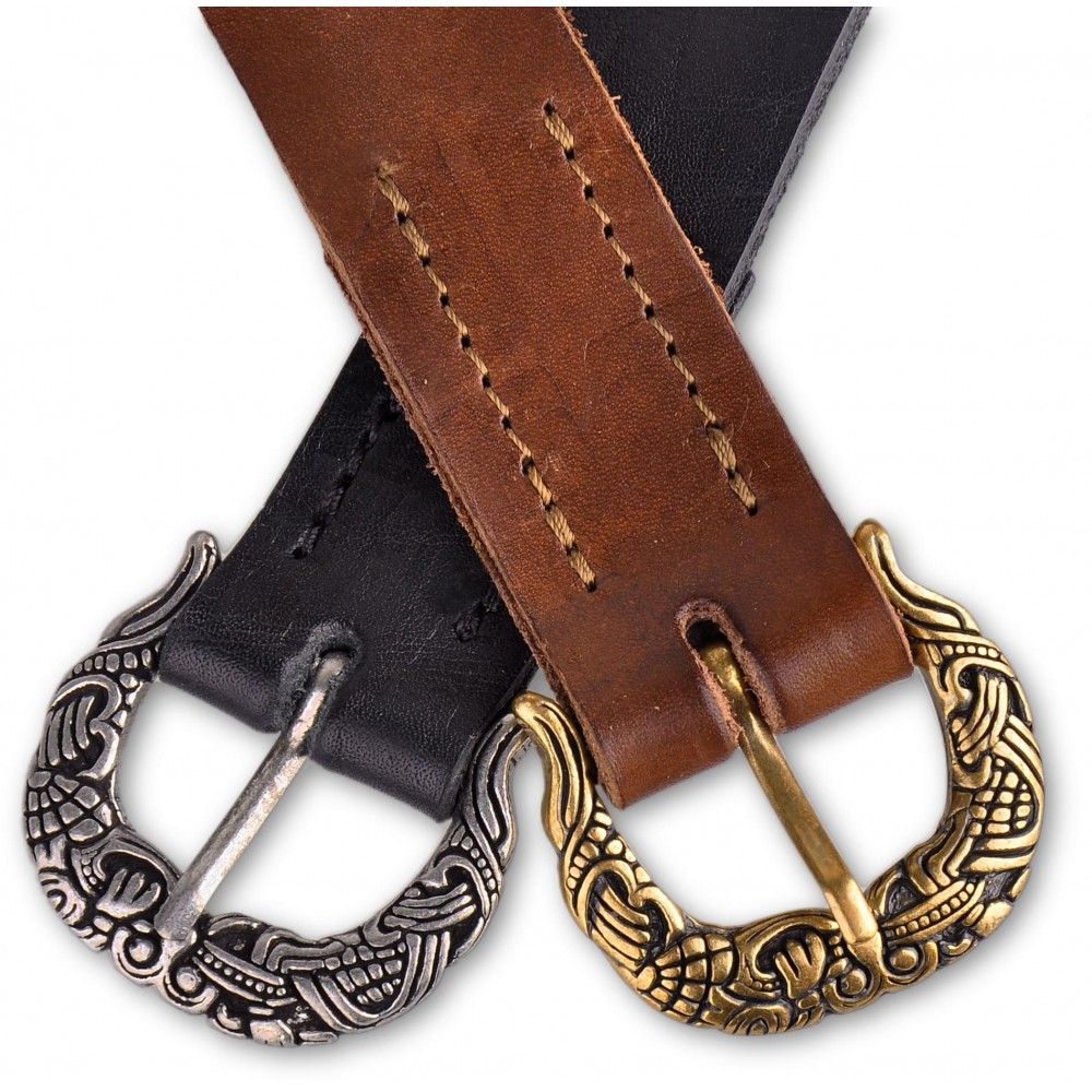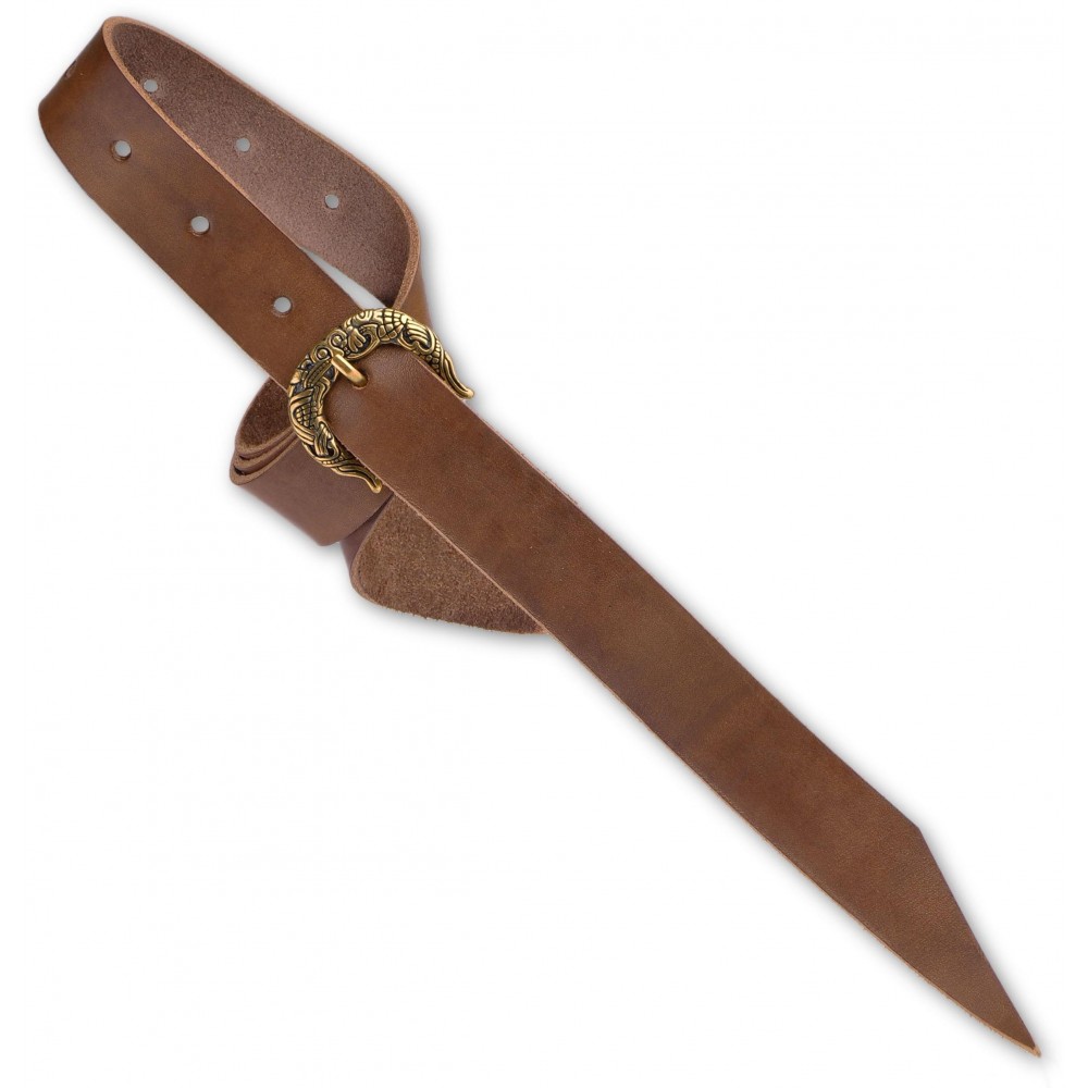 Stylový kožený opasek s kovovou přezkou zdobenou vikingskými motivy. Opasek má dírky v rozmezí obvodu pasu cca 90 - 110 cm. Na přání můžeme vyrobit opasek dle požadovaných parametrů, například delší než 130 cm, jiná barva a pod. V případě zájmu nás neváhejte kontaktovat, nebo napište požadavek do poznámky k objednávce.