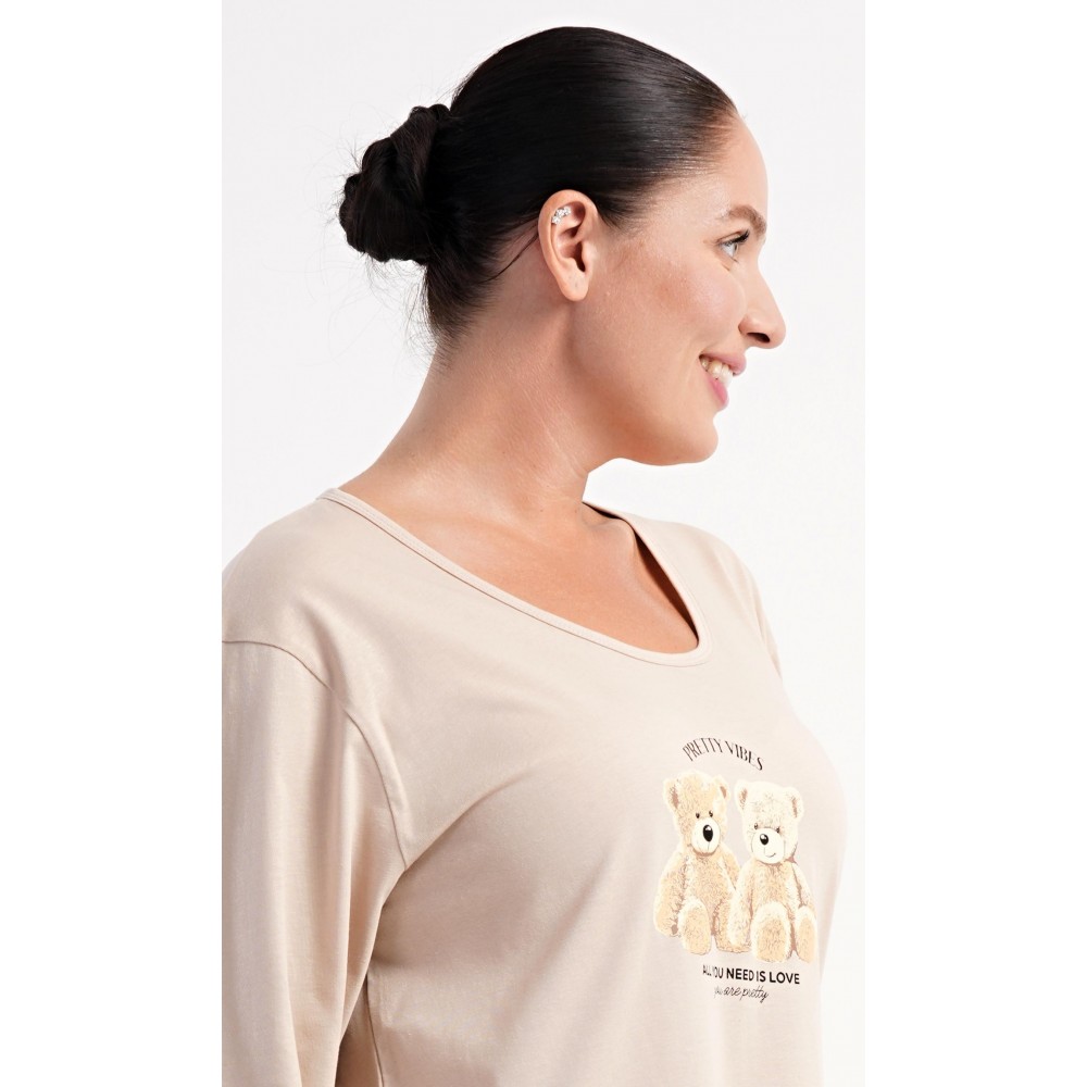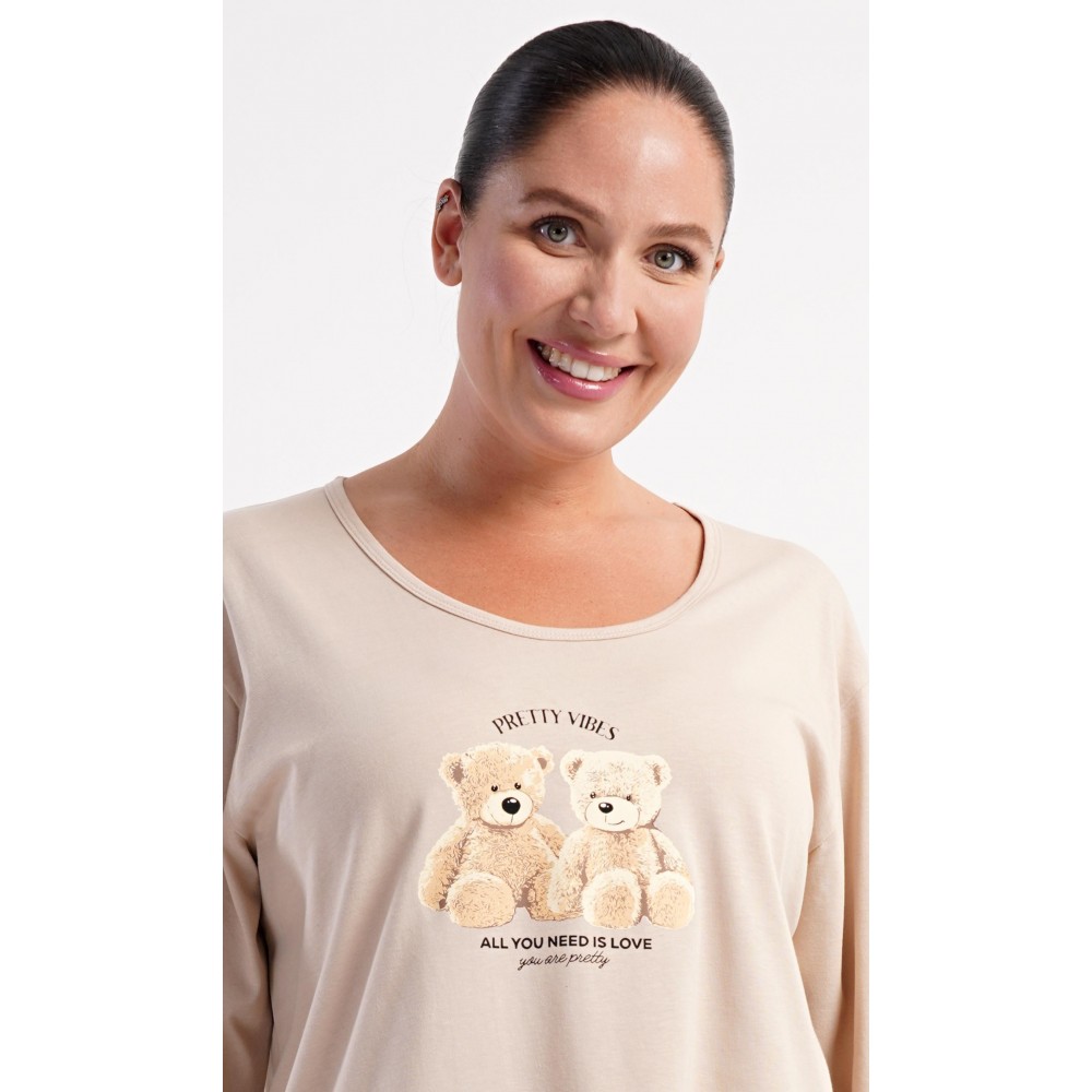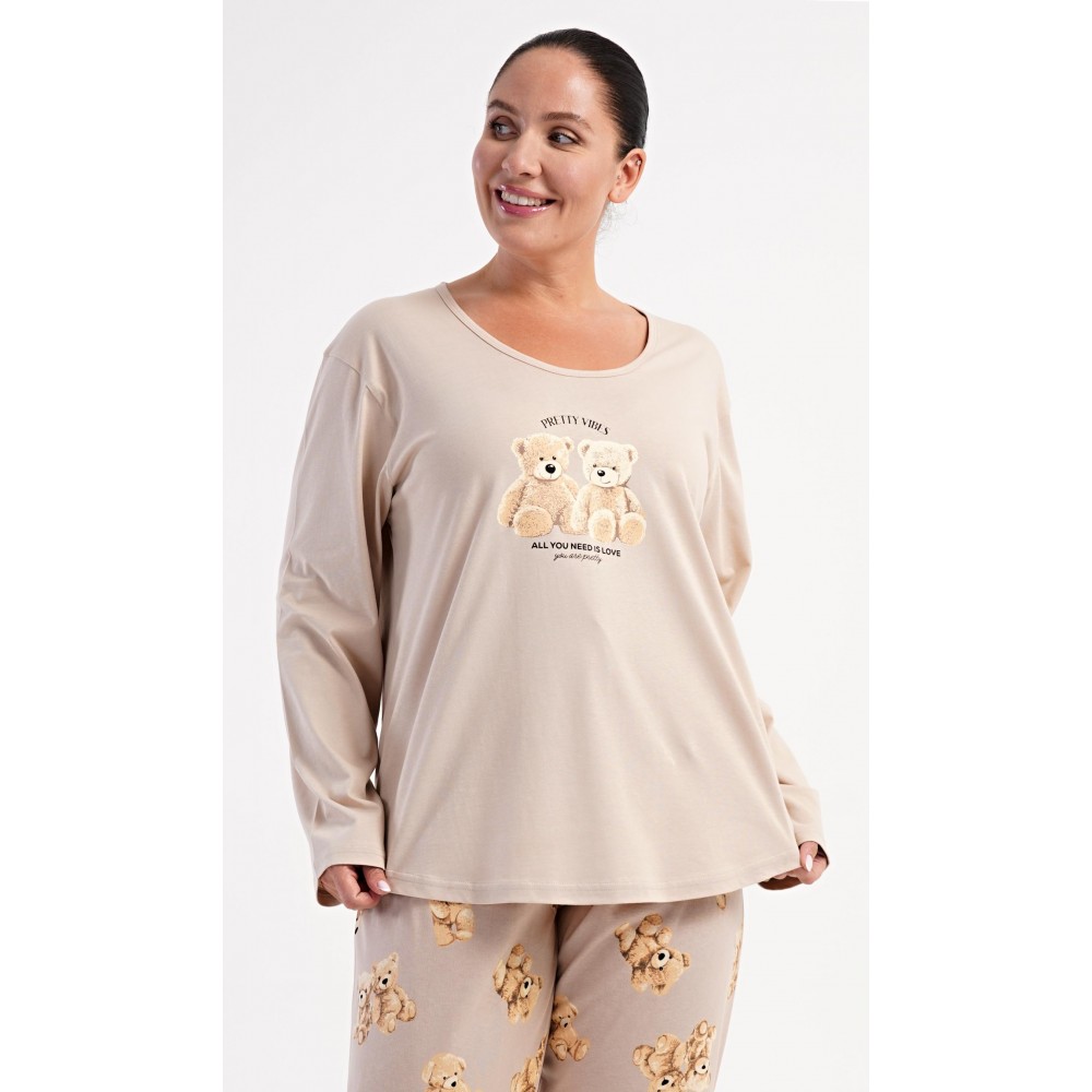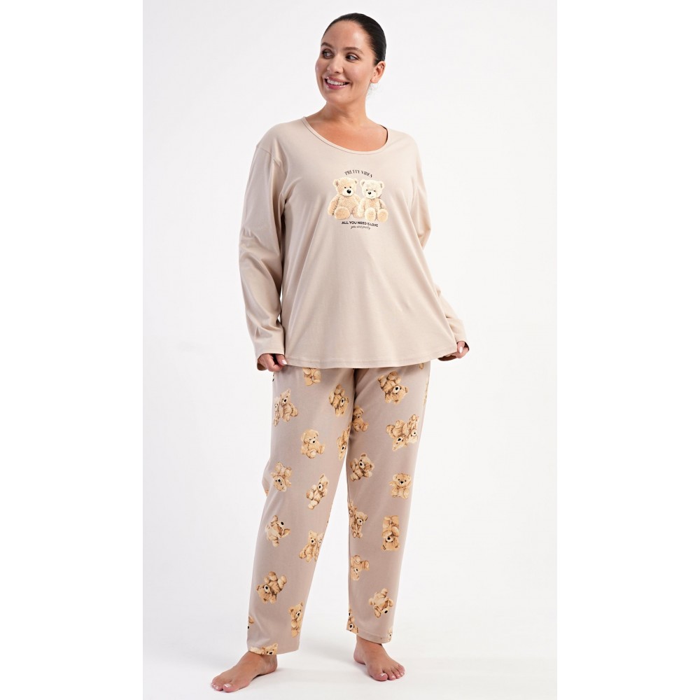 Dámské bavlněné dlouhé pyžamo Méďové. Dámské pyžamo se skládá z trika s dlouhým rukávem a dlouhých kalhot. Triko s kulatým výstřihem je na hrudi zdobeno obrázkem plyšových medvědů. Tento motiv se opakuje i na kalhotách, které mají v pase gumu a šňůrku na stažení, nemají kapsy. Použitý bavlněný materiál je poddajný a příjemný na dotek.