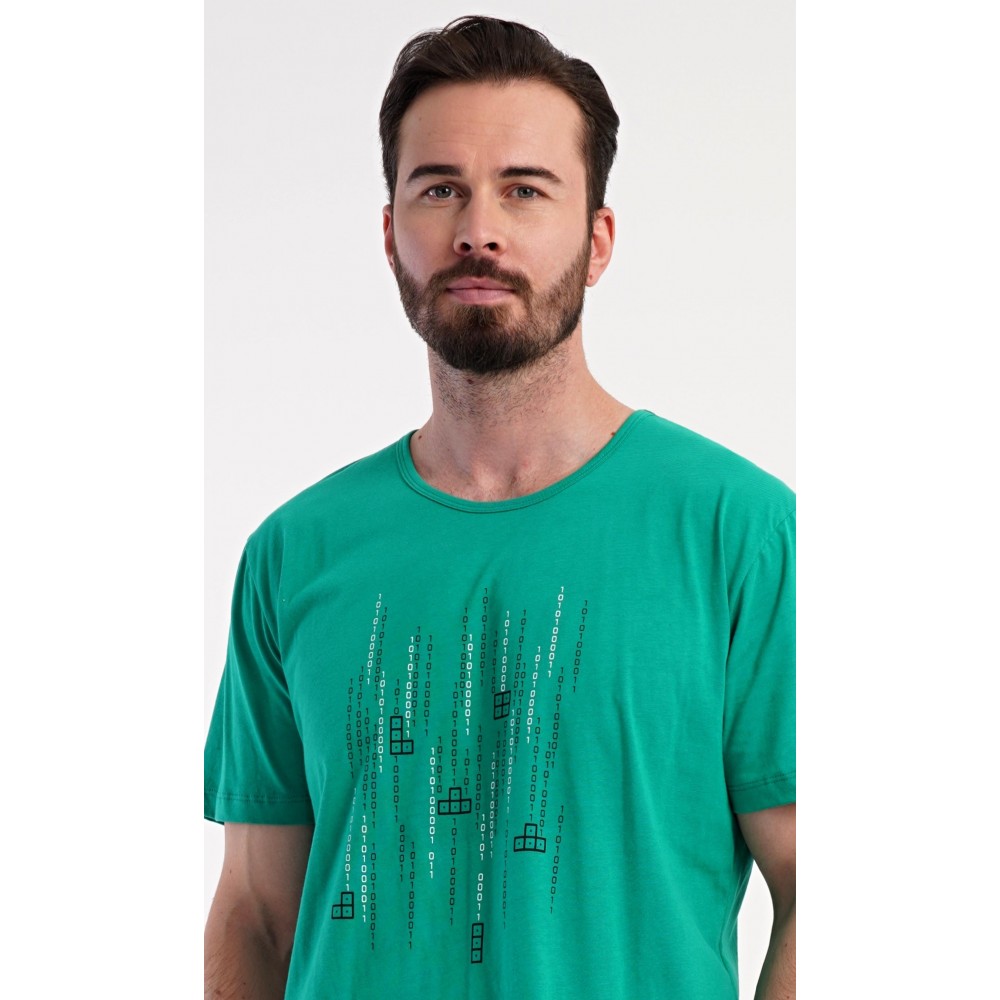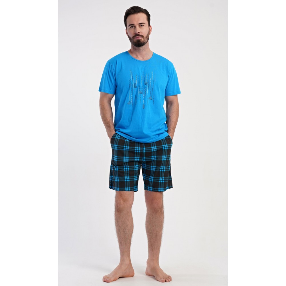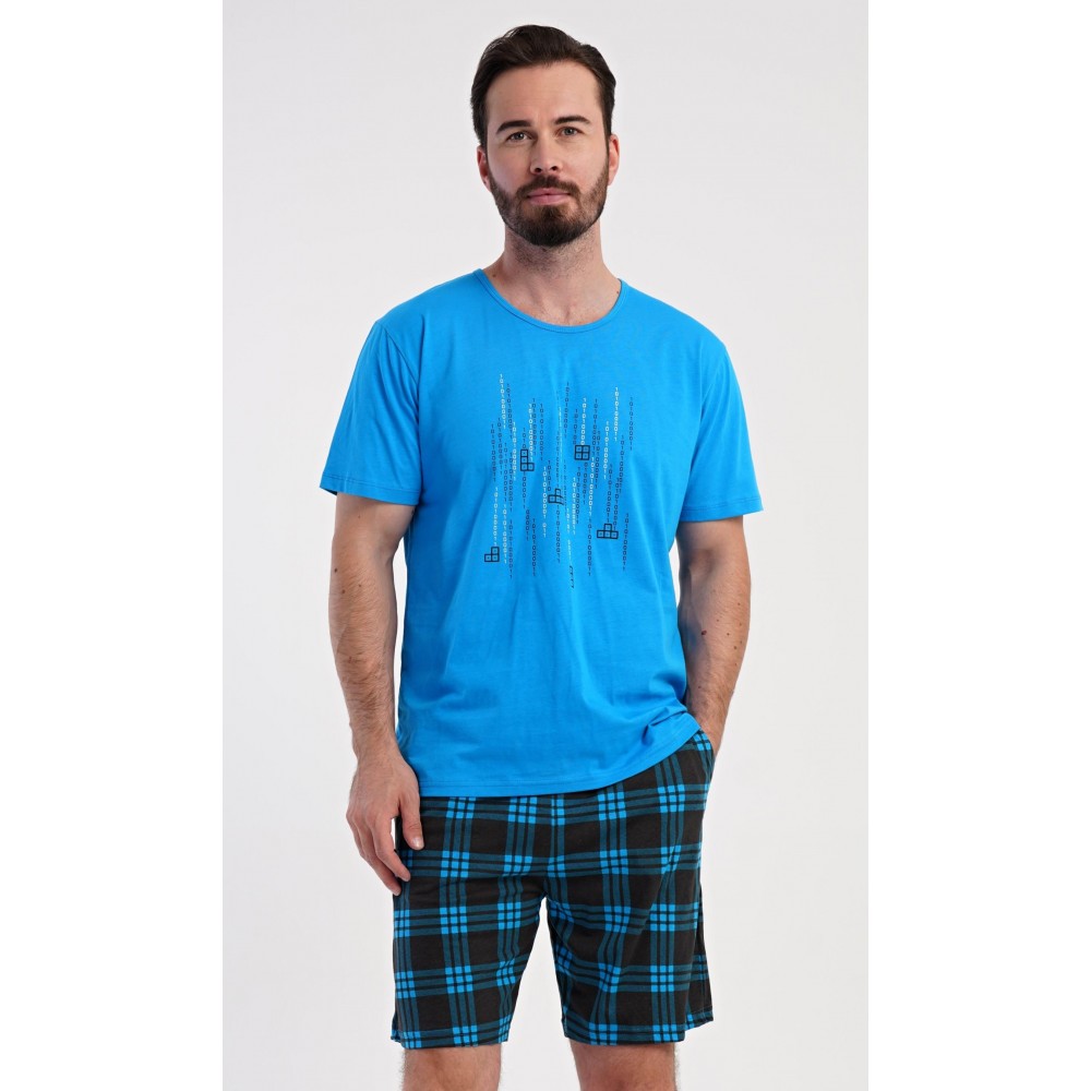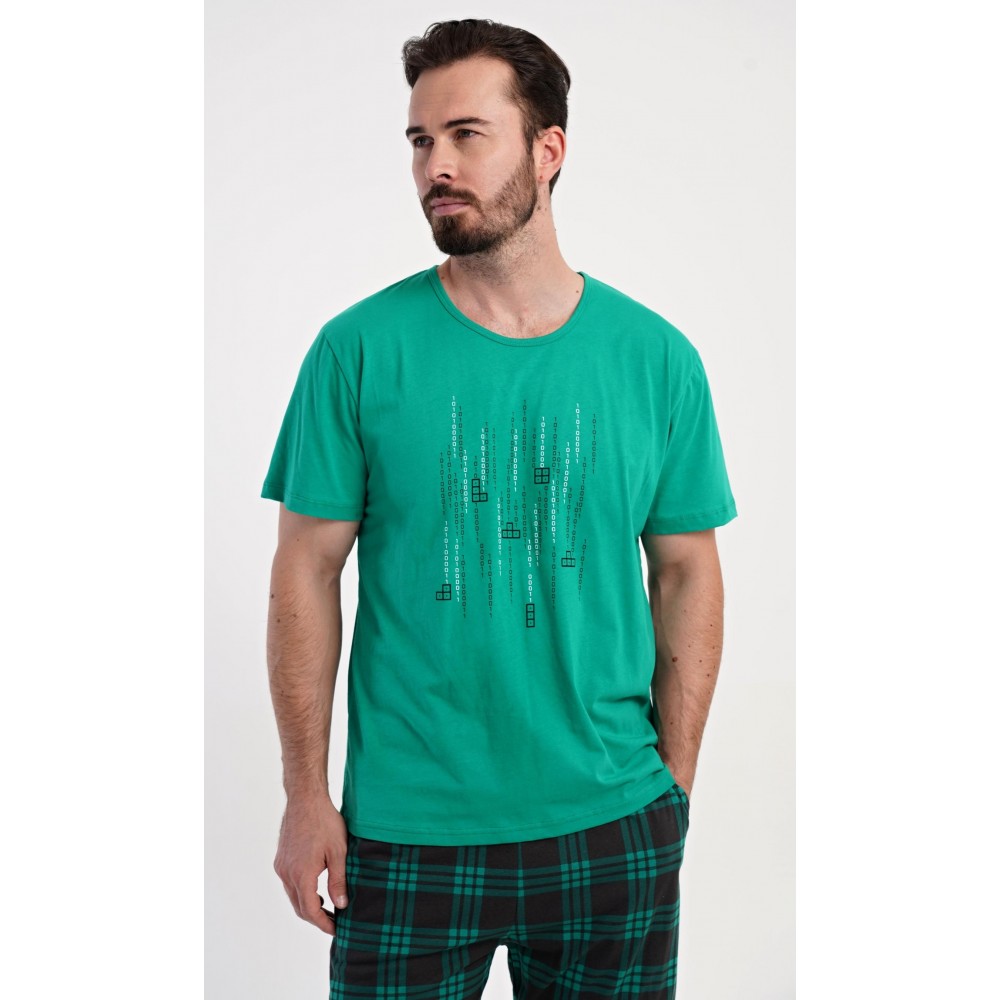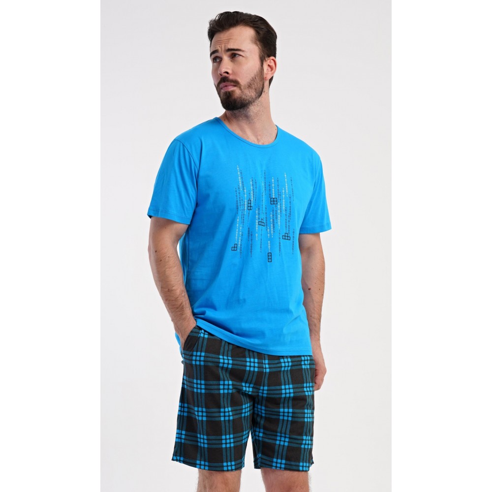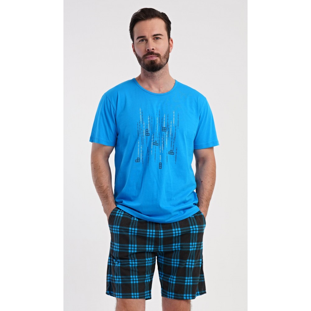 Pánské bavlněné šortkové pyžamo Tetris game. Pánské pyžamo se skládá z trička s krátkým rukávem a krátkých šortkových kalhot. Tričko s kulatým výstřihem zdobí na hrudi obrázek hry Tetris. Tričko doplňují kárované šortky, které mají v pase gumu, šňůrku na stažení a praktické kapsy. Použitý materiál s obsahem bavlny 100% je příjemný a poddajný na dotek.