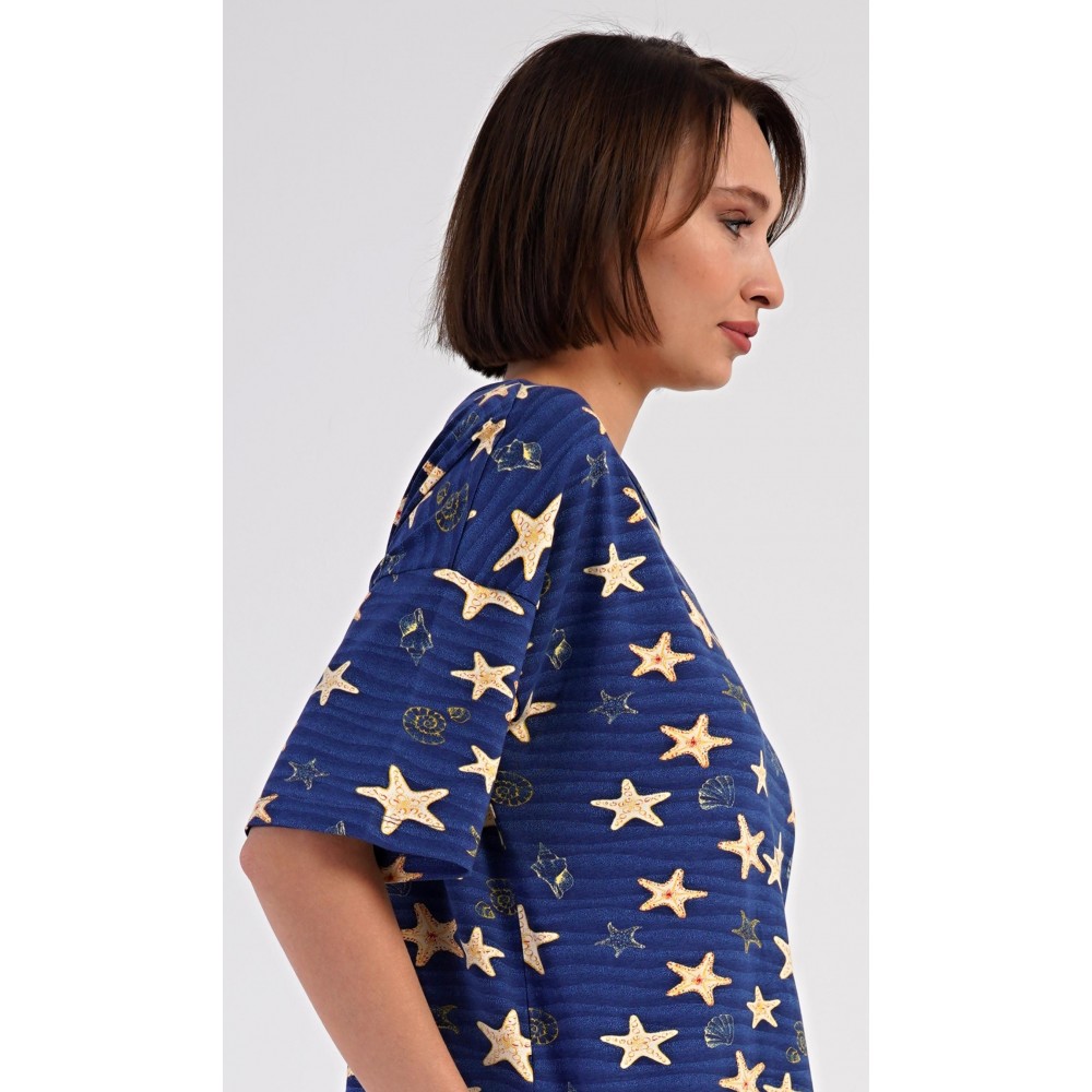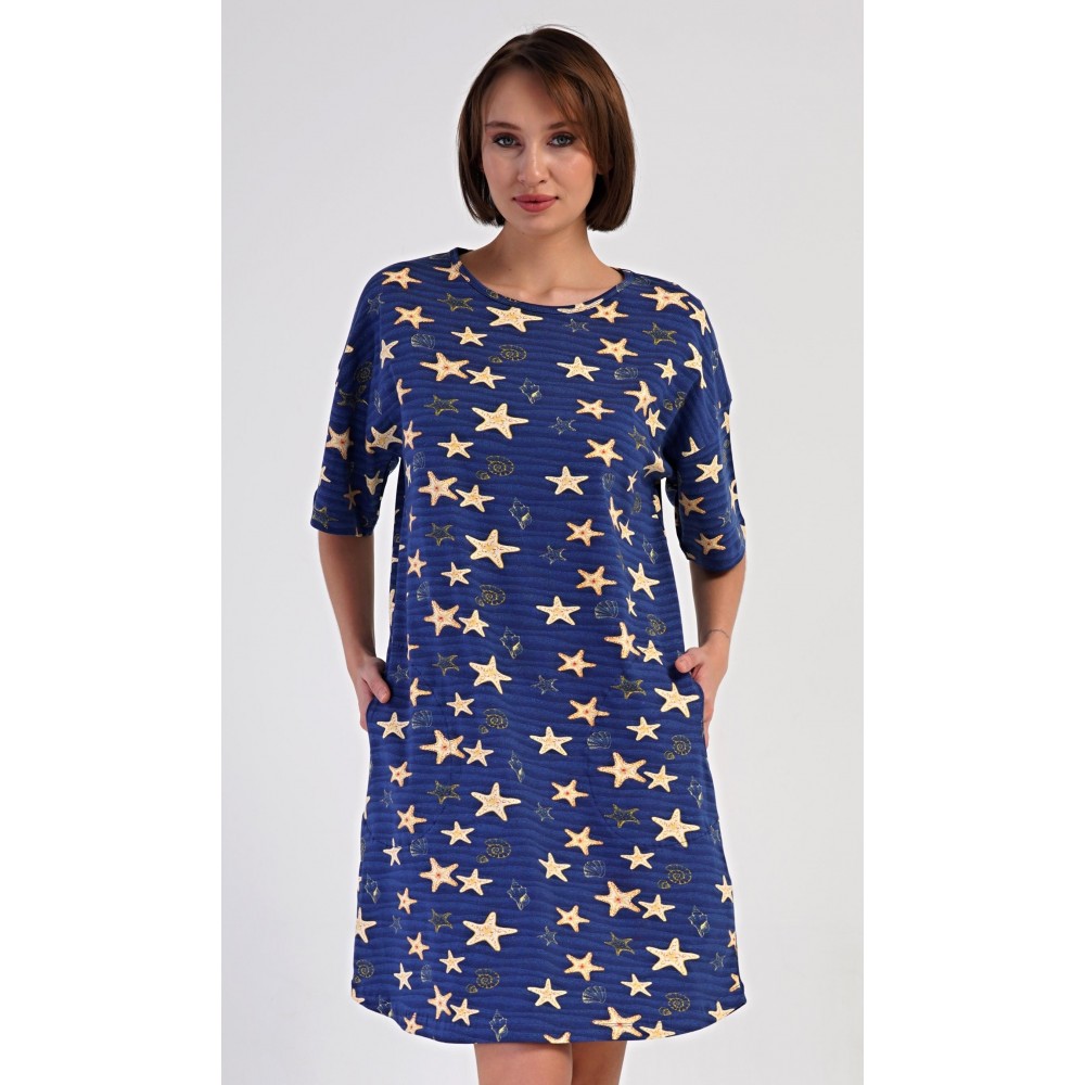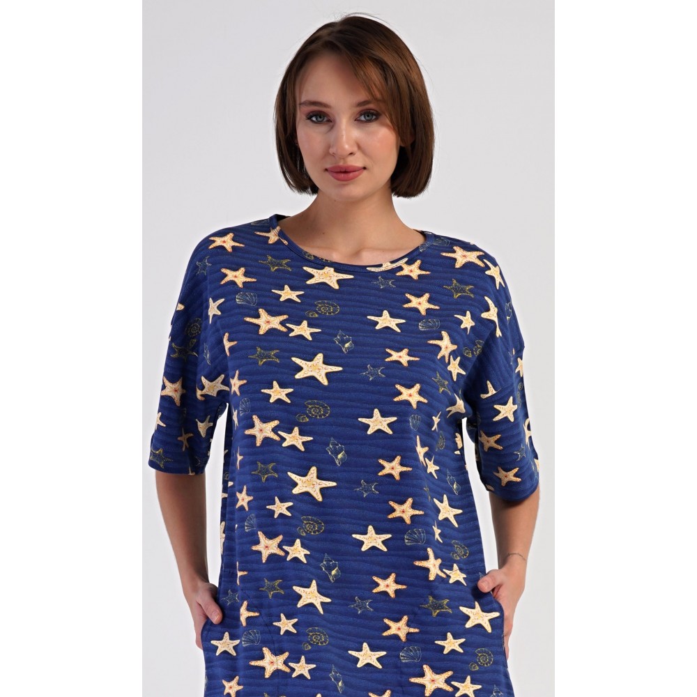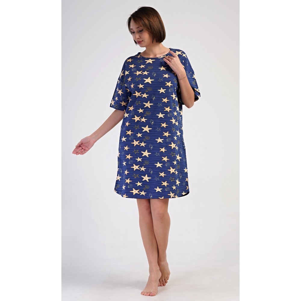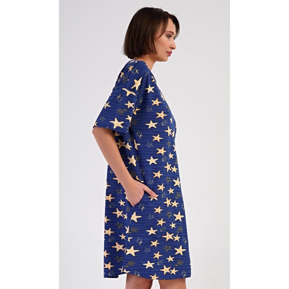 Dámské bavlněné domácí šaty se spadeným rukávem Hvězdy. Domácí bavlněné šaty s kulatým výstřihem a kapsami zdobí žluté hvězdy. Použitý bavlněný materiál s příměsí lycry je příjemný a poddajný na dotek.
