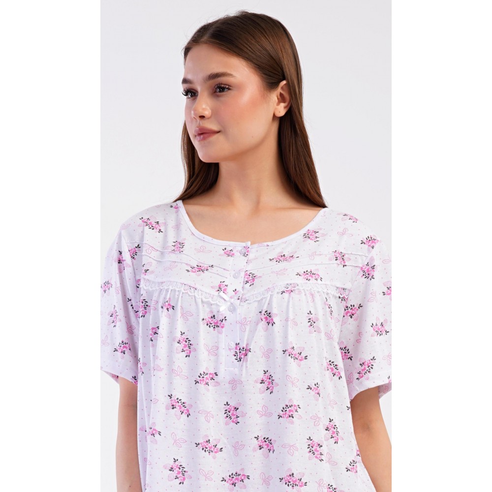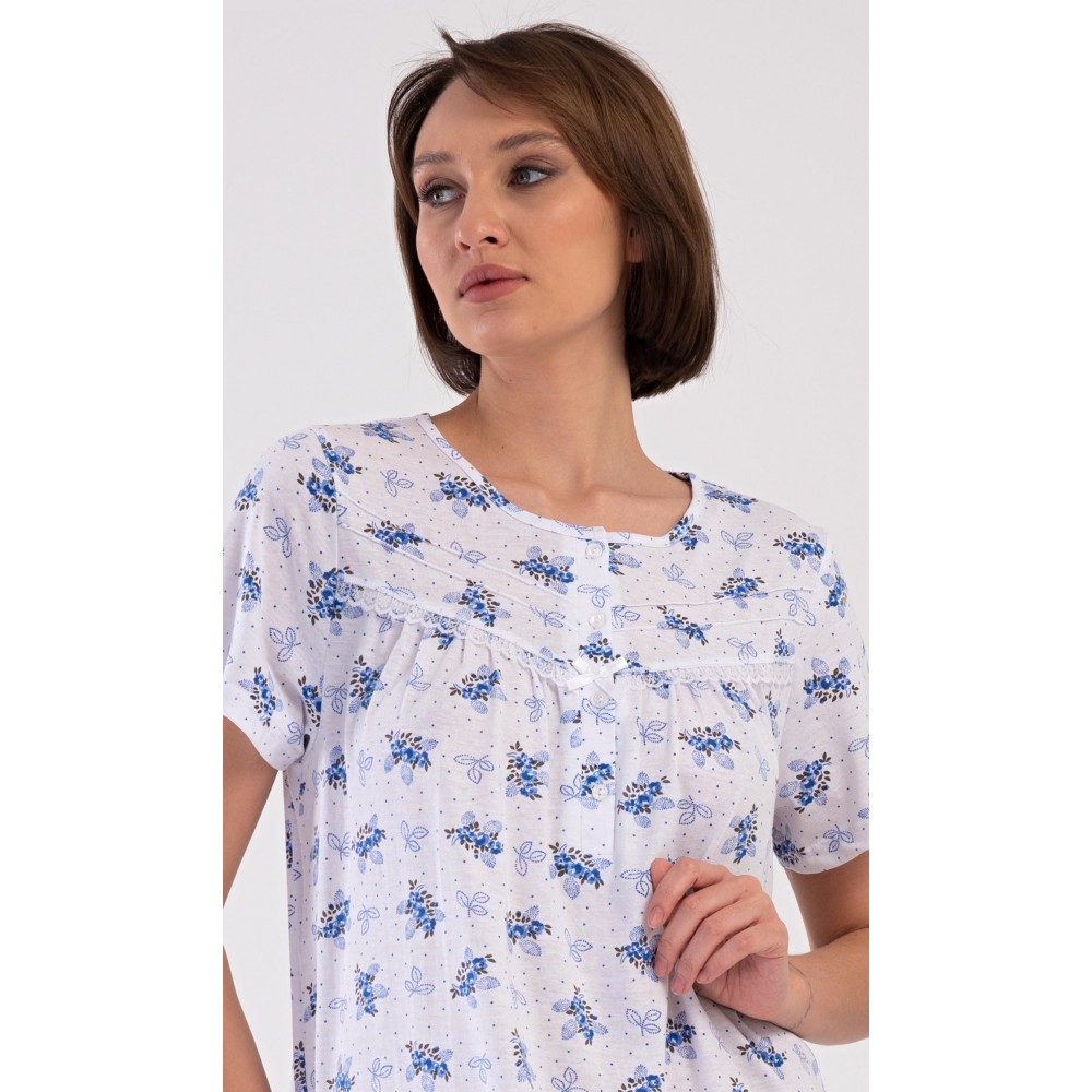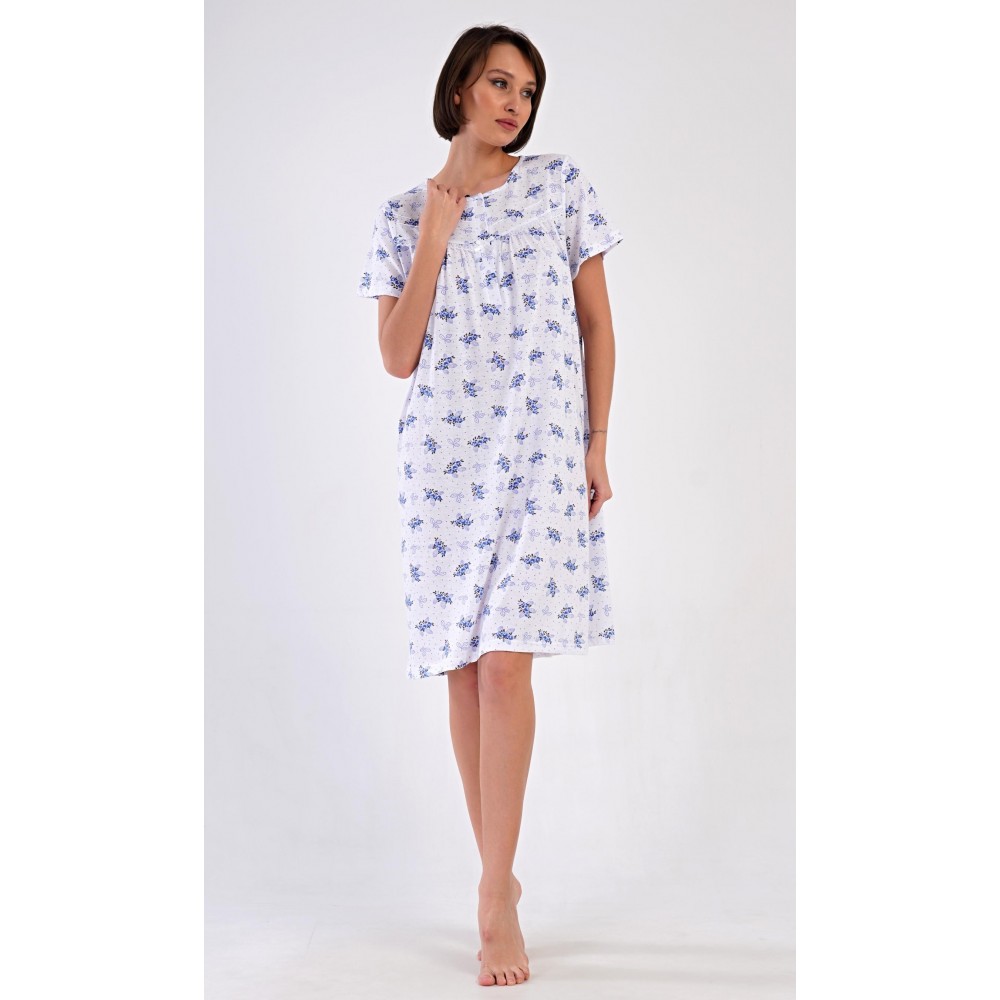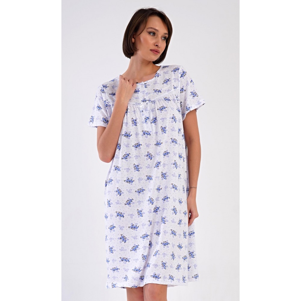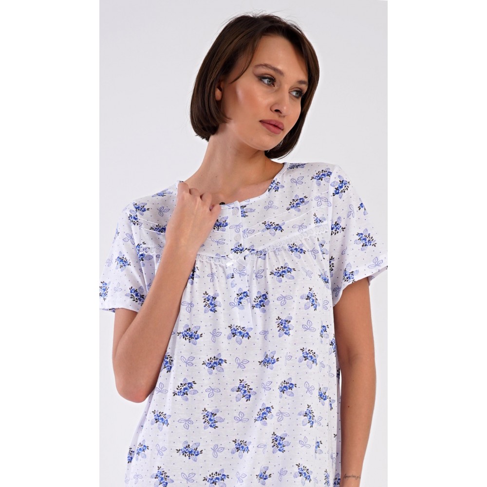 Dámská bavlněná noční košile s krátkým rukávem Vanda. Dámská noční košile v příjemné délce po kolena má kulatý výstřih se zapínáním na knoflíky a ozdobnou krajku. Celá košile je potištěna květy. Použitý bavlněný materiál je příjemný a poddajný na dotek.