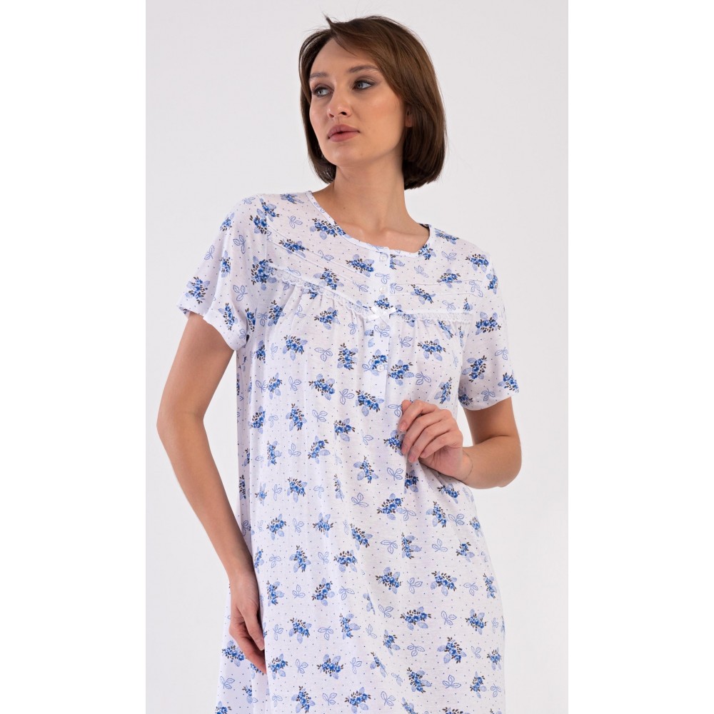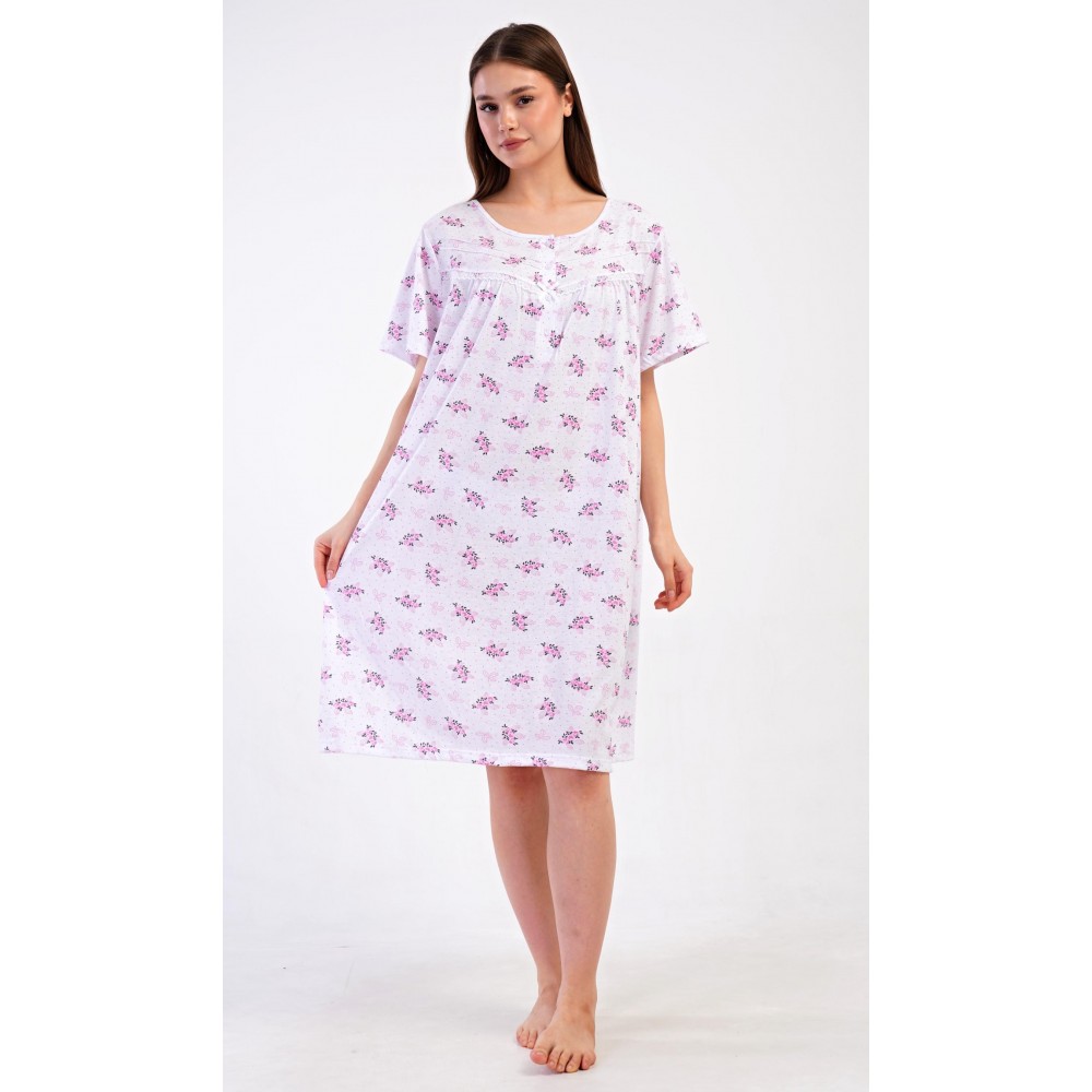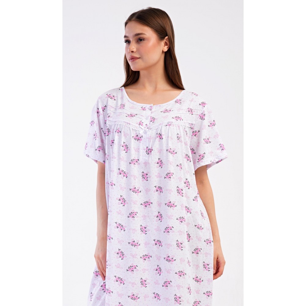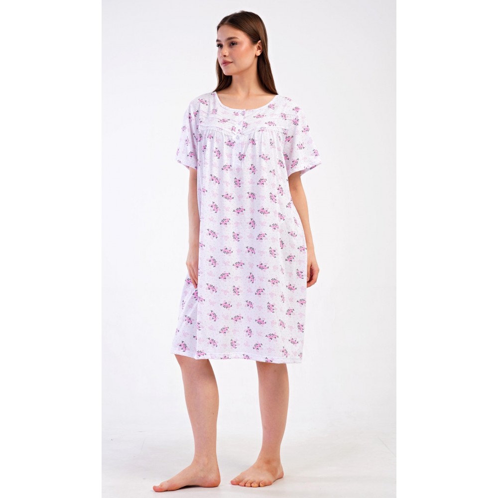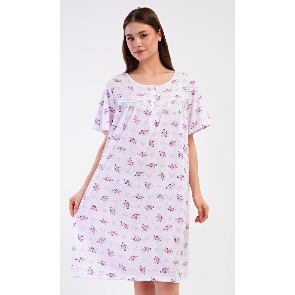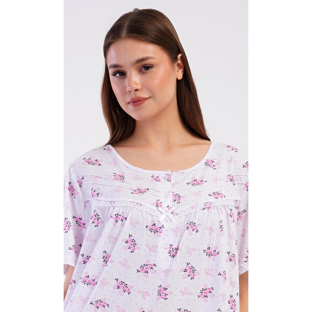 Dámská bavlněná noční košile s krátkým rukávem Vanda. Dámská noční košile v příjemné délce po kolena má kulatý výstřih se zapínáním na knoflíky a ozdobnou krajku. Celá košile je potištěna květy. Použitý bavlněný materiál je příjemný a poddajný na dotek.