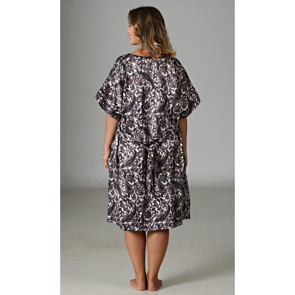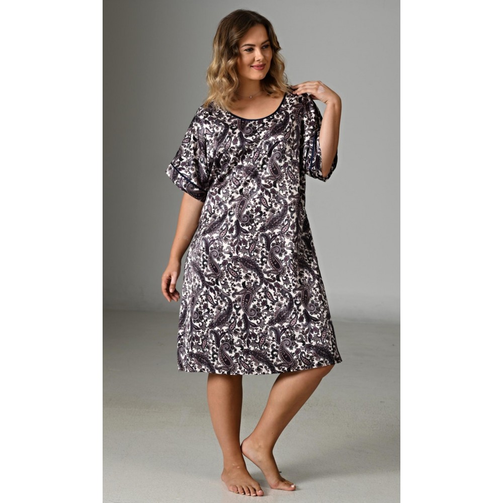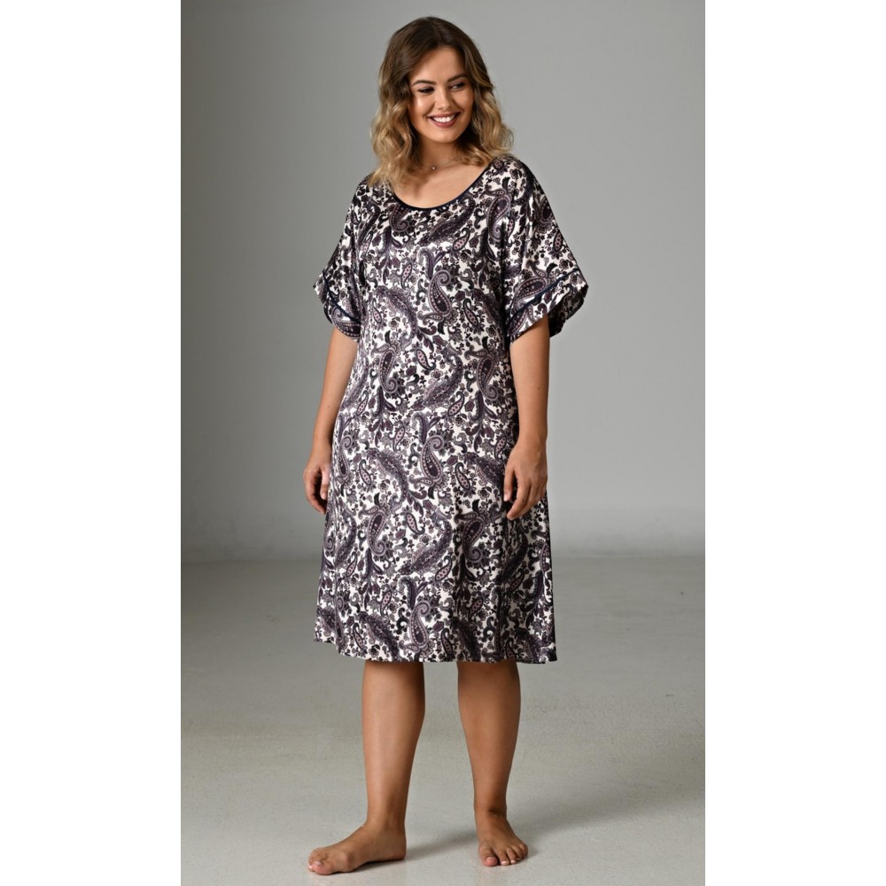 Dámská saténová noční košile s krátkým rukávem Orient. Noční košile s orientálními motivy a příjemnou délkou pod kolena má kulatý výstřih a pásek na stáhnutí. Rukávy jsou ozvláštněny lemovkou. Použitý saténový materiál je příjemný a poddajný na dotek.