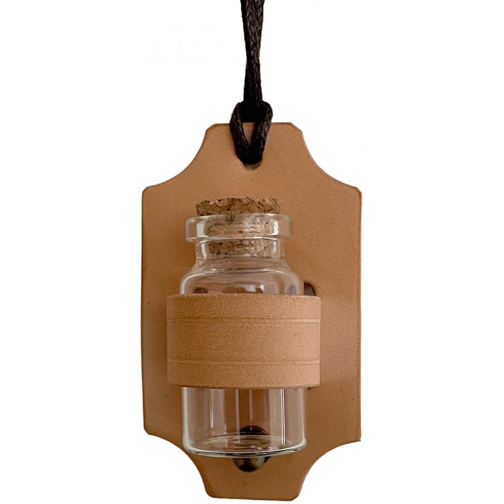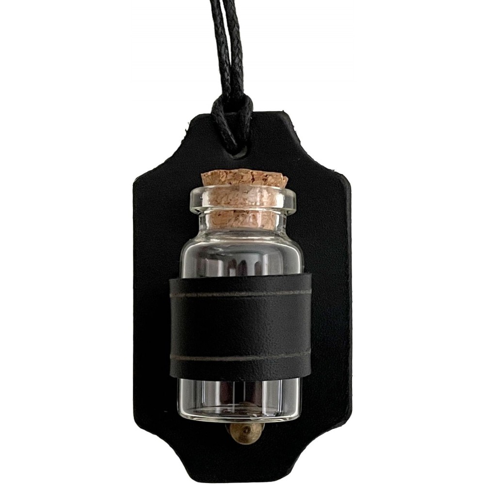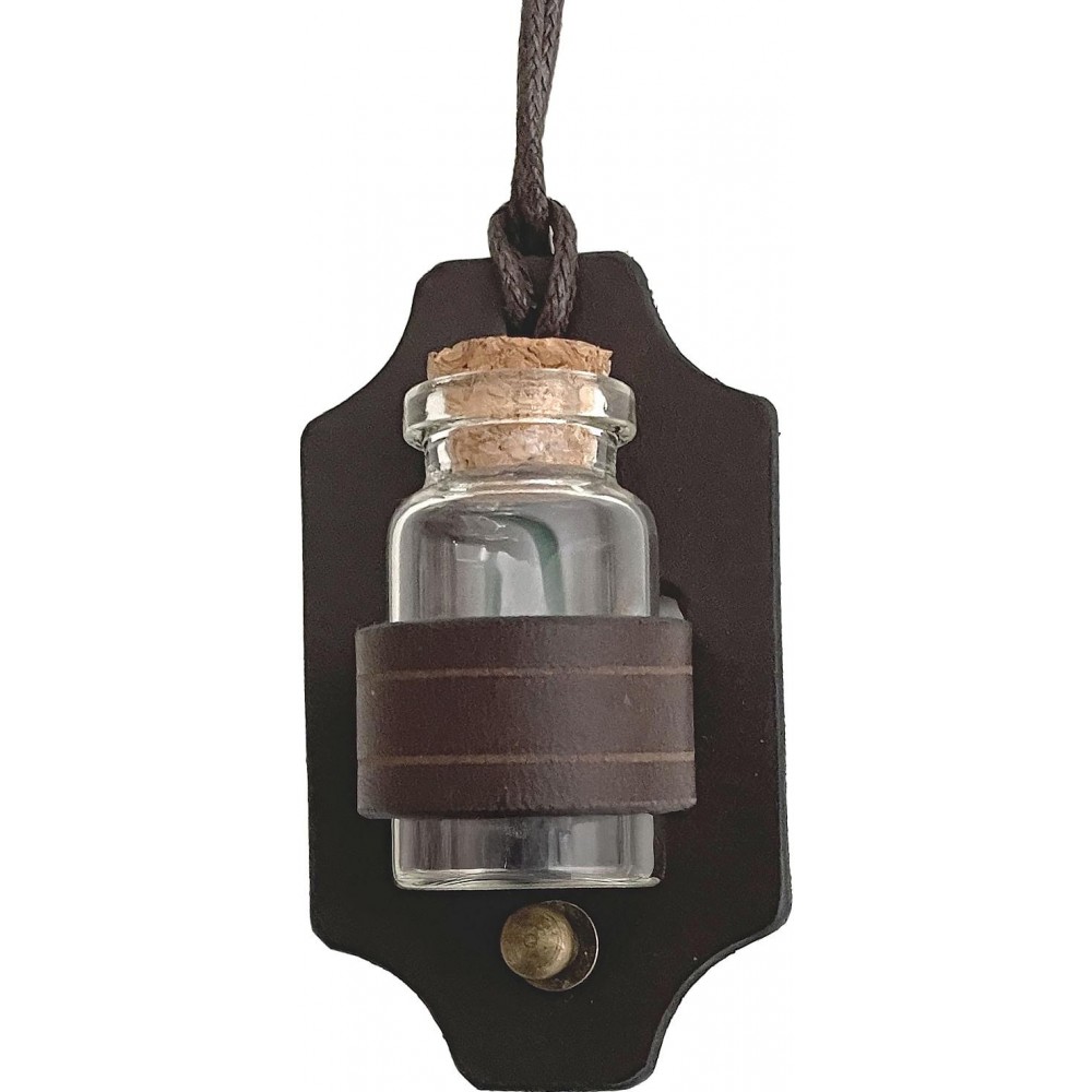 Ať už jsi alchymista, čaroděj, léčitelka nebo temný žoldák, bez své věrné lahvičky nevyrazíš do světa. Tento ručně vyrobený kožený závěs s malou skleněnou lahvičkou je perfektní doplněk ke každému fantasy nebo historickému kostýmu. Lahvičku zavěšenou na kožené šňůrce si můžeš nosit na krku, nebo na opasku. A co do ní dáš? Elixír života, jed na čepel, dračí krev… Fantazii se meze nekladou! Závěs o rozměru 7 x 4 cm je vyroben z kvalitní hovězí kůže u nás v imago dílně – ručně barvený a šitý. Skleněnou lahvičku o velikosti 4 cm s korkem drží pevně a bezpečně! Na výběr máš ze 3 barev: přírodní, černá a hnědá.