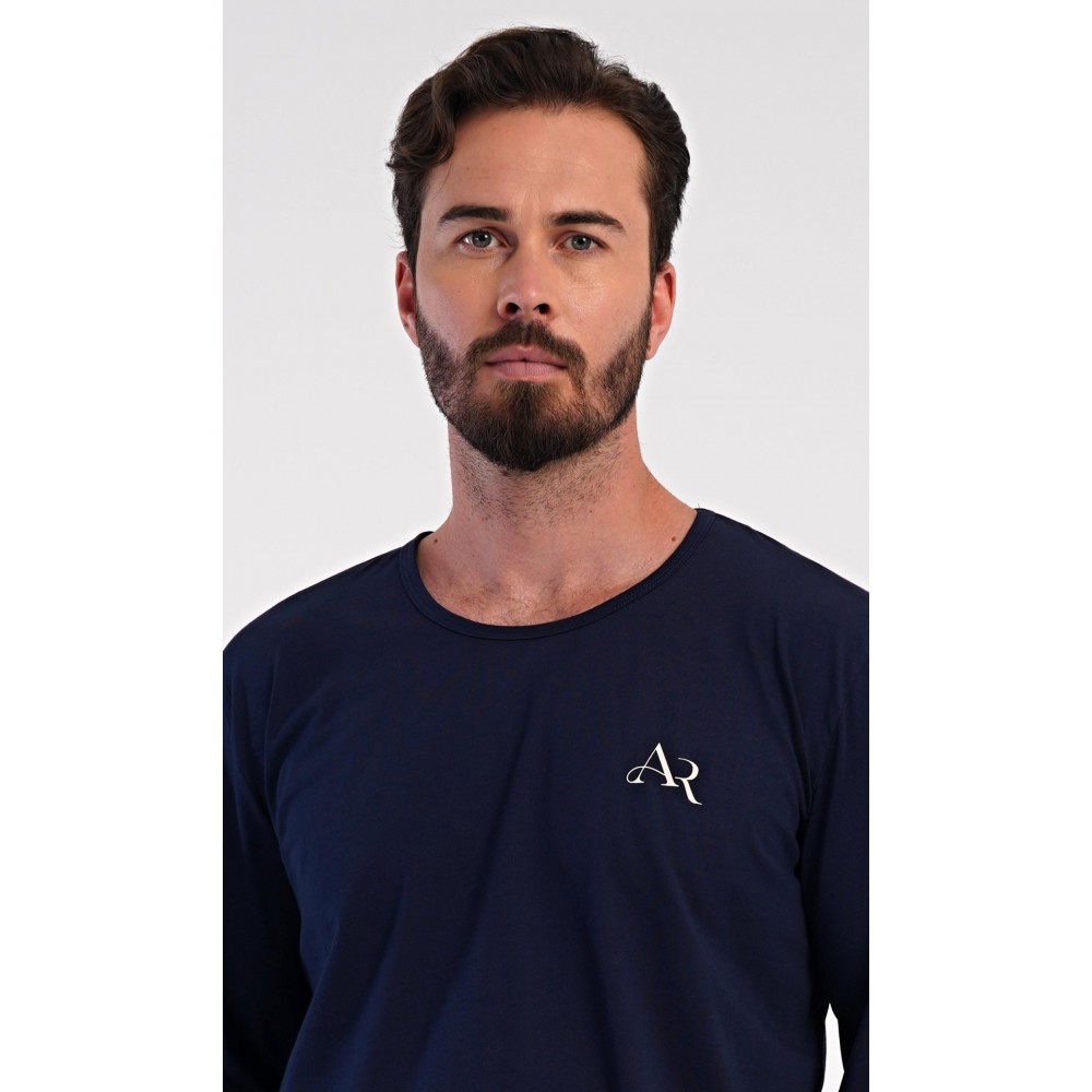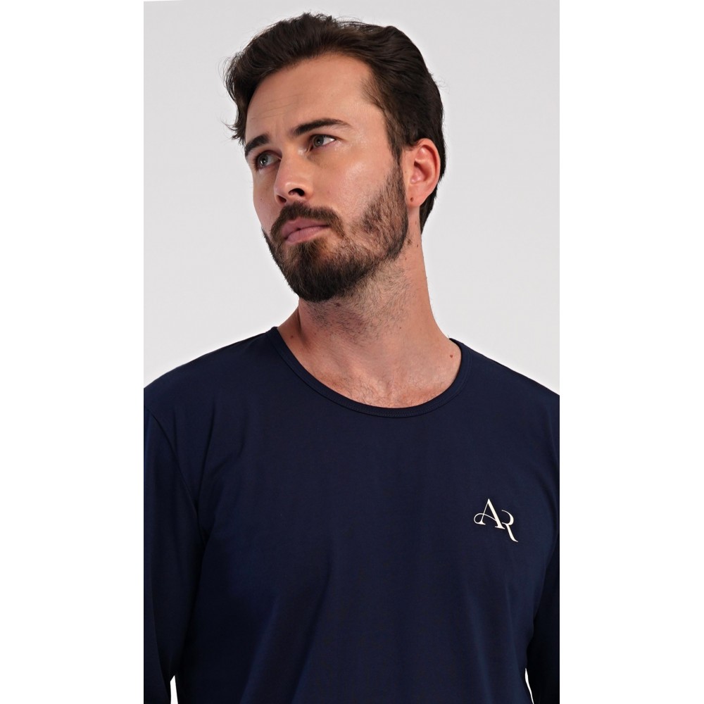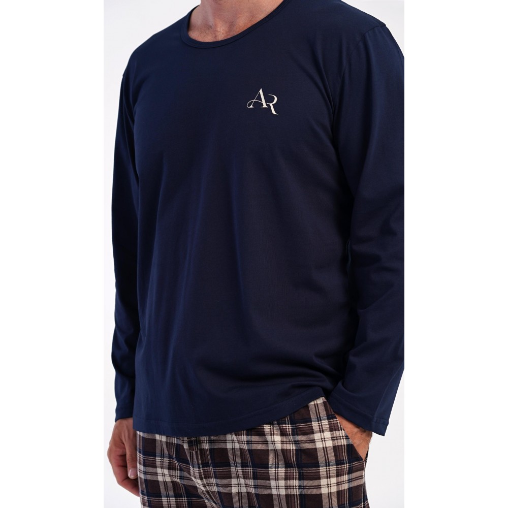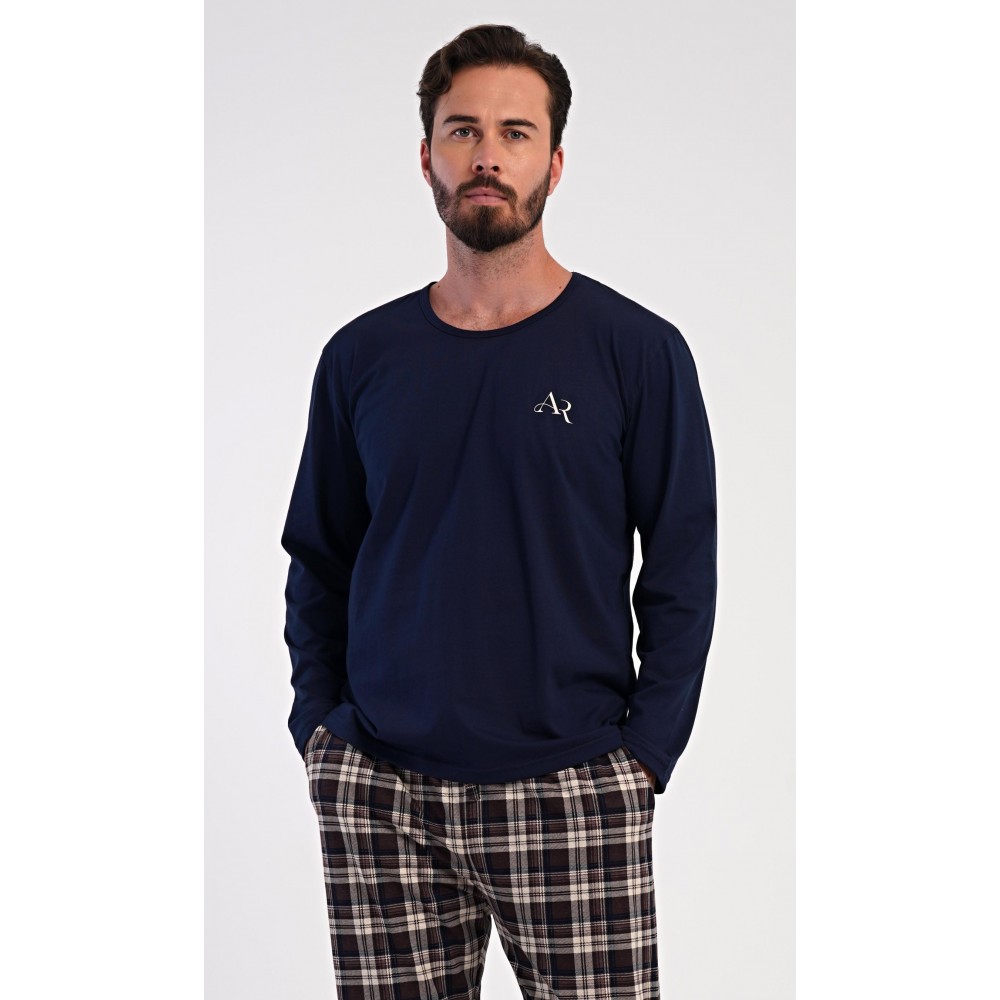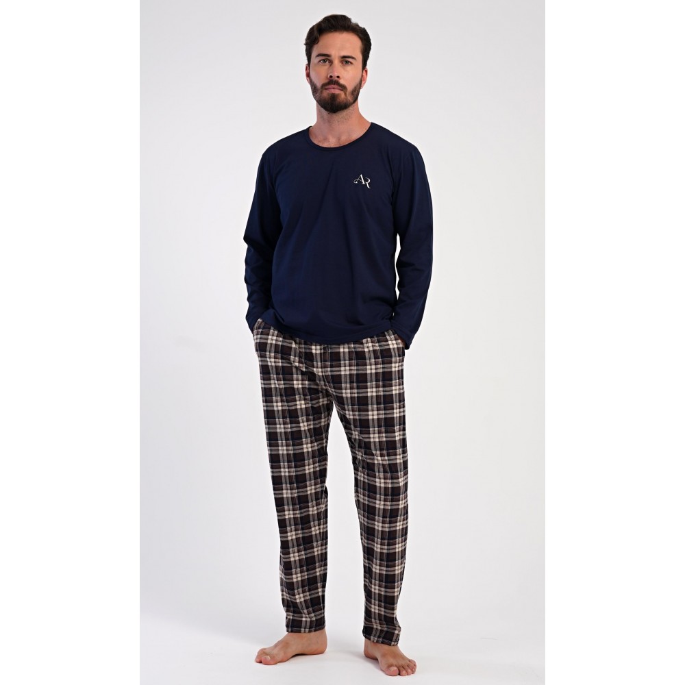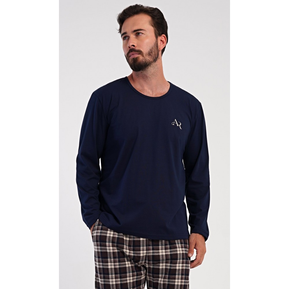 Pánské dlouhé bavlněné pyžamo Armando. Pánské pyžamo se skládá z trika s dlouhým rukávem a dlouhých kalhot. Triko je jednobarevné, zdobené na hrudi drobným obrázkem. Kostkované kalhoty mají v pase gumu, šňůrku na stažení a praktické kapsy. Použitý materiál s obsahem bavlny 100% je poddajný a příjemný na dotek.