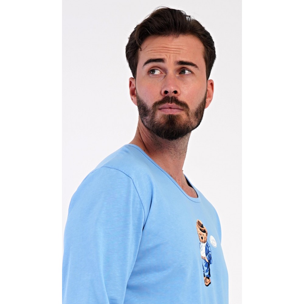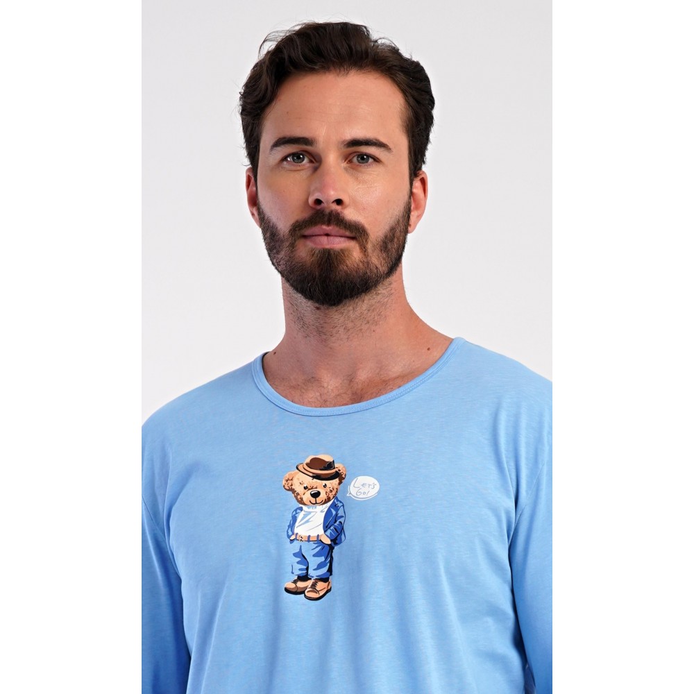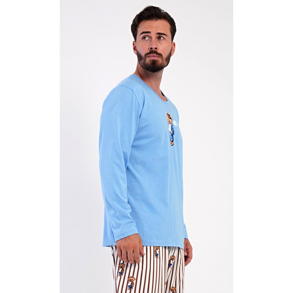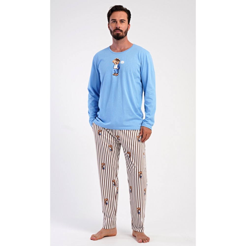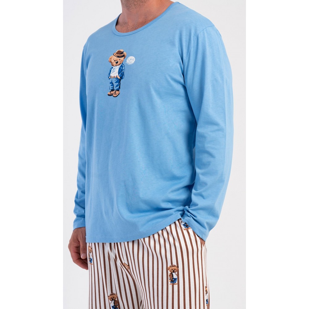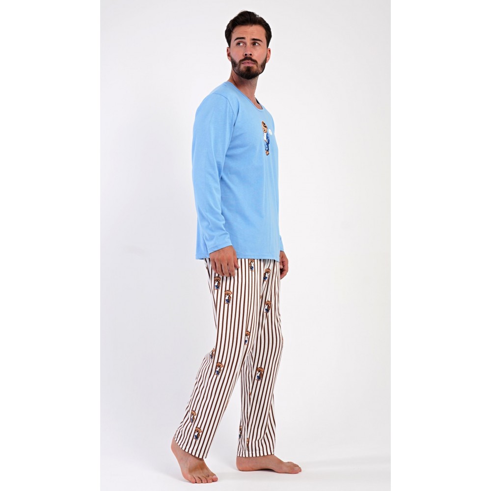 Pánské dlouhé bavlněné pyžamo Bear. Pánské pyžamo se skládá z trika s dlouhým rukávem a dlouhých kalhot. Triko je jednobarevné, zdobené na hrudi obrázkem medvídka. Tento motiv se opakuje i na proužkovaných kalhotách, které mají v pase gumu, šňůrku na stažení a praktické kapsy. Použitý materiál s obsahem bavlny 100% je poddajný a příjemný na dotek.