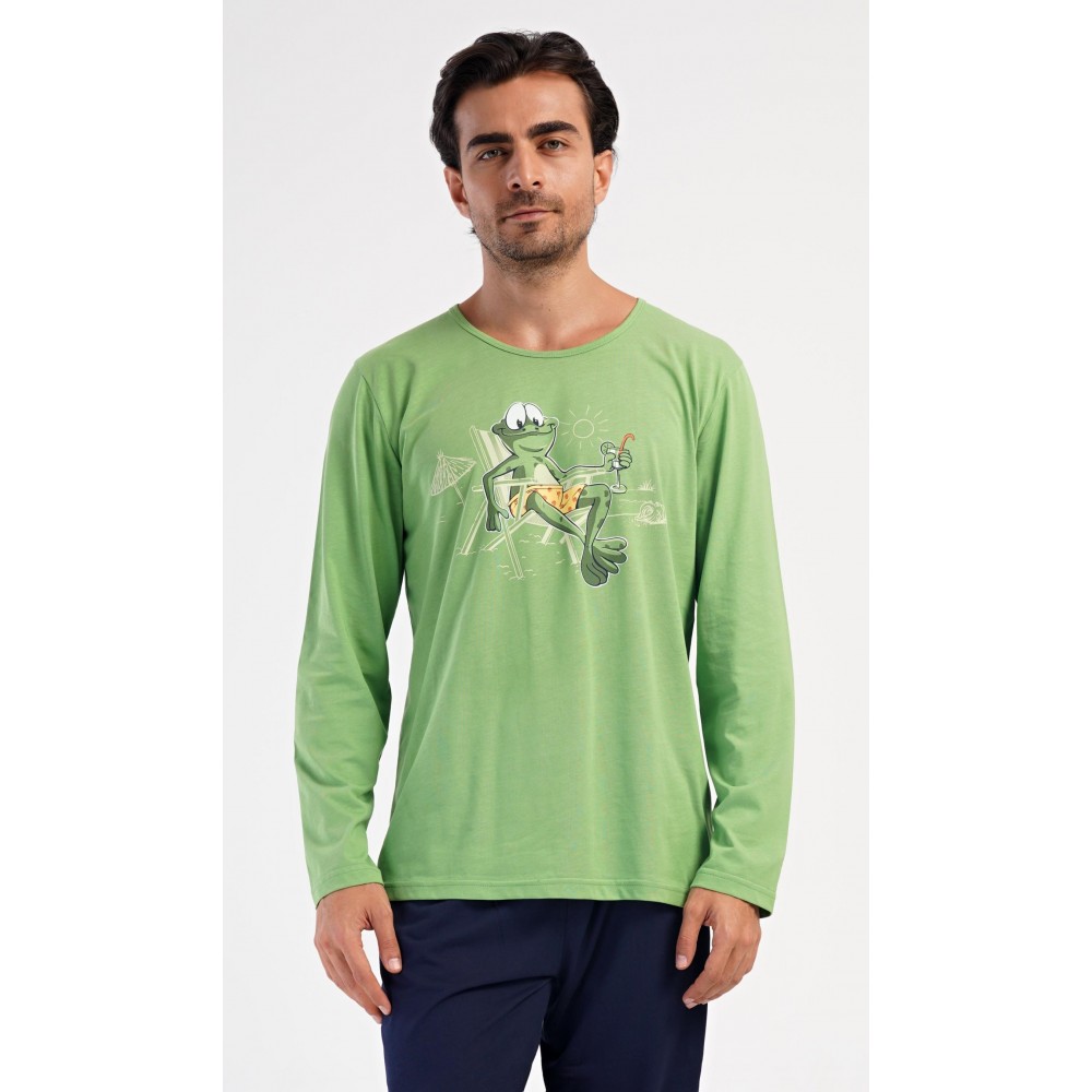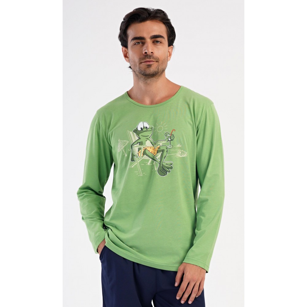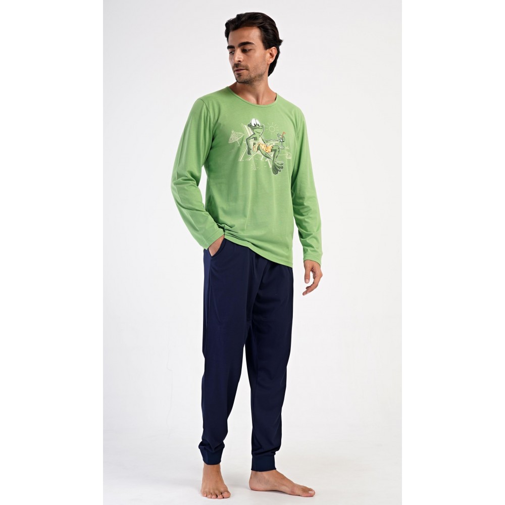 Pánské dlouhé bavlněné pyžamo No stress. Pánské pyžamo se skládá z trika s dlouhým rukávem a dlouhých kalhot, které jsou zakončeny lemy. Triko s kulatým výstřihem zdobí na hrudi obrázek žabáka. Jednobarevné kalhoty mají v pase gumu, šňůrku na stažení a praktické kapsy. Použitý materiál s obsahem bavlny 100% je poddajný a příjemný na dotek.