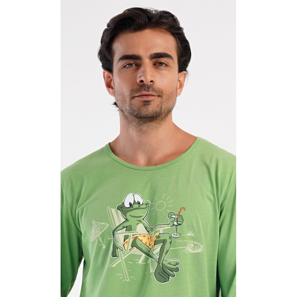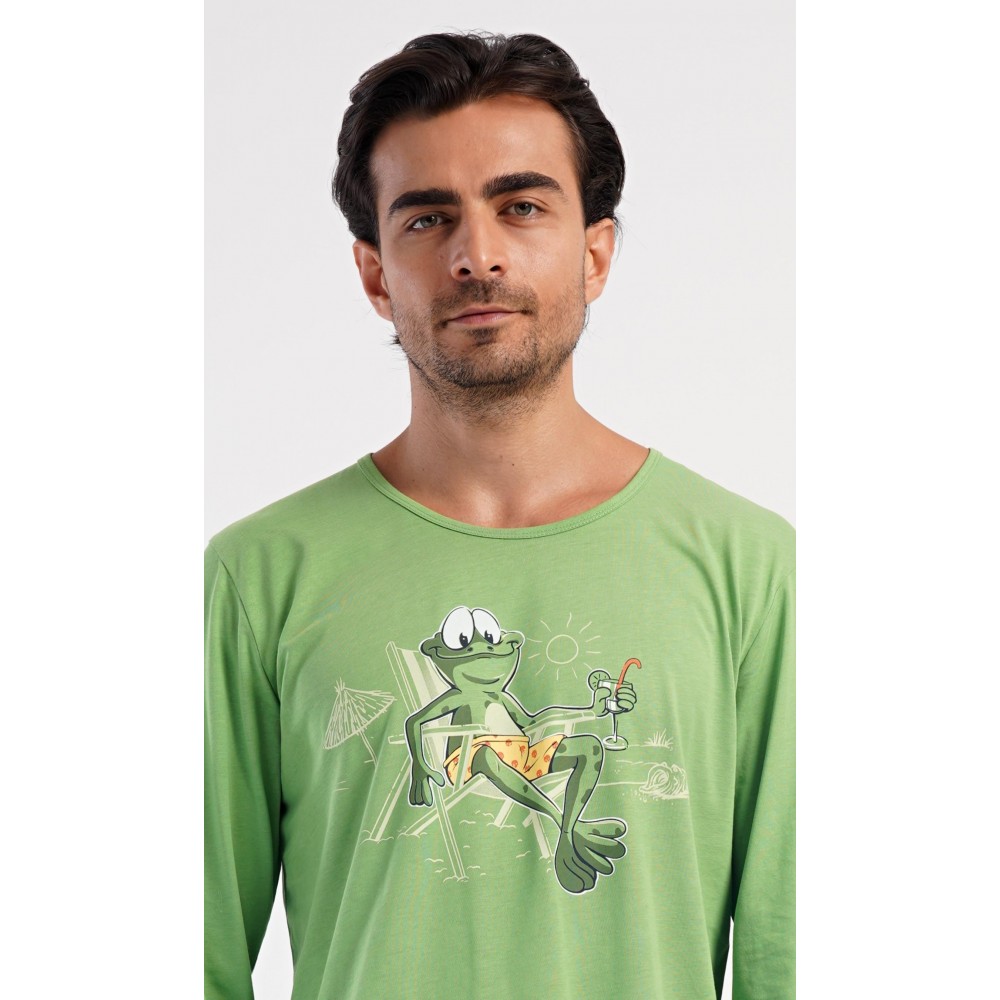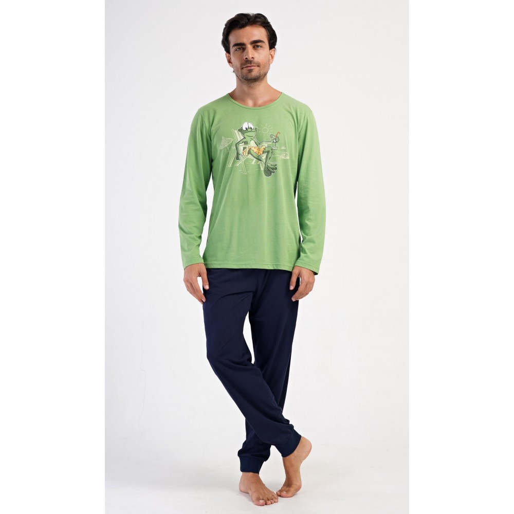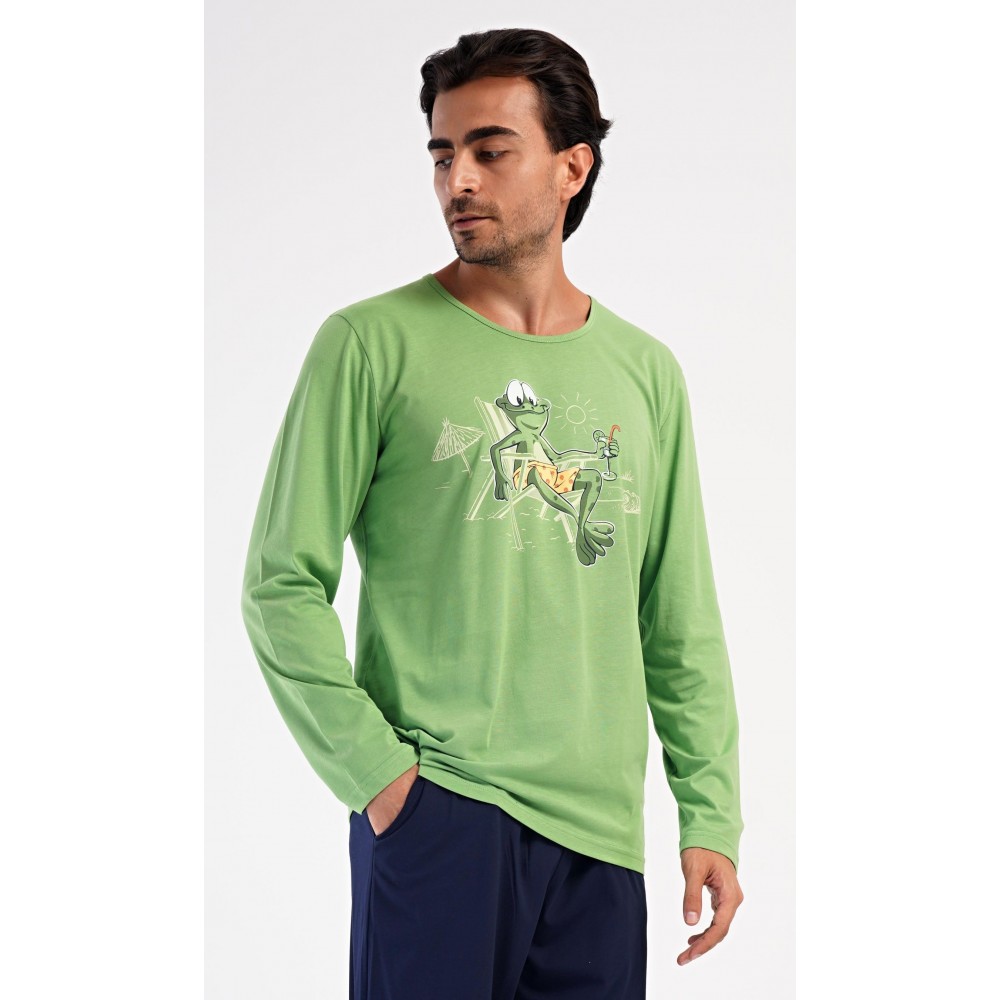 Pánské dlouhé bavlněné pyžamo No stress. Pánské pyžamo se skládá z trika s dlouhým rukávem a dlouhých kalhot, které jsou zakončeny lemy. Triko s kulatým výstřihem zdobí na hrudi obrázek žabáka. Jednobarevné kalhoty mají v pase gumu, šňůrku na stažení a praktické kapsy. Použitý materiál s obsahem bavlny 100% je poddajný a příjemný na dotek.