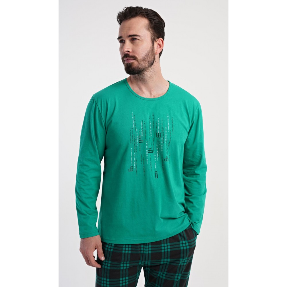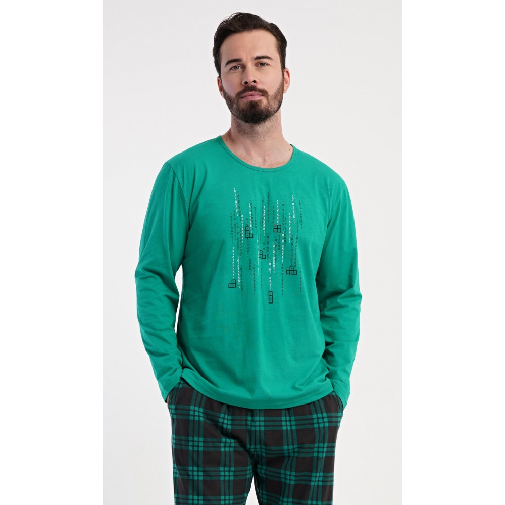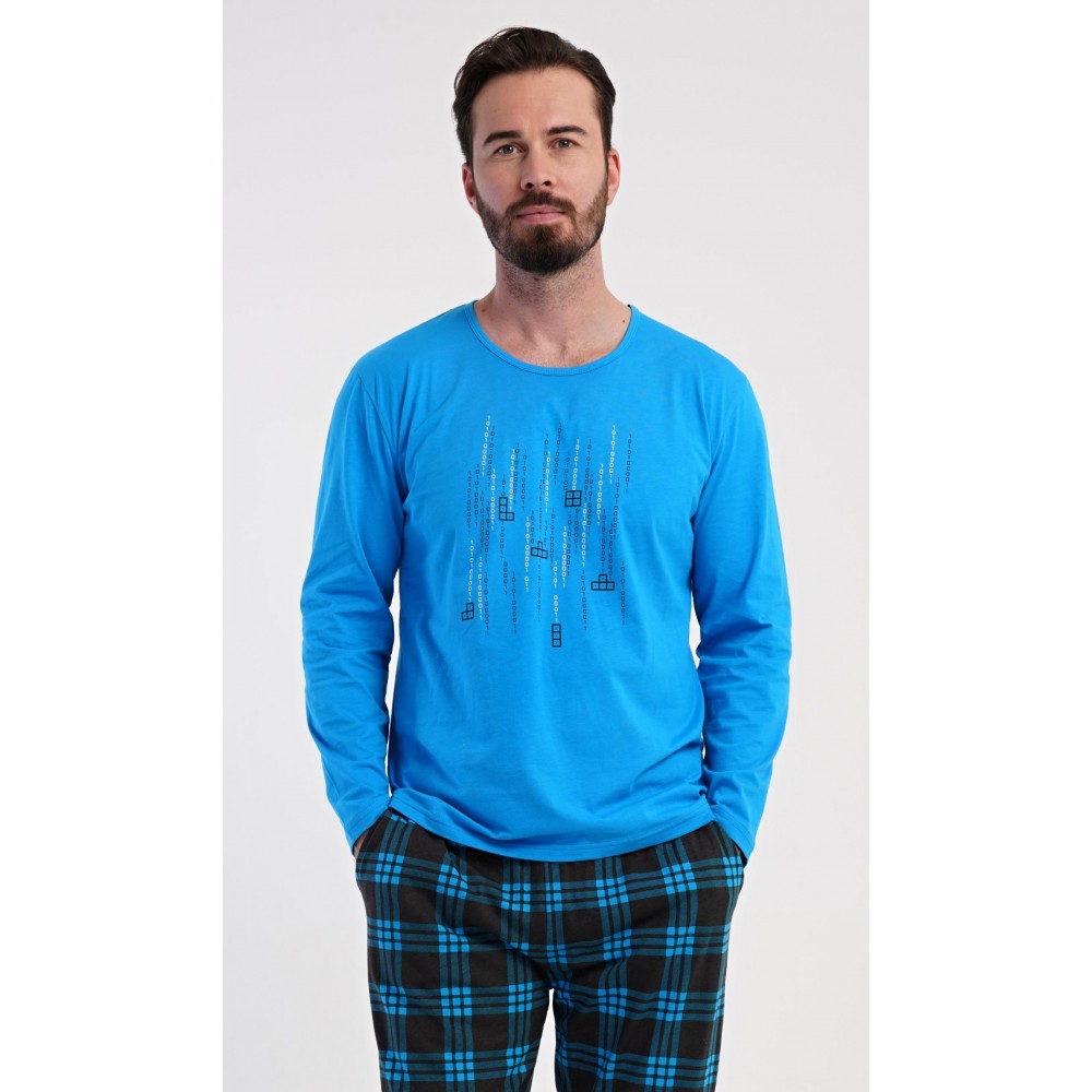 Pánské bavlněné pyžamo s dlouhým rukávem Tetris. Pánské pyžamo se skládá z trika s dlouhým rukávem a dlouhých kalhot. Triko s kulatým výstřihem zdobí na hrudi obrázek hry Tetris. Triko doplňují kárované kalhoty, které mají v pase gumu, šňůrku na stažení a praktické kapsy. Použitý materiál s obsahem bavlny 100% je příjemný a poddajný na dotek.