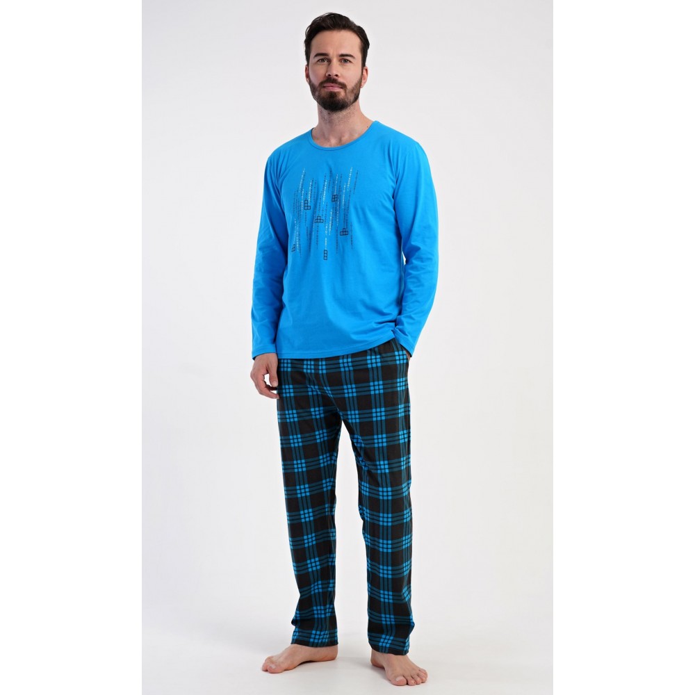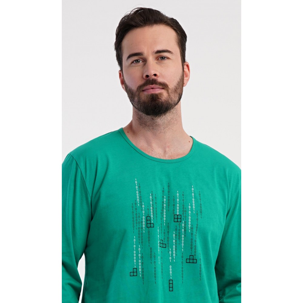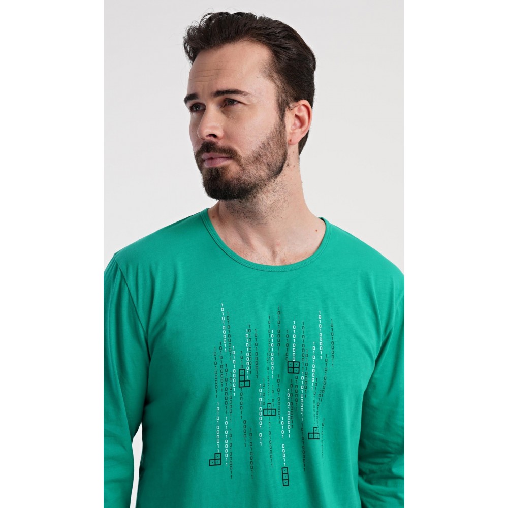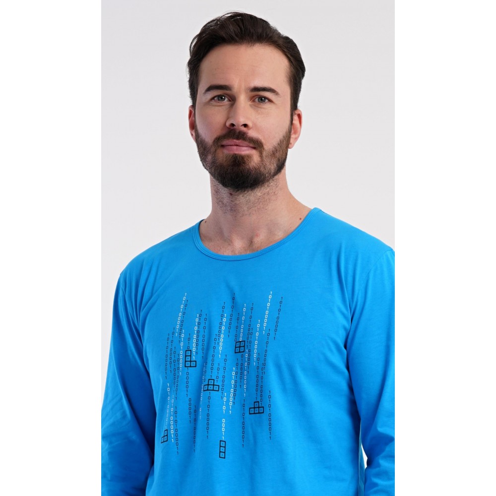 Pánské bavlněné pyžamo s dlouhým rukávem Tetris. Pánské pyžamo se skládá z trika s dlouhým rukávem a dlouhých kalhot. Triko s kulatým výstřihem zdobí na hrudi obrázek hry Tetris. Triko doplňují kárované kalhoty, které mají v pase gumu, šňůrku na stažení a praktické kapsy. Použitý materiál s obsahem bavlny 100% je příjemný a poddajný na dotek.