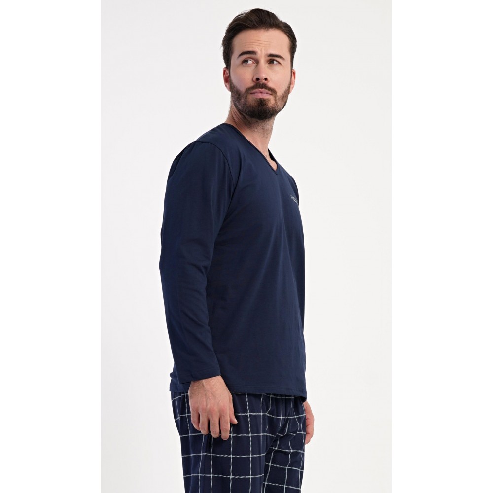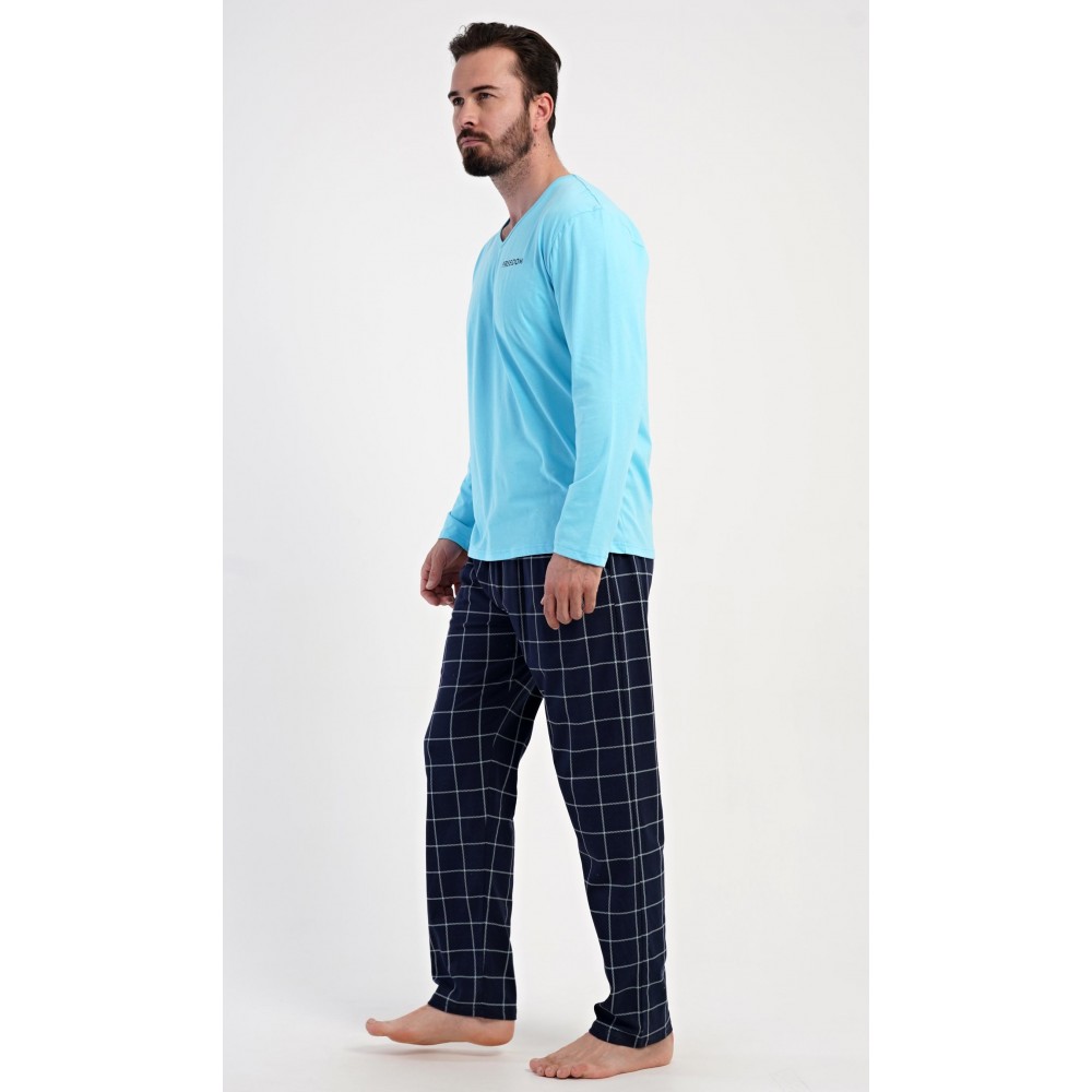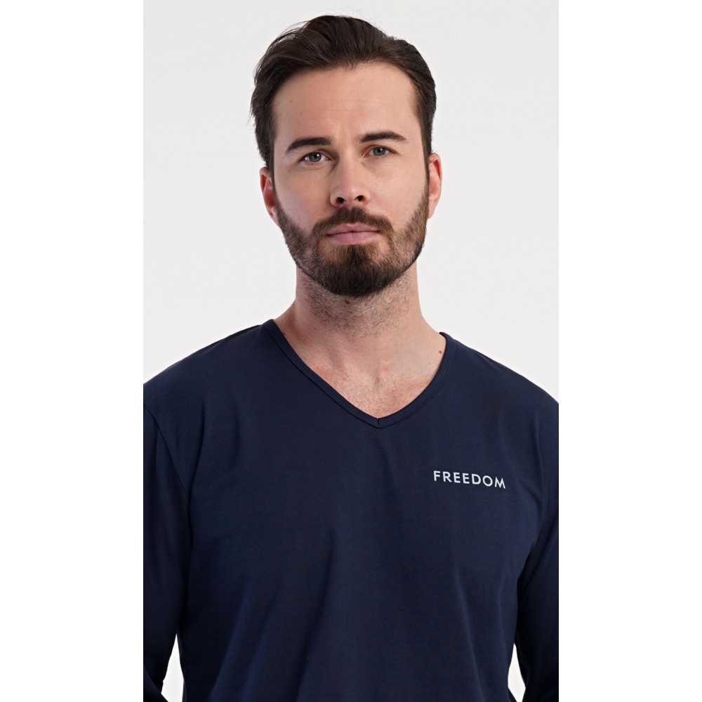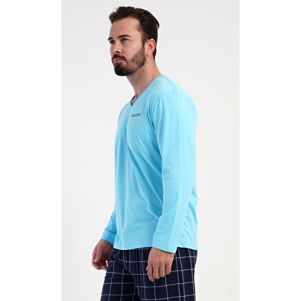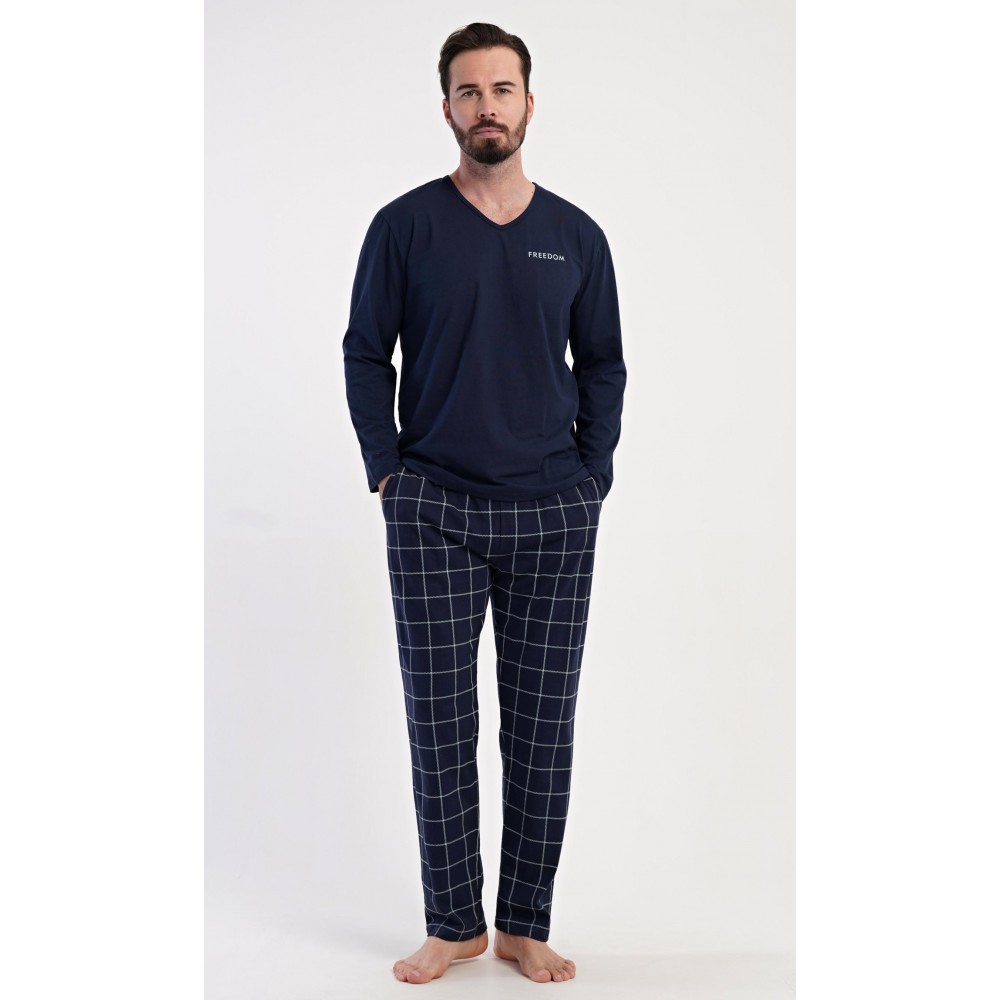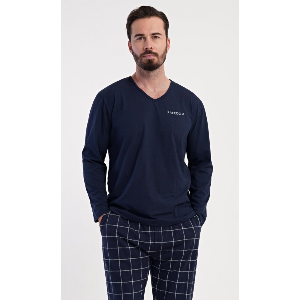 Pánské bavlněné pyžamo s dlouhým rukávem Daniel. Pánské pyžamo se skládá z trika s dlouhým rukávem a dlouhých kalhot. Triko s výstřihem do V zdobí na hrudi drobný nápis FREEDOM. Triko doplňují kárované kalhoty, které mají v pase gumu, šňůrku na stažení a praktické kapsy. Použitý materiál s obsahem bavlny 100% je příjemný a poddajný na dotek.