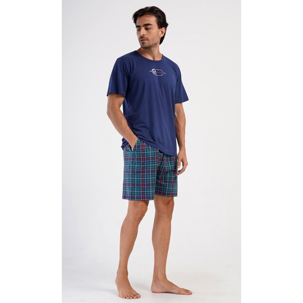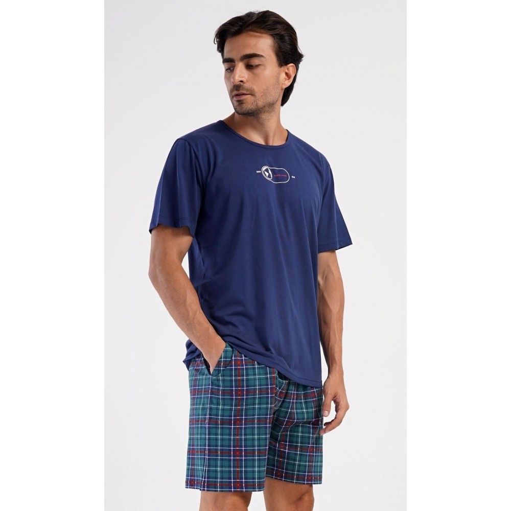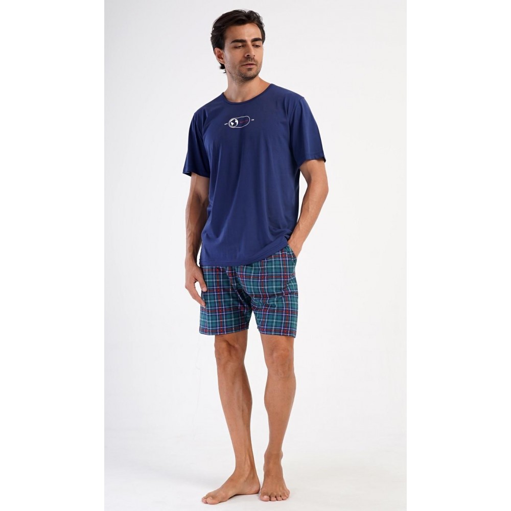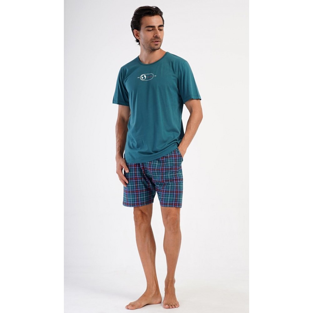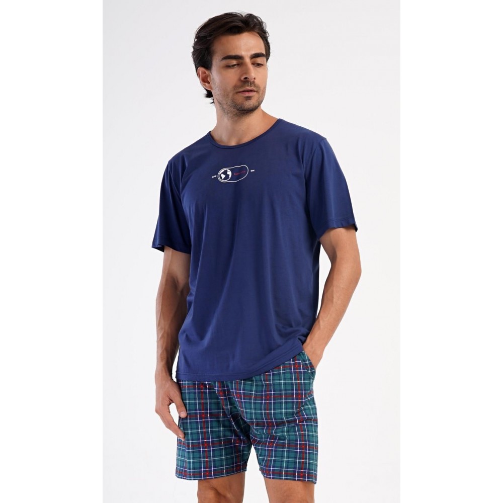 Pánské bavlněné šortkové pyžamo Tobias. Pánské pyžamo se skládá z trička s krátkým rukávem a krátkých šortkových kalhot. Tričko s kulatým výstřihem zdobí drobný obrázek zeměkoule. Tričko doplňují kárované šortky, které mají v pase gumu, šňůrku na stažení a praktické kapsy. Použitý materiál s obsahem bavlny 100% je příjemný a poddajný na dotek.