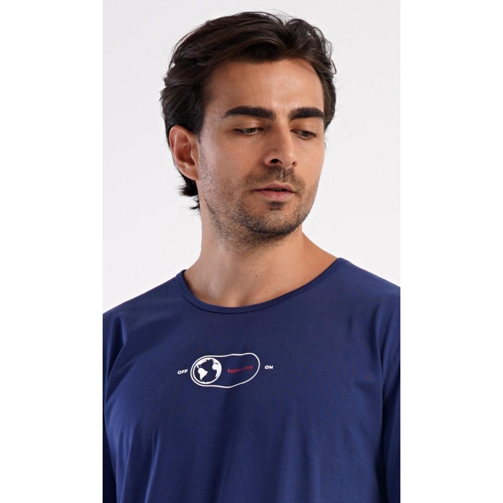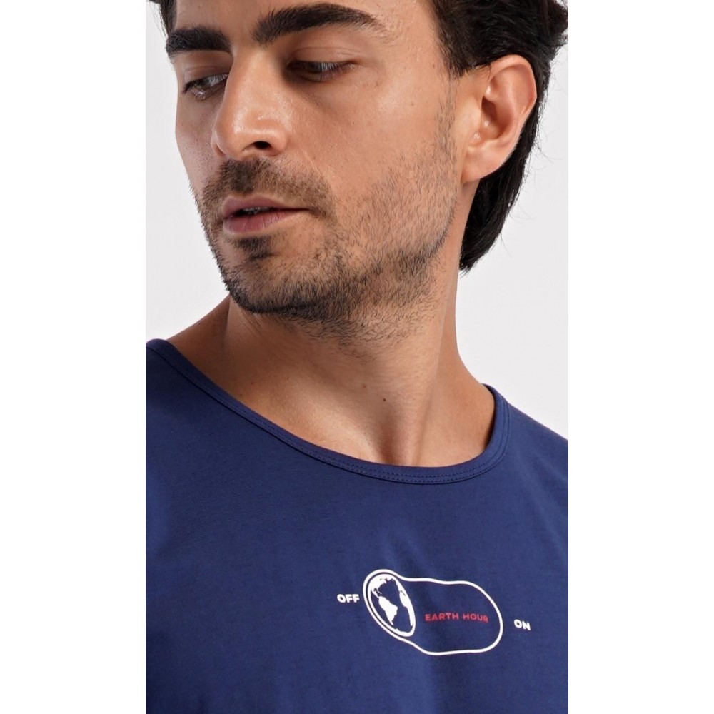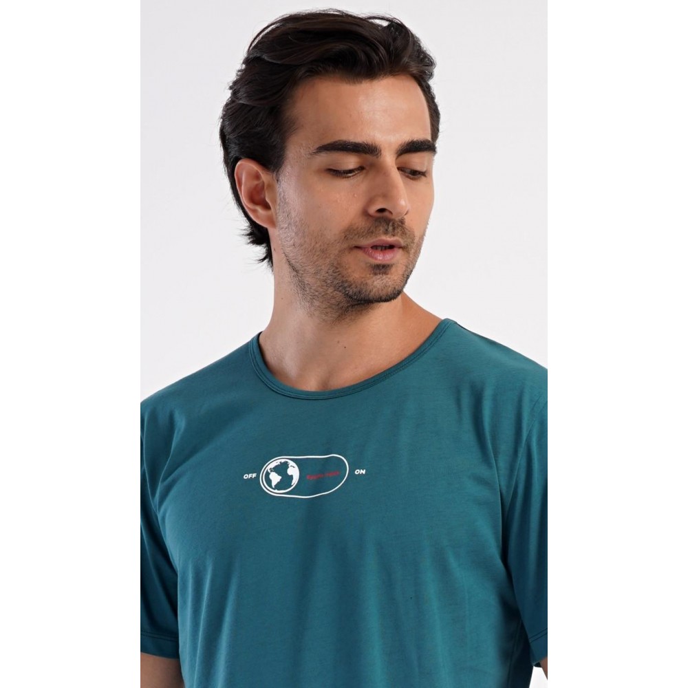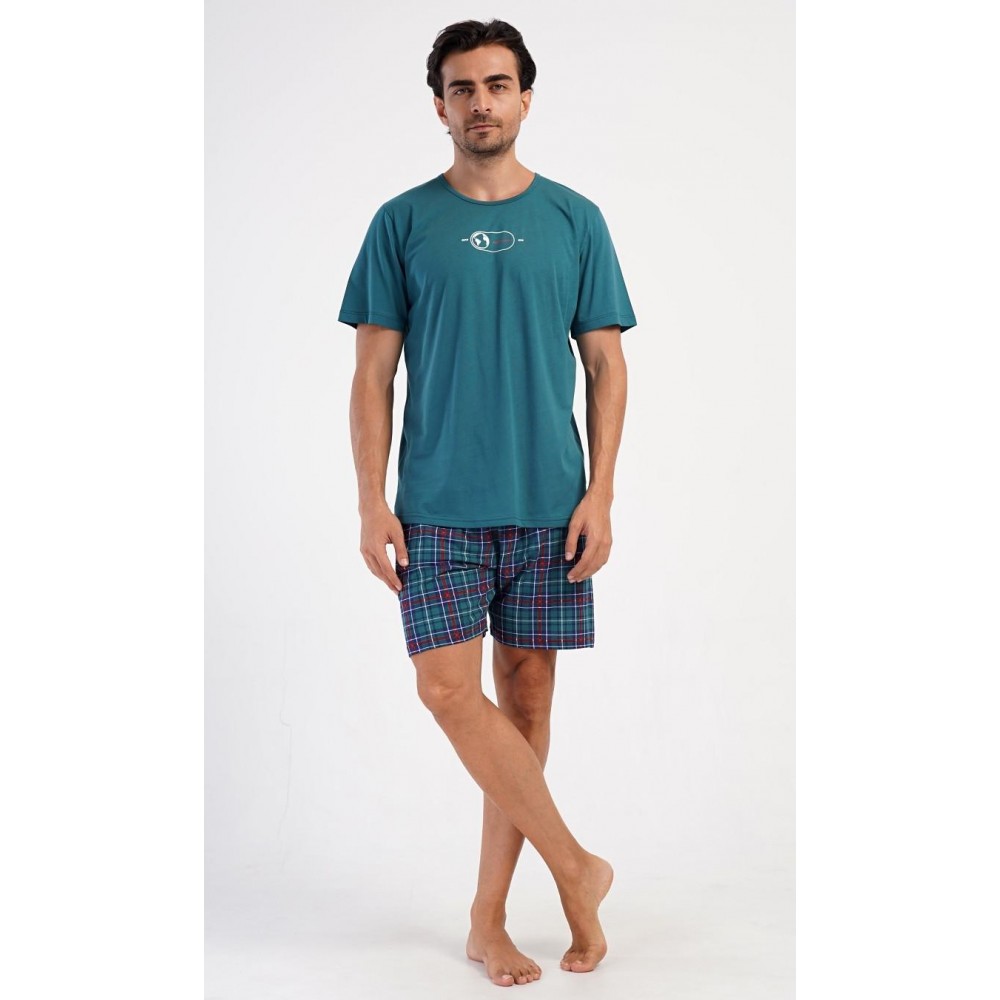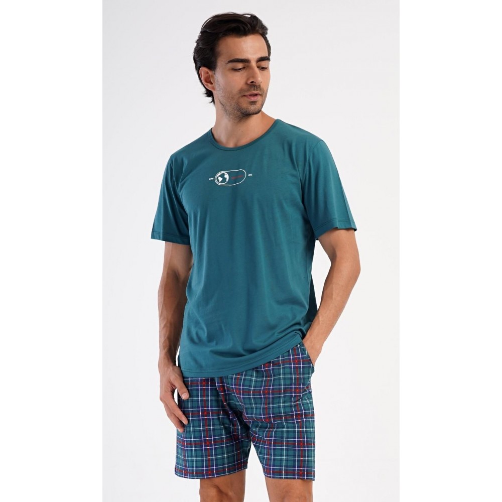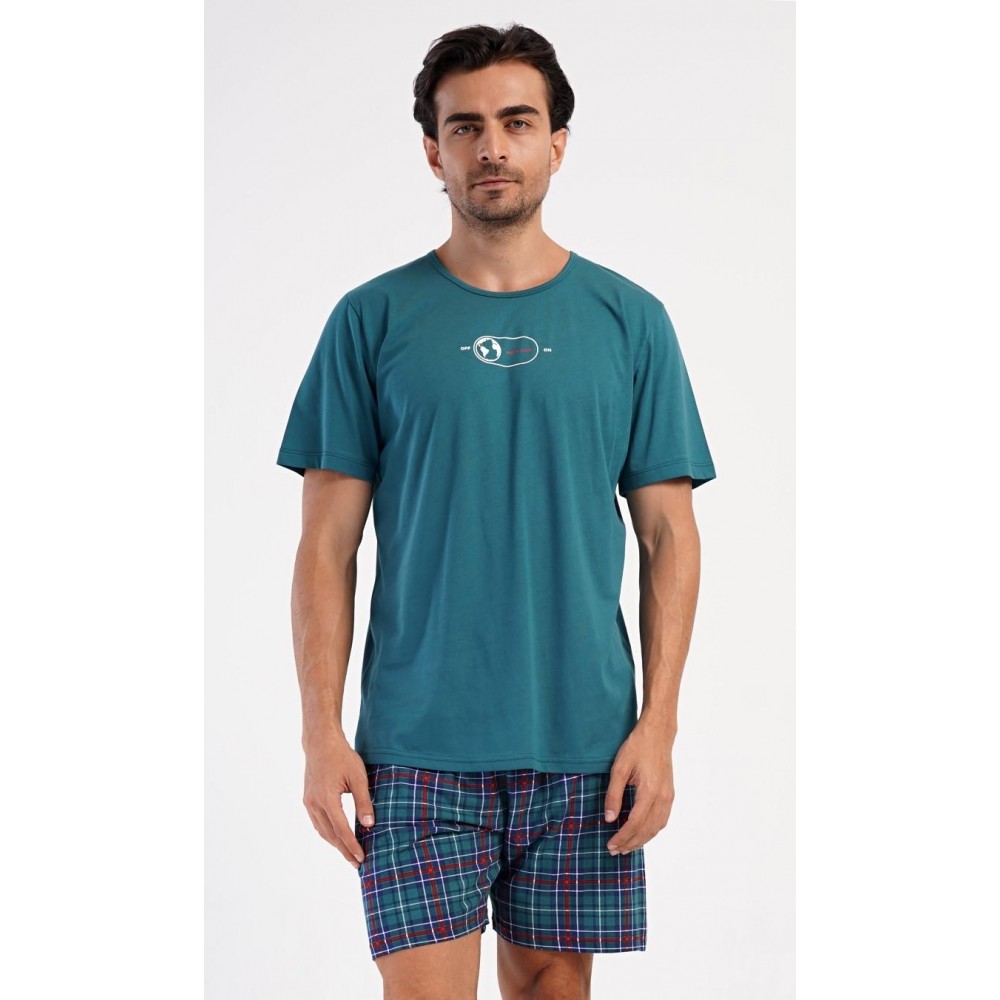 Pánské bavlněné šortkové pyžamo Tobias. Pánské pyžamo se skládá z trička s krátkým rukávem a krátkých šortkových kalhot. Tričko s kulatým výstřihem zdobí drobný obrázek zeměkoule. Tričko doplňují kárované šortky, které mají v pase gumu, šňůrku na stažení a praktické kapsy. Použitý materiál s obsahem bavlny 100% je příjemný a poddajný na dotek.