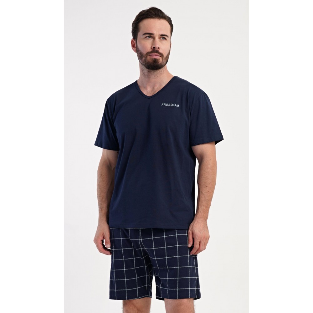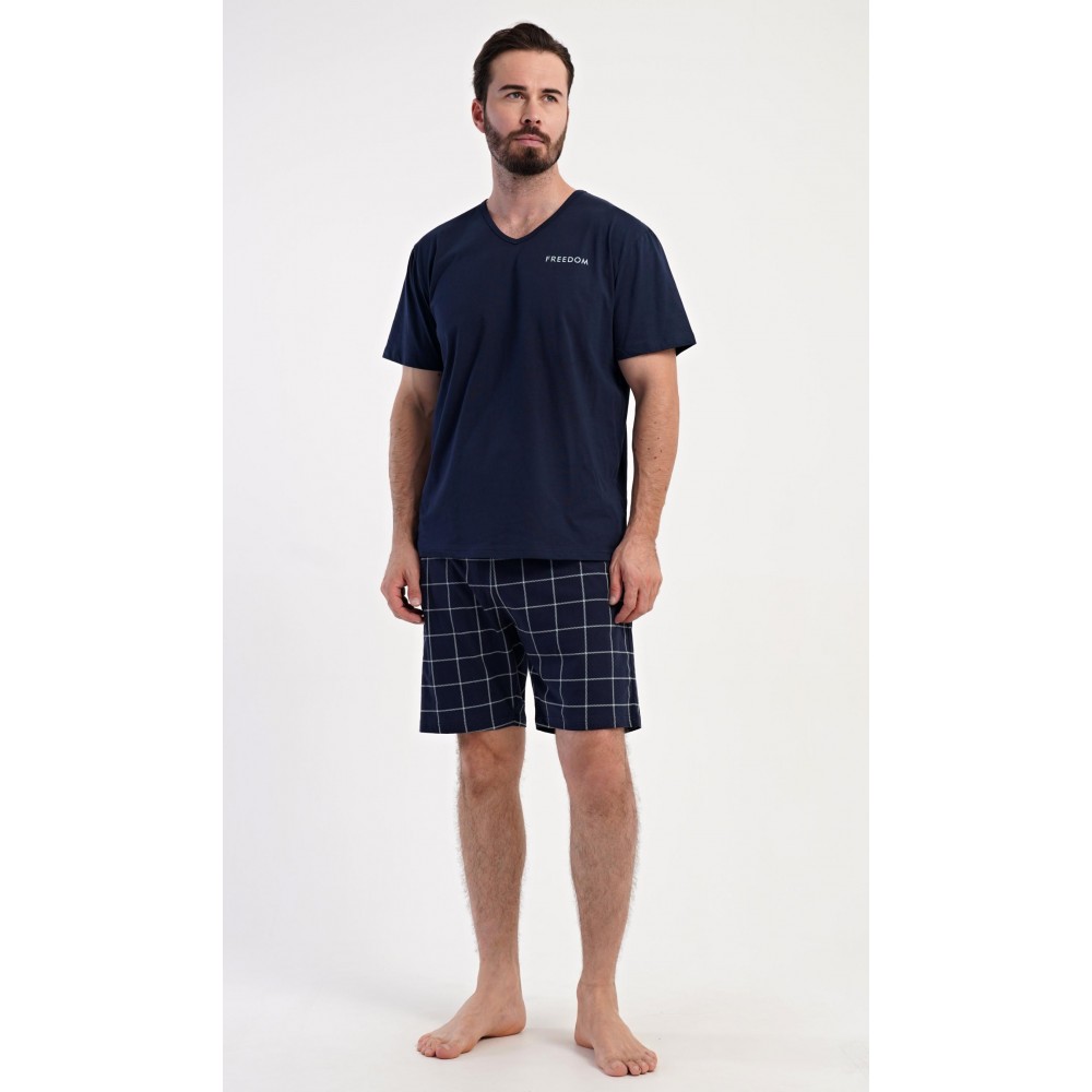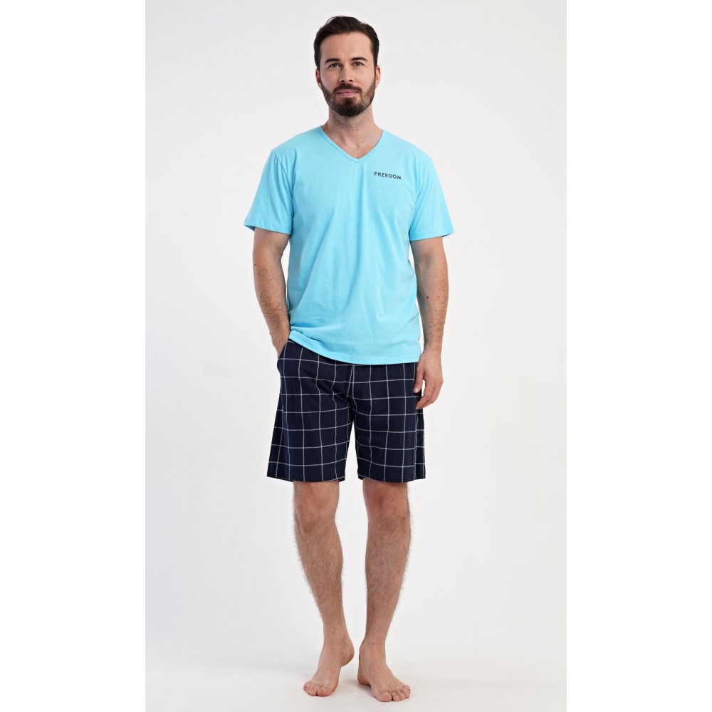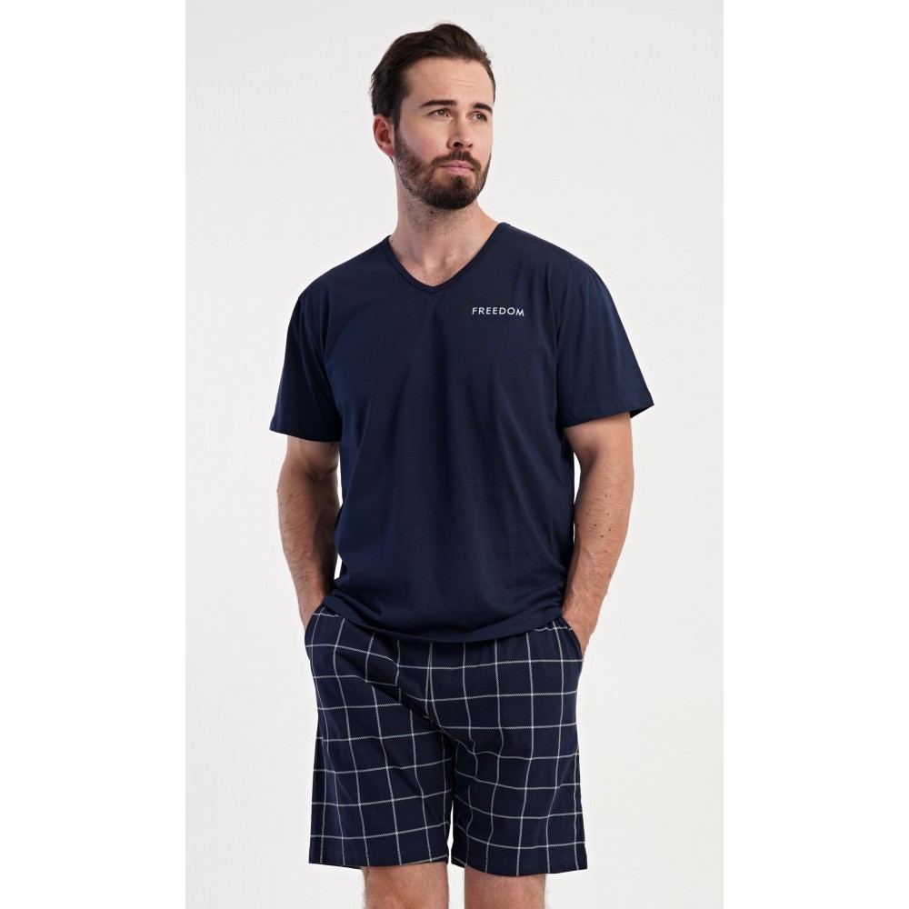 Pánské bavlněné šortkové pyžamo Freedom. Pánské pyžamo se skládá z trička s krátkým rukávem a krátkých šortkových kalhot. Tričko s kulatým výstřihem zdobí na hrudi drobný nápis FREEDOM. Tričko doplňují kárované šortky, které mají v pase gumu, šňůrku na stažení a praktické kapsy. Použitý materiál s obsahem bavlny 100% je příjemný a poddajný na dotek.