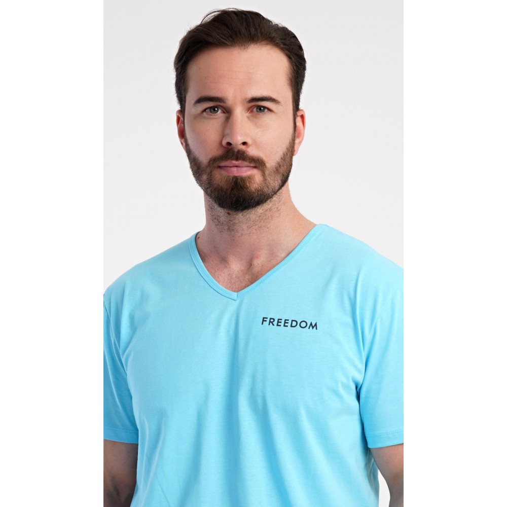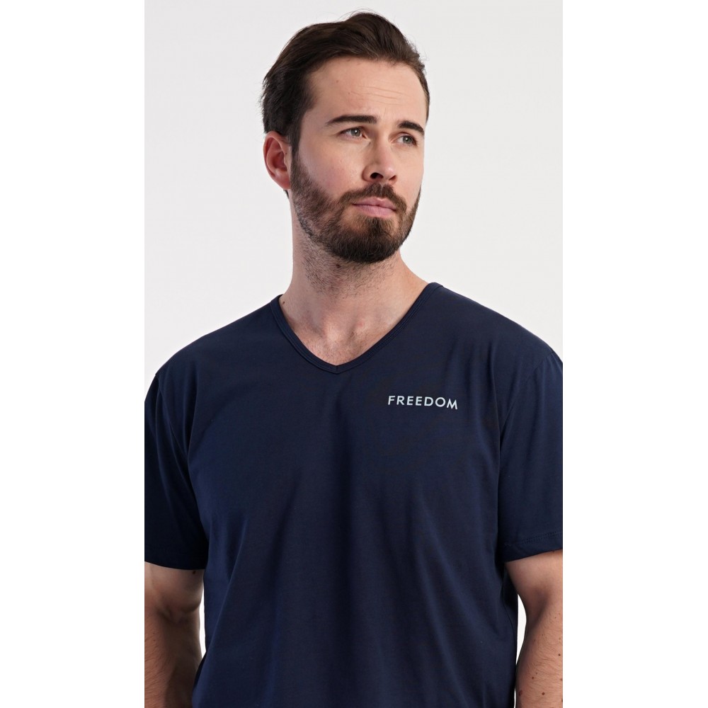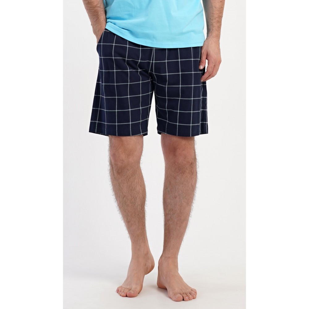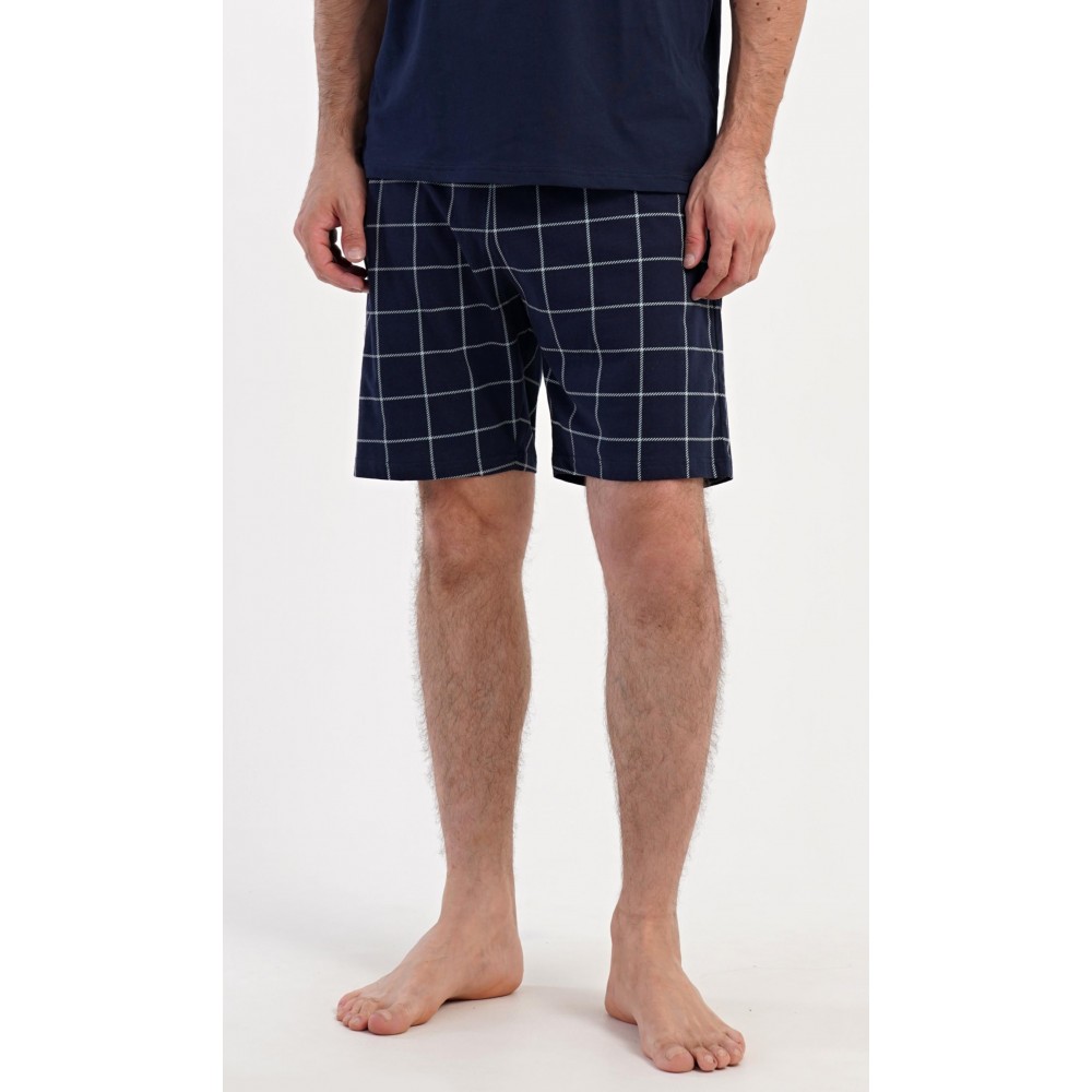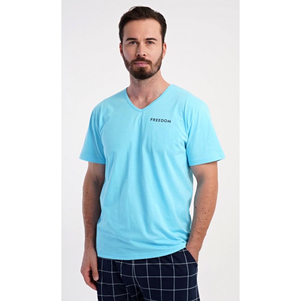 Pánské bavlněné šortkové pyžamo Freedom. Pánské pyžamo se skládá z trička s krátkým rukávem a krátkých šortkových kalhot. Tričko s kulatým výstřihem zdobí na hrudi drobný nápis FREEDOM. Tričko doplňují kárované šortky, které mají v pase gumu, šňůrku na stažení a praktické kapsy. Použitý materiál s obsahem bavlny 100% je příjemný a poddajný na dotek.