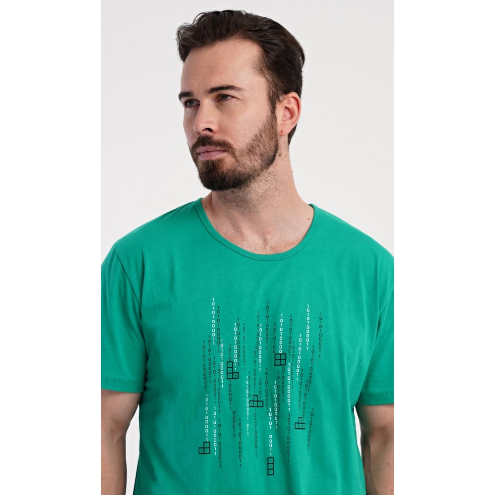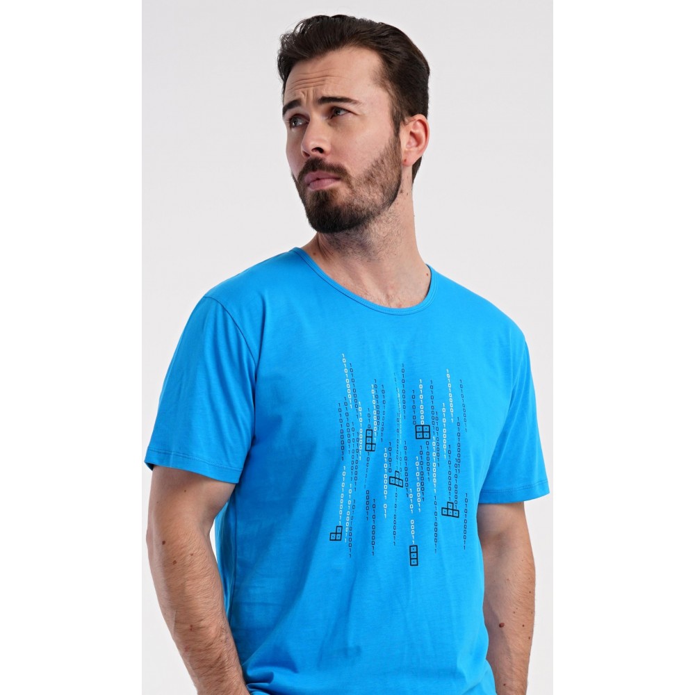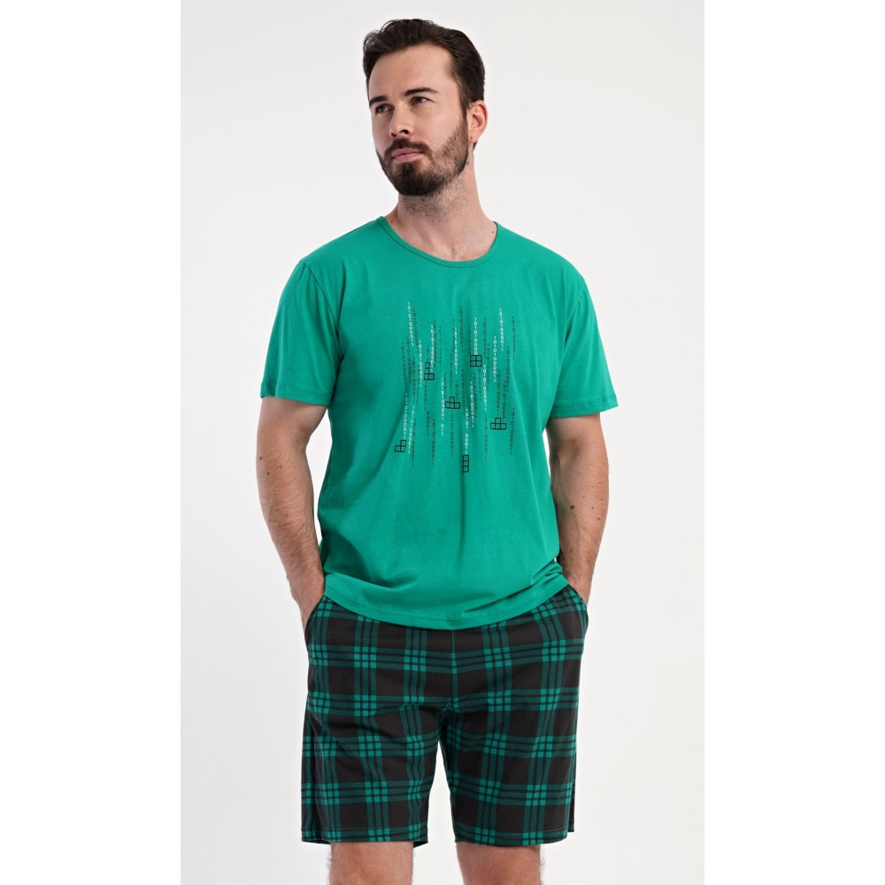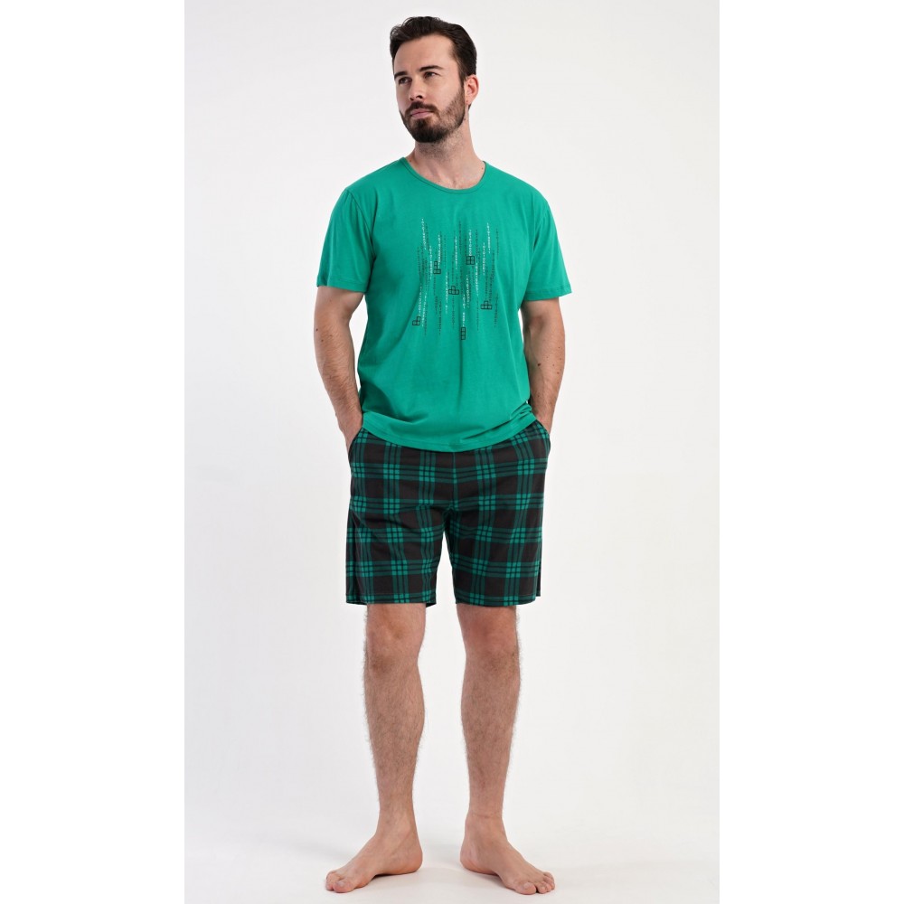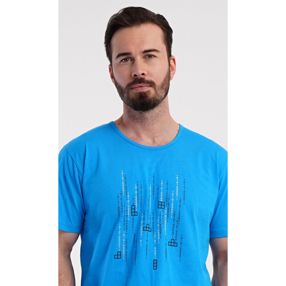 Pánské bavlněné šortkové pyžamo Tetris. Pánské pyžamo se skládá z trička s krátkým rukávem a krátkých šortkových kalhot. Tričko s kulatým výstřihem zdobí na hrudi obrázek hry Tetris. Tričko doplňují kárované šortky, které mají v pase gumu, šňůrku na stažení a praktické kapsy. Použitý materiál s obsahem bavlny 100% je příjemný a poddajný na dotek.