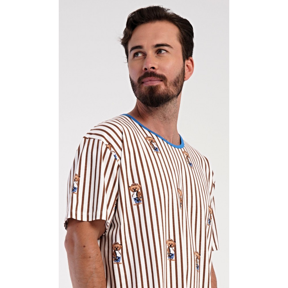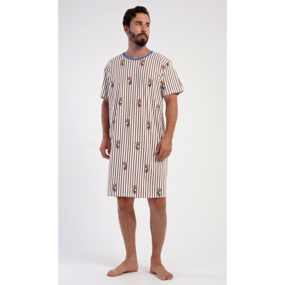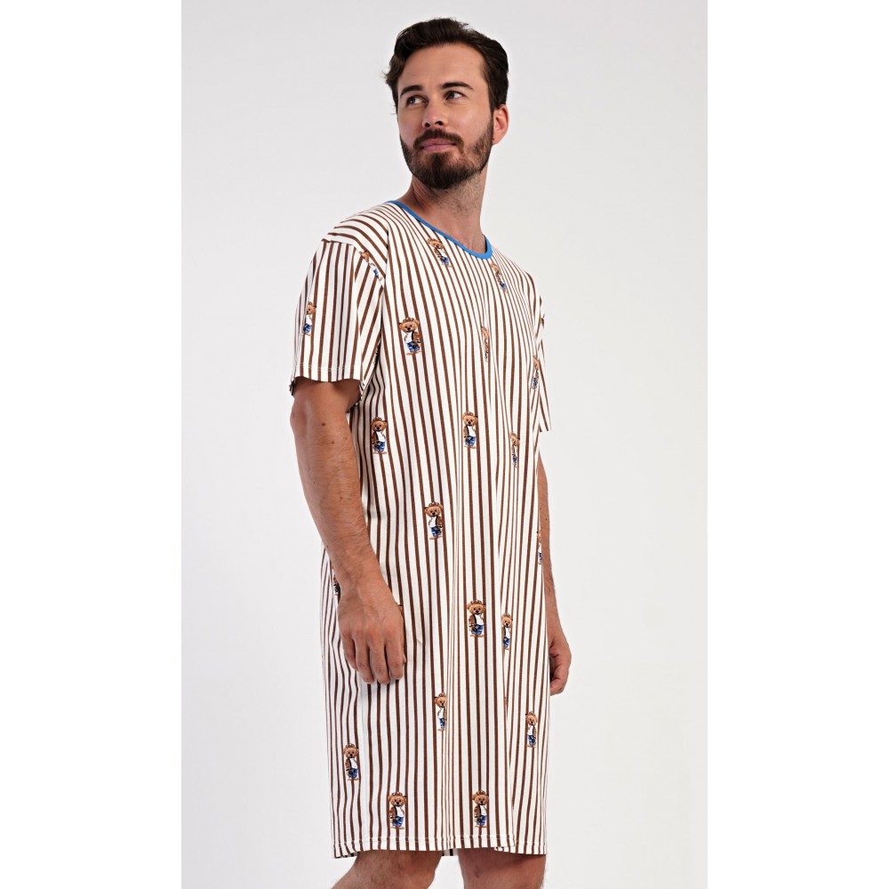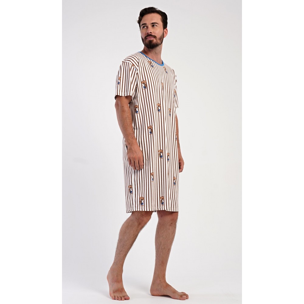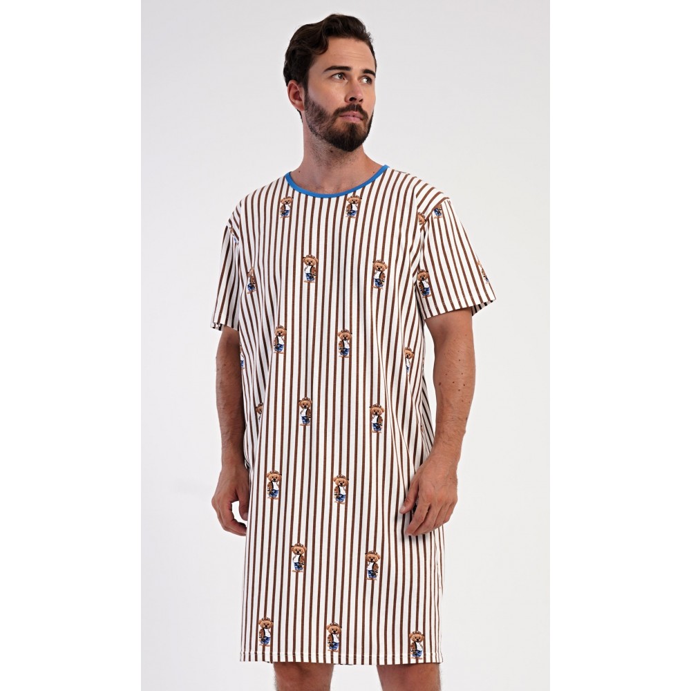 Pánská bavlněná noční košile s krátkým rukávem Bear. Proužkovaná pánská noční košile s kulatým výstřihem a délkou po kolena je potištěna medvídky. Použitý materiál s obsahem bavlny 100% je příjemný a poddajný na dotek.