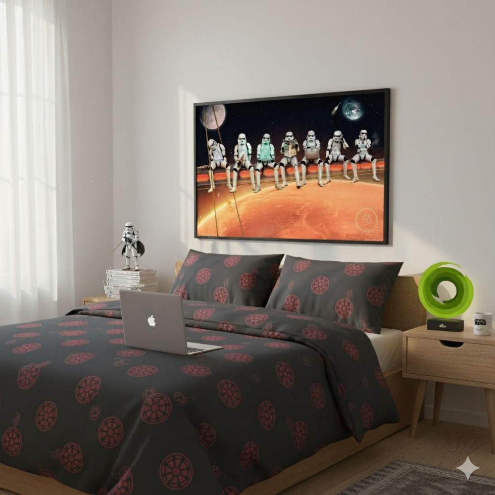 Slavná fotografie dělníků na lešení v Manhattanu (1932) inspirovala tento plakát ze světa Star Wars, kde parta Stormtrooperů posedává uprostřed vesmíru - zřejmě na jednom z vnějších nosníků Hvězdy smrti. Každý ze 7 vyobrazených flákačů má svou vlastní kratochvíli, např. četbu novin, pivko nebo cigárko. Plakát je vyveden na kvalitním laminovaném papíře. Certifikát FSC - vyrobeno z udržitelných zdrojů! Nutnost pro skalní milovníky filmů Star Wars, ať už bílou pěchotu usadíš na stěnu doma nebo v kanceláři.