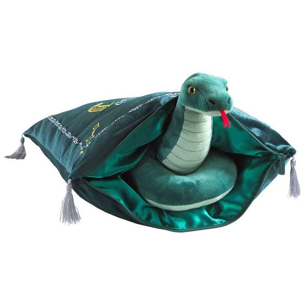 Plyšový had, maskot koleje Zmijozel na bradavické škole čar a kouzel, může nyní číhat schovaný uvnitř měkkého zeleného polštáře také u vás doma! Polštář se zmijozelským znakme a plyšák roztomilého hada budou skvělými dárky pro fanoušky příběhů Harry Pottera.