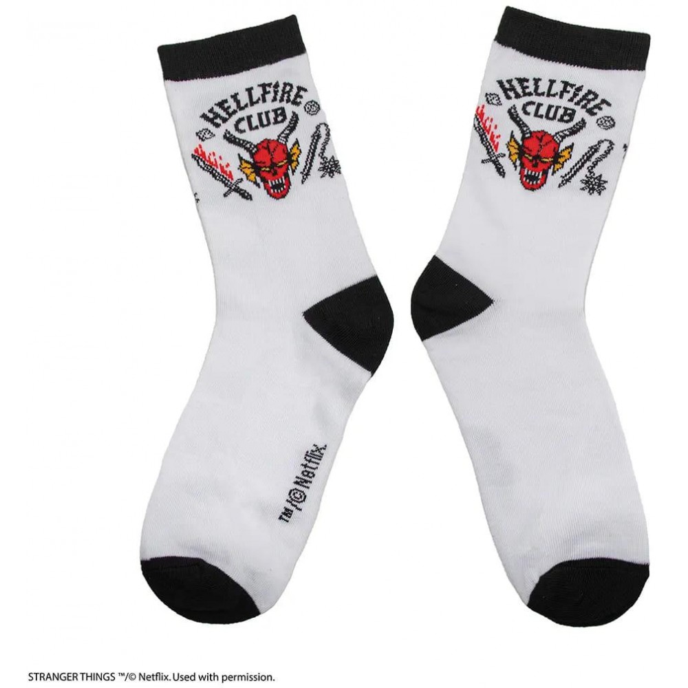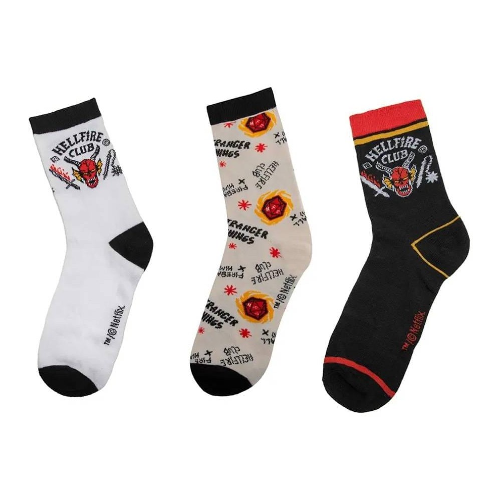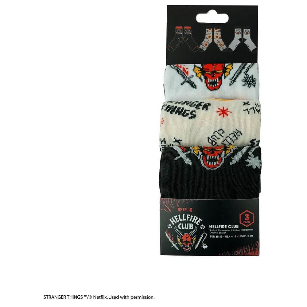 Tato sada 3 párů ponožek Hellfire Club ti umožní nosit oblíbený klub z Hawkins přímo na nohou! Každý pár je originálně navržený s motivy Hellfire Clubu, takže tvůj outfit hned získá styl! Ponožky jsou vyrobené z kvalitního materiálu, pohodlné, pružné a odolné, ideální pro dlouhé dny plné dobrodružství nebo pohodové sledování Stranger Things doma. Univerzální velikost 35–45 se přizpůsobí většině dospělých i teenagerek a teenagerů.