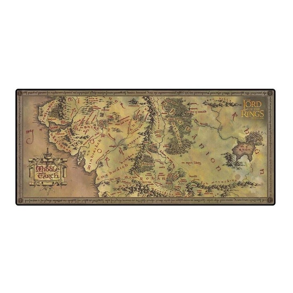 Podložka na tvůj herní či pracovní stůl s mapou Středozemě tě přenese do fantastického světa Pána prstenů a Hobita! Skvělý pomocník pro myš a klávesnici má voděodolný a omyvatelný povrch, který maximalizuje přesnost pohybu tvé myši. Zesílené boční švy zvyšují odolnost a kvalitní potisk září jasnými barvami. Podložka má pogumovanou spodní část proti skluzu, takže bude držet na svém místě, ať už se budeš právě toulat Krajem nebo máš namířeno do Mordoru. Velikost podložky je 81 x 36 cm.