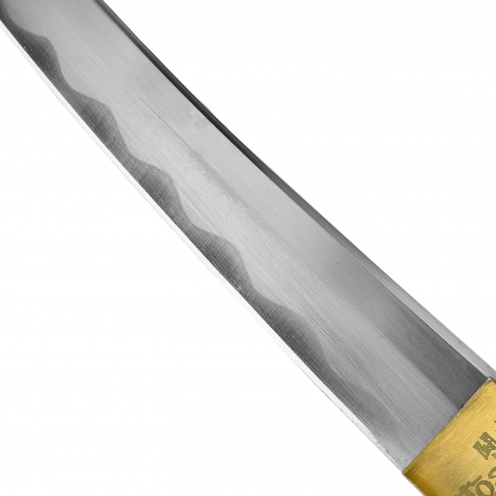 Rukojeť má pravou rejnočí kůži omotanou bavlněným opletem, která poskytuje pevný a pohodlný úchop. Ocelová záštita chrání ruku při použití a dodává tantu elegantní vzhled. Dřevěná pochva nejen chrání čepel, ale také podtrhuje tradiční styl tanto nože. S hmotností 735 g je nůž vyvážený a lehce ovladatelný.