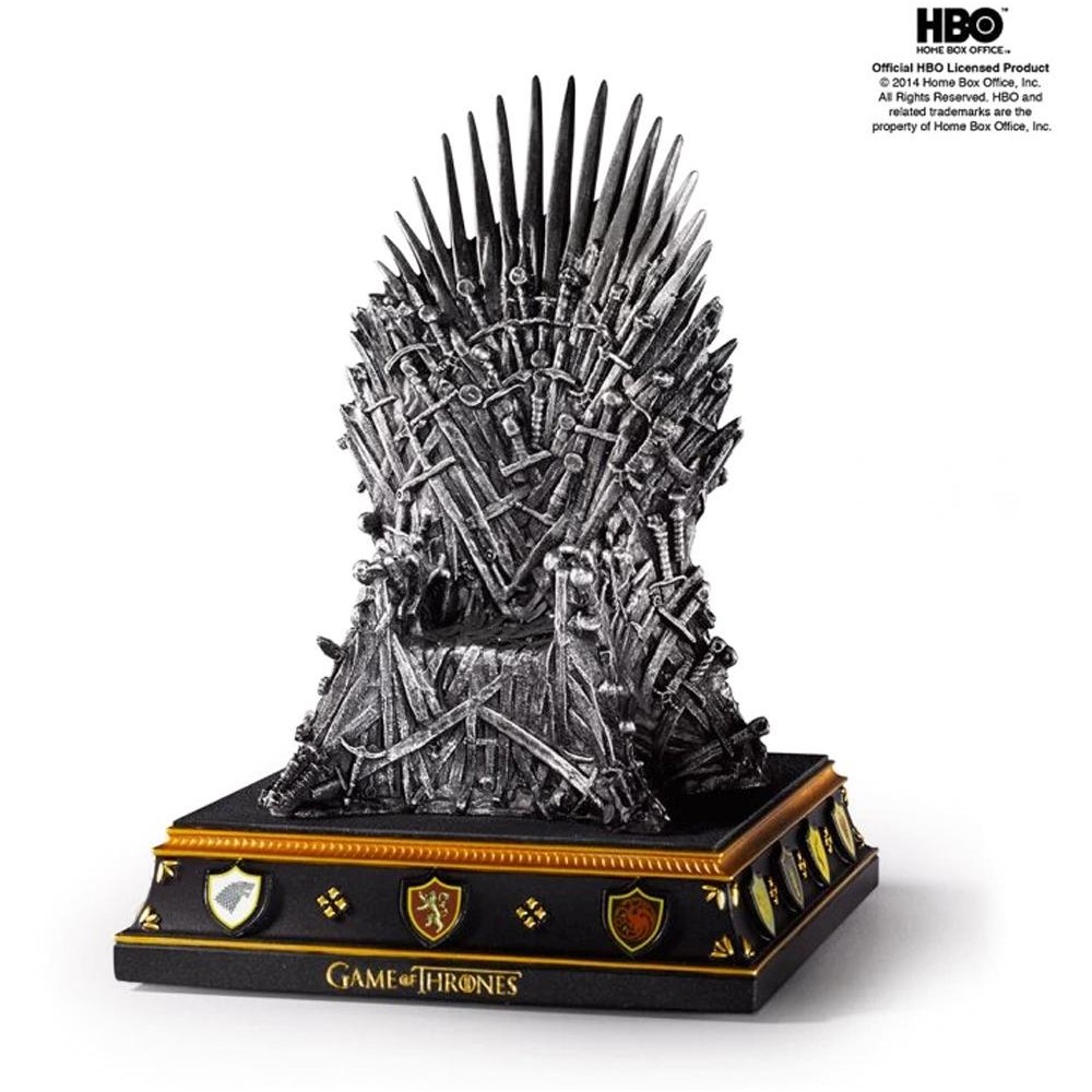 Replika slavného filmového trůnu (Iron Throne) z fantasy série Game of Thrones. Železný trůn je vysoký 19 cm, ručně malovaný a podél podstavce jsou vyobrazeny erby nejdůležitějších urozených rodů. Působivá zarážka na knihy do Vaší knihovny!