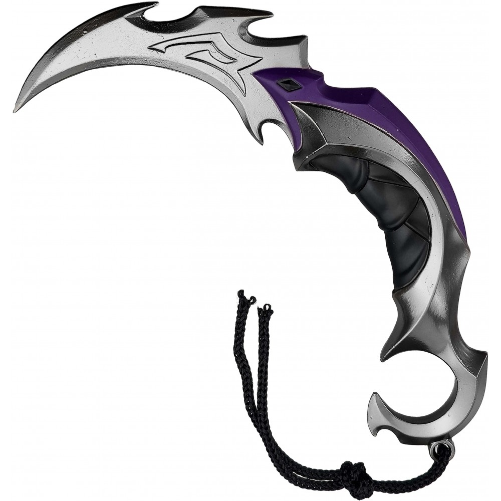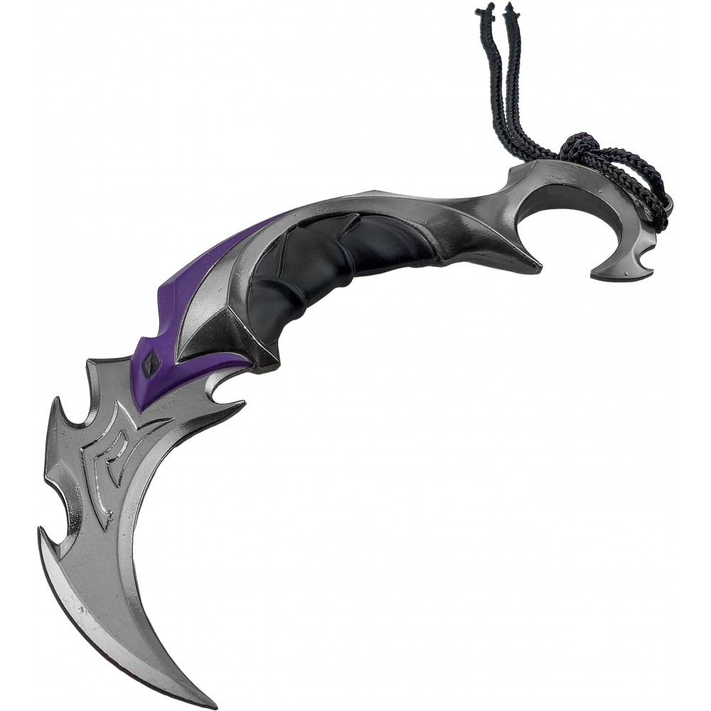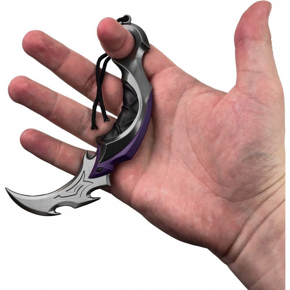 Přenes se do světa Valorantu s věrnou replikou legendárního Reaver Karambitu, ikonické zbraně oblíbené především mezi fanoušky temnějších skinů. Tento karambit vyniká agresivním, elegantně zahnutým designem, který kombinuje temné kovové tóny s typickými fialovými akcenty – přesně jako ve hře.