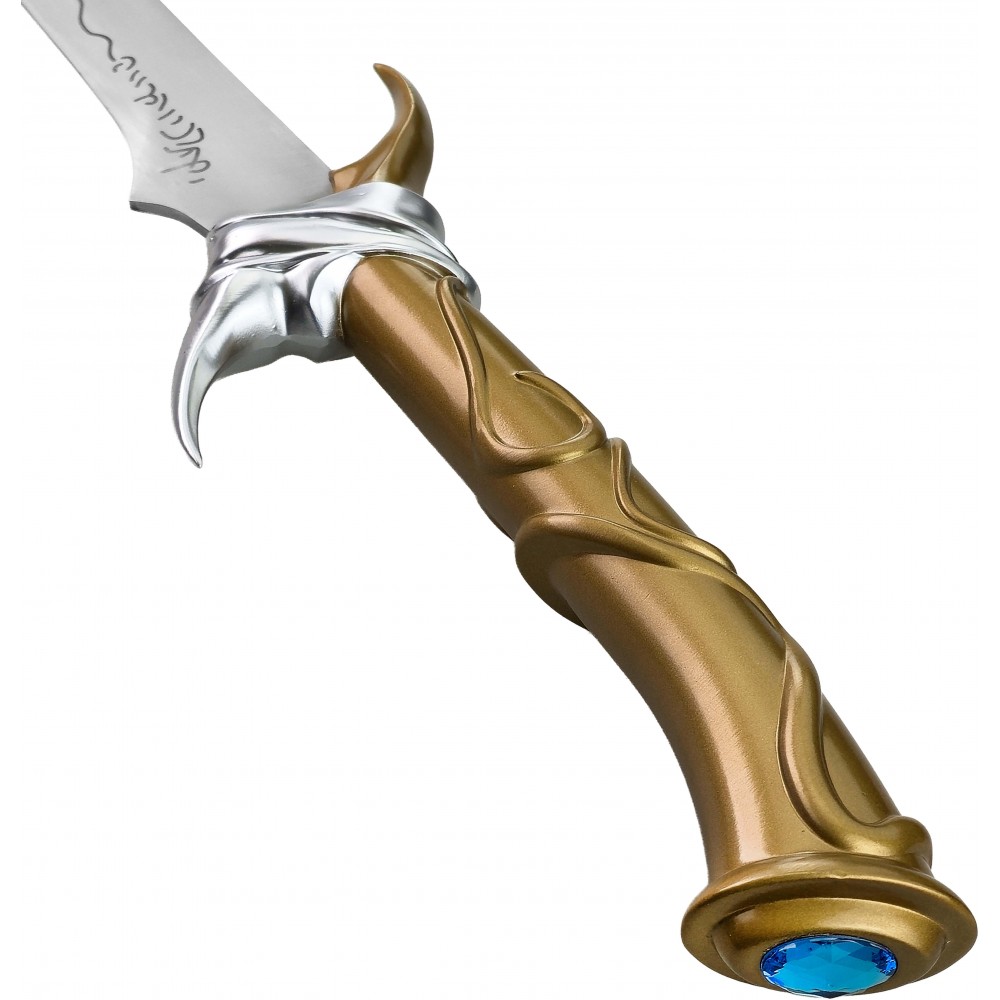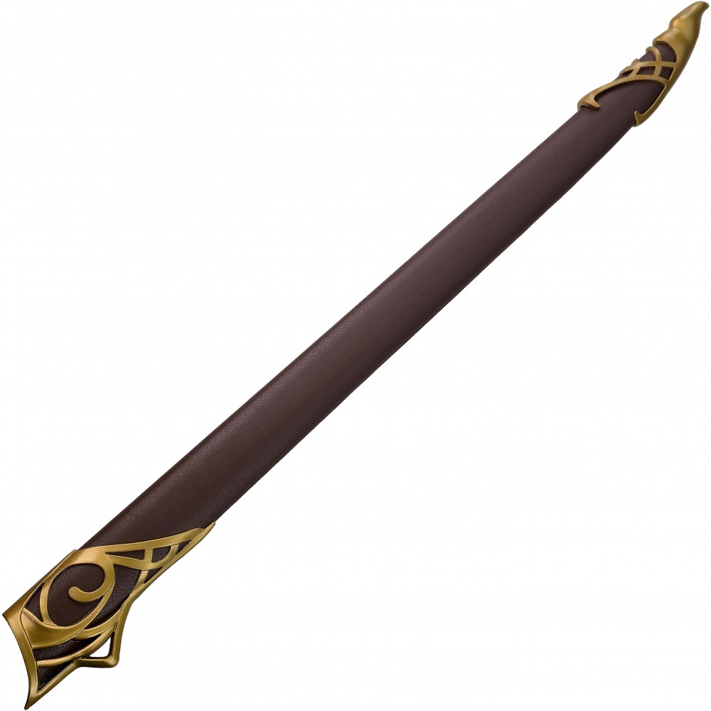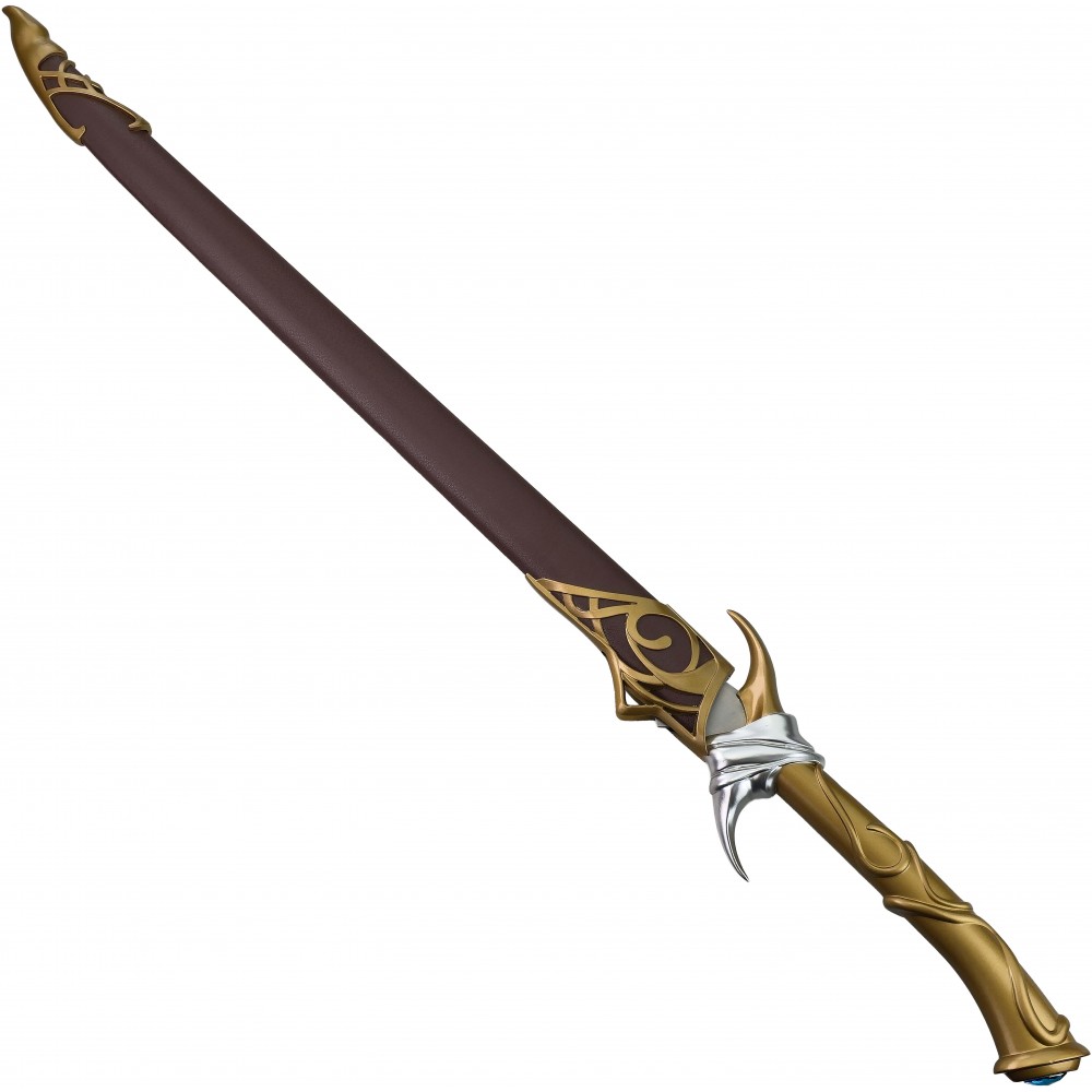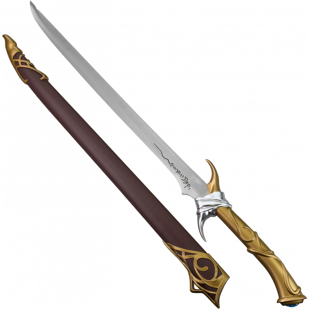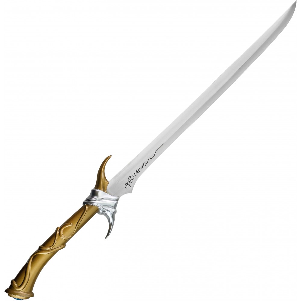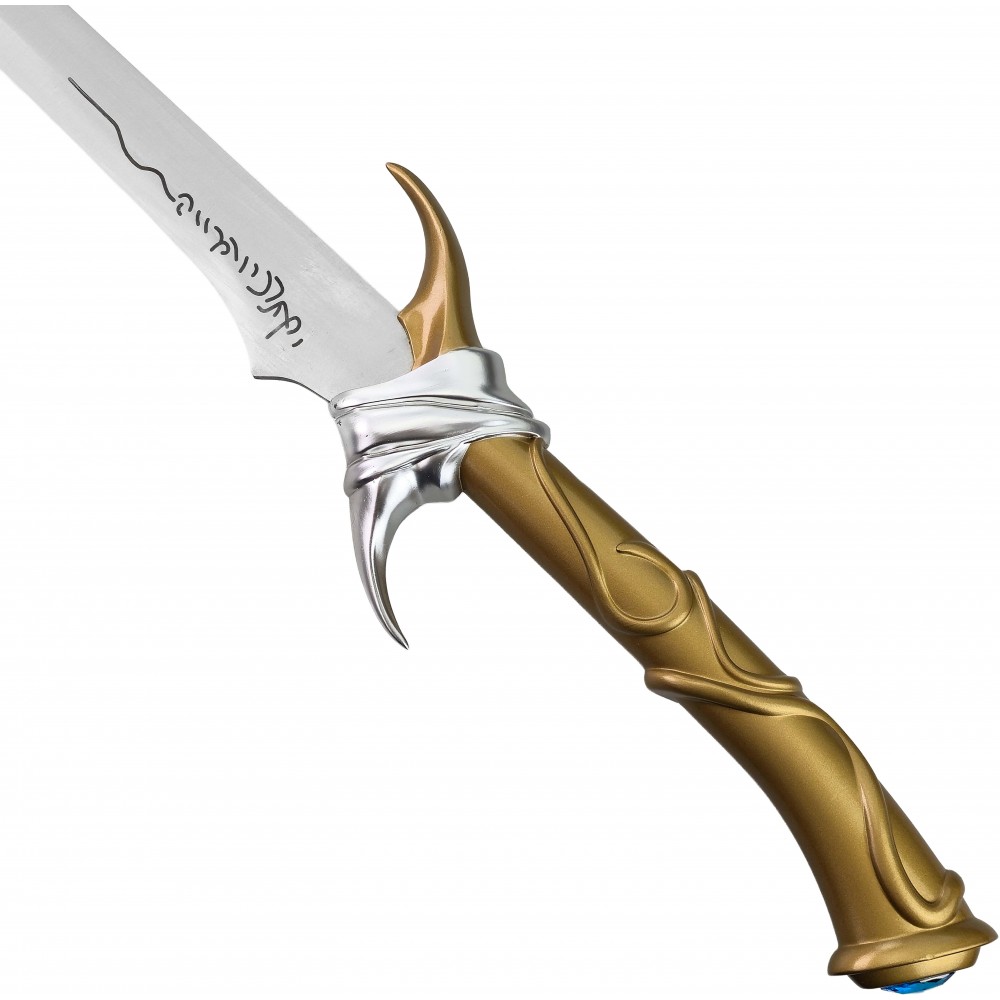 Čepel je vyrobena z nerezové oceli, která dodává meči realistickou hmotnost a lesk, přičemž zůstává zcela tupá, aby byla bezpečná pro vystavení i cosplay použití. Elegantní rukojeť se zdobeným povrchem je doplněna o stříbrné detaily a výrazný modrý drahokam v patce, přesně podle ikonického vzhledu herní i literární předlohy. Součástí je také dřevěná pochva potažená eko-kůží, která chrání čepel a zároveň podtrhuje luxusní vzhled celé repliky.