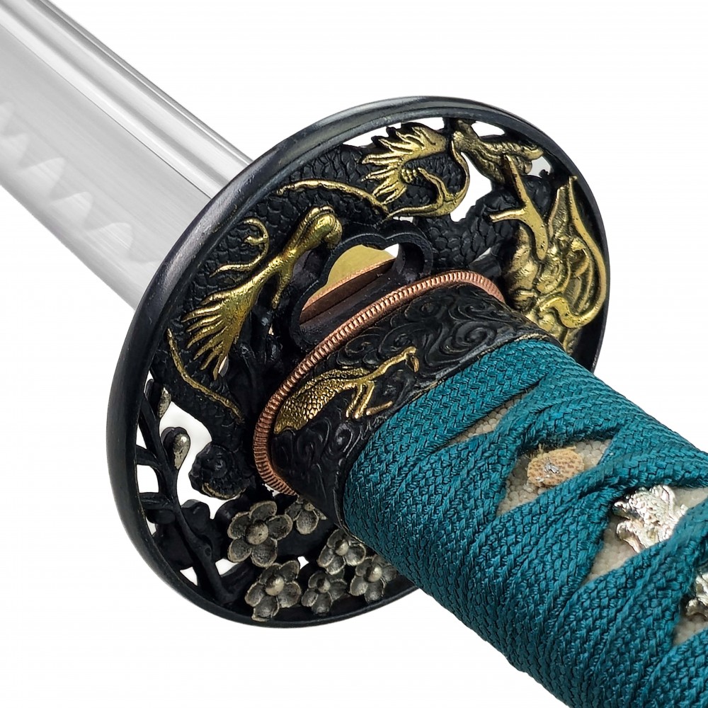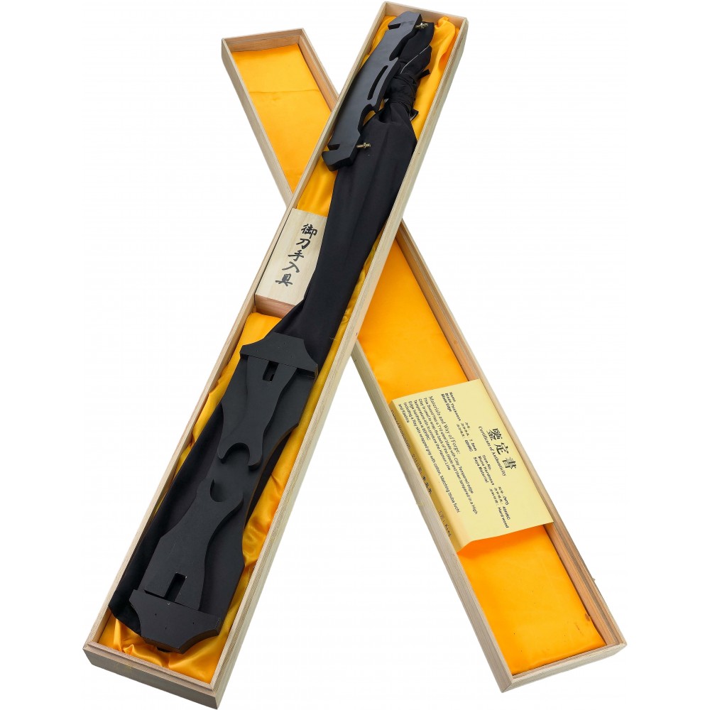 Čepel (nagasa) je vyrobena z oceli T10, kalené jílem pro tvrdost až 60 HRC. Díky tomu je na ostří výrazný autentický hamon, vzniklý tradiční metodou diferenciálního kalení. Rukojeť (tsuka) je potažena pravou rejnočí kůží (samegawa) a opletena pevným bavlněným opletem (ito) v odstínu tmavé zeleně.