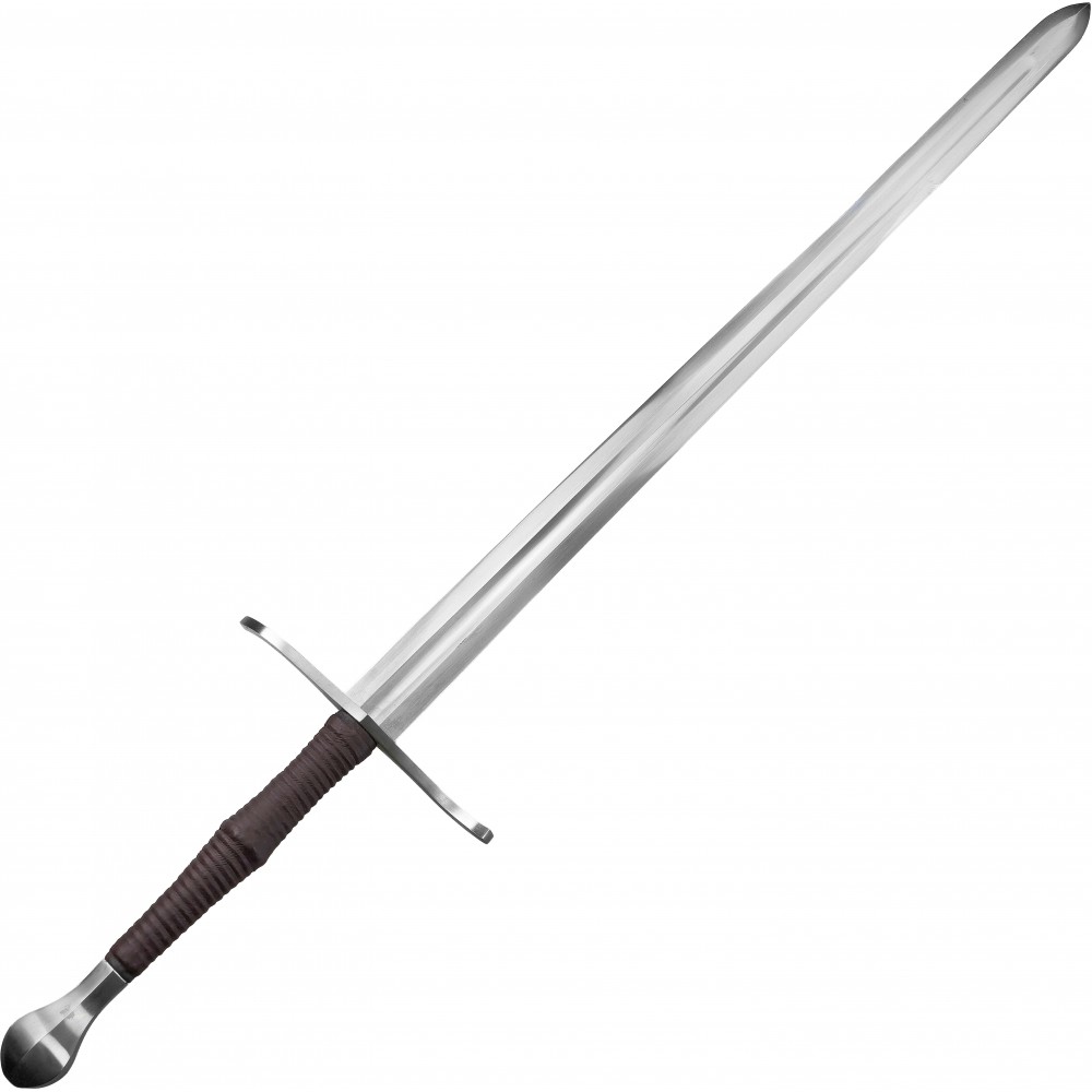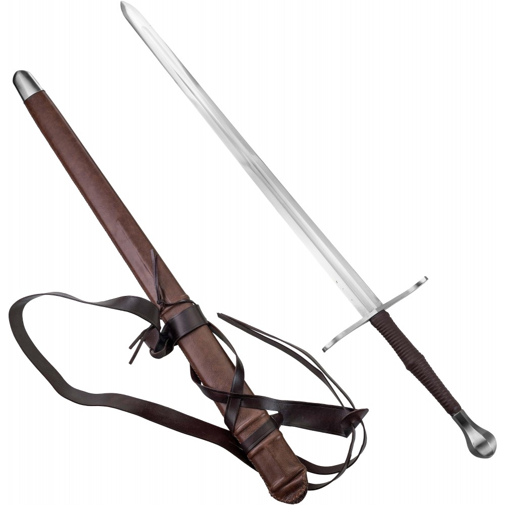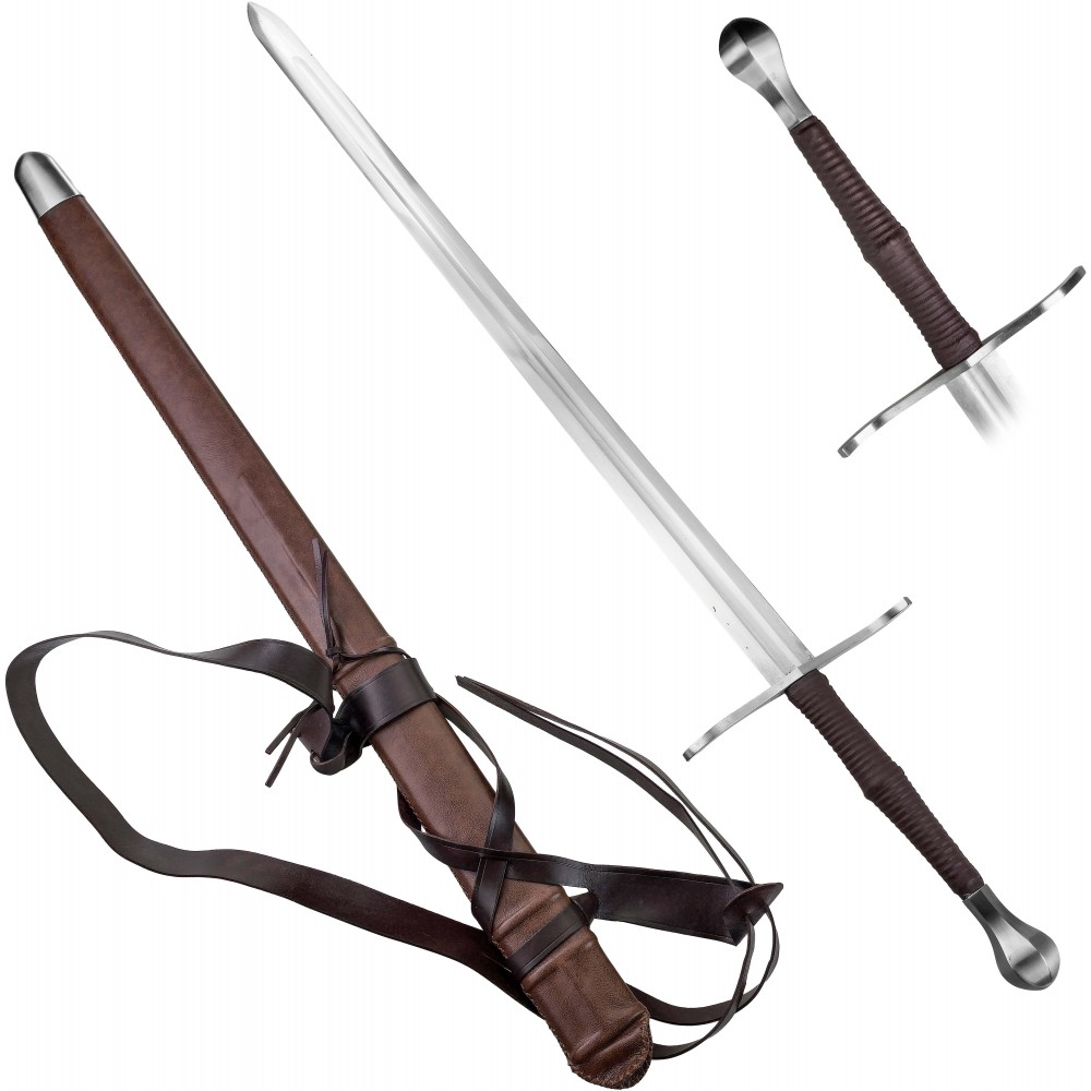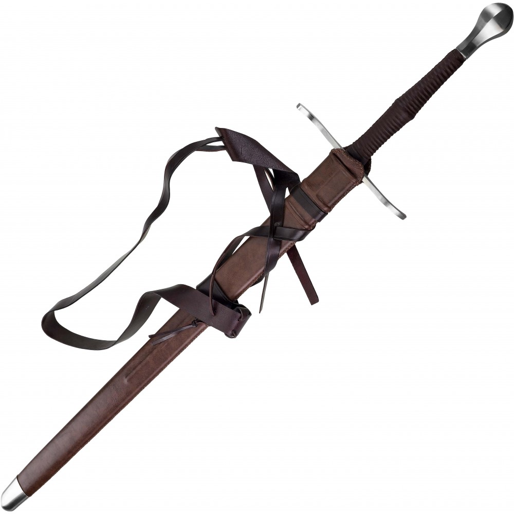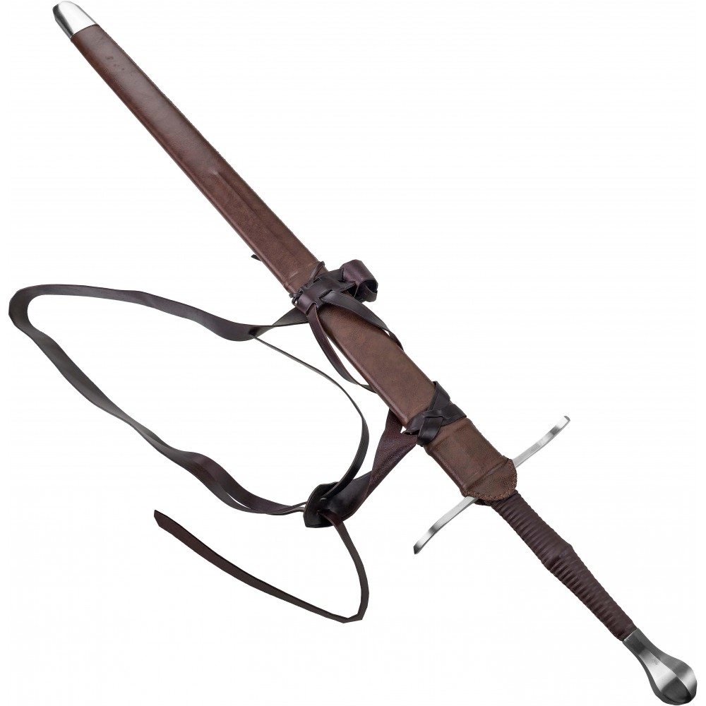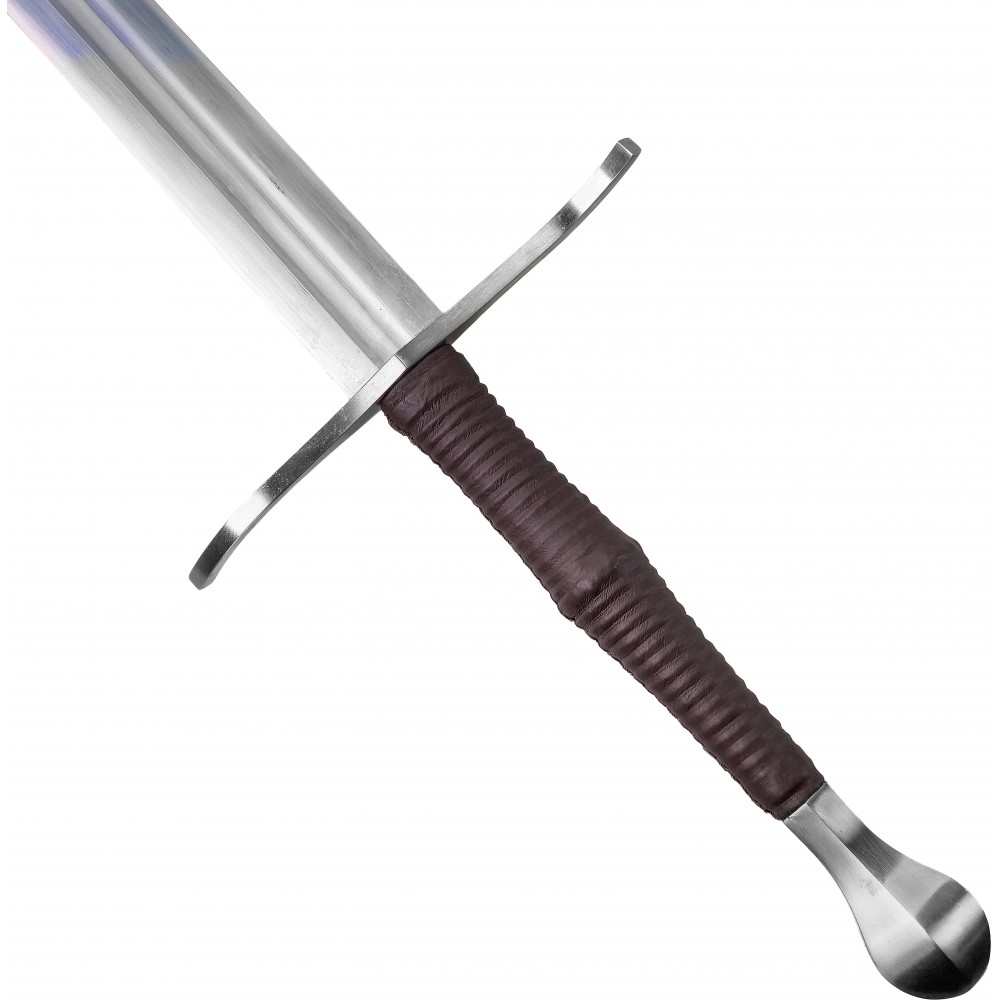Obyčejná kroutivá kovová záštita a hruškovitá hlavice zajišťují vynikající vyvážení meče. Rukojeť je potažena pravou kůží pro pevný a pohodlný úchop i při delším používání. Součástí balení je dřevěná pochva potažená pravou kůží, doplněná o popruh umožňující nošení přes rameno nebo na opasku – funkční a elegantní doplněk v jednom.