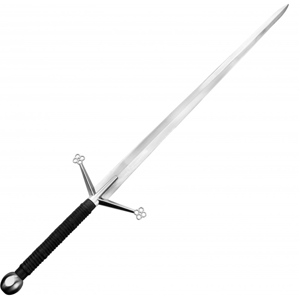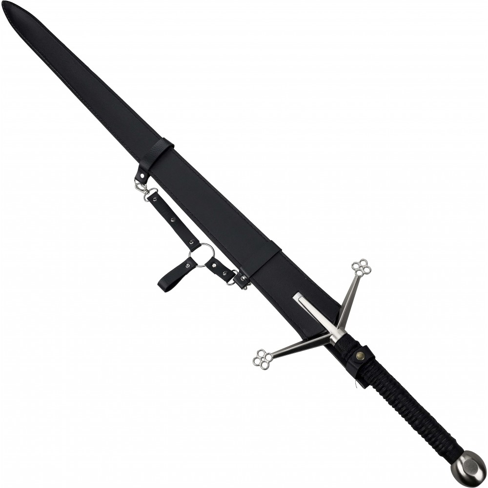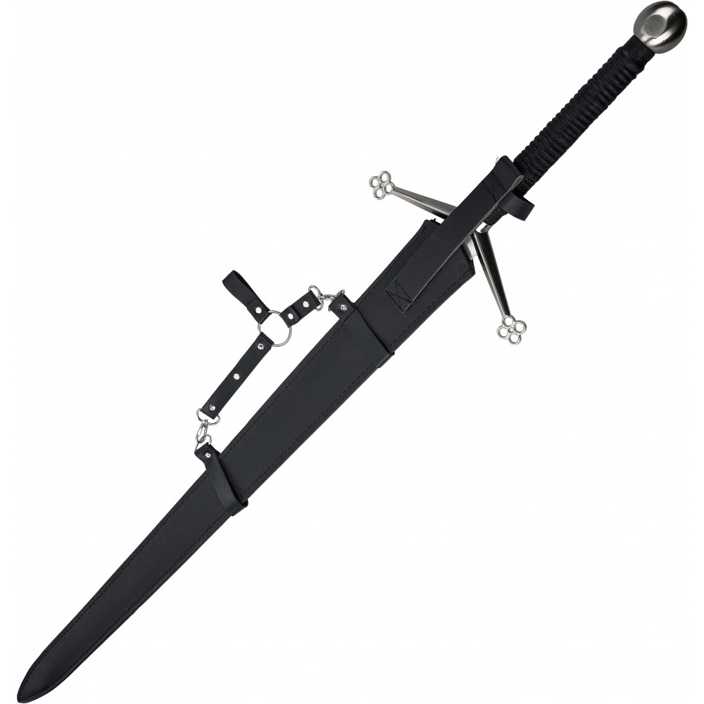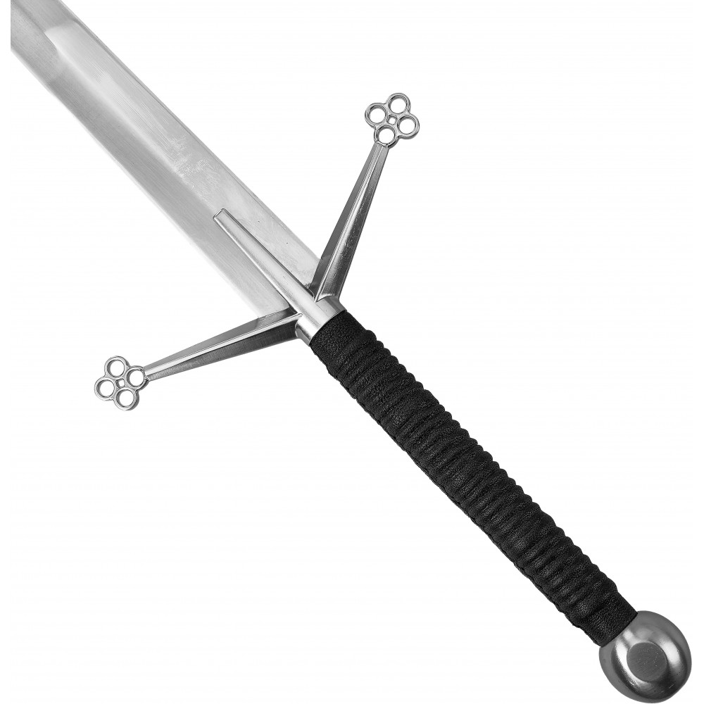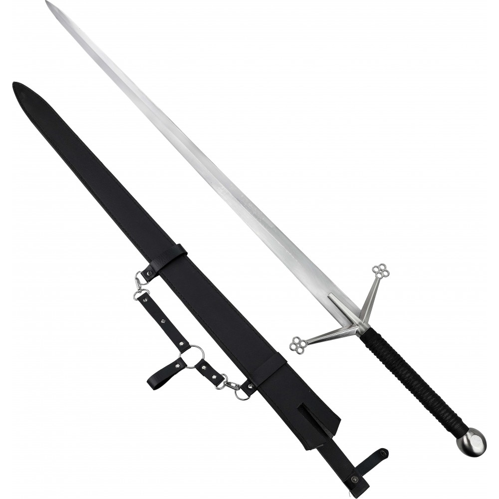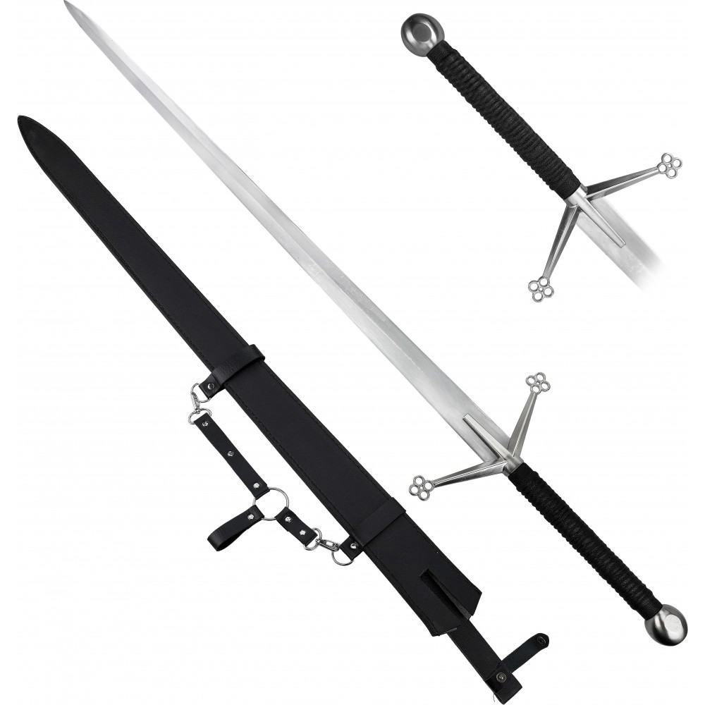 Ergonomická rukojeť je opletena černou eko-kůží pro pevný úchop a zakončena kulatou hlavicí, která slouží jako ideální protiváha dlouhé čepeli. Masivní záštita se čtyřcípými koncovkami podtrhuje historický vzhled této impozantní zbraně. Pochva z eko-kůže je vybavena popruhy a přezkami, které umožňují nošení meče na opasku, což z něj dělá nejen sběratelský klenot, ale i praktický tréninkový nástroj.