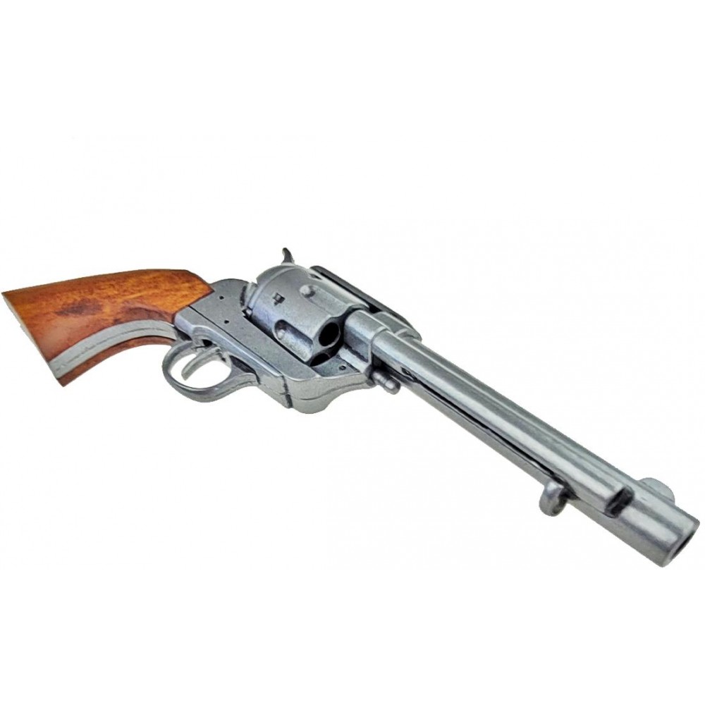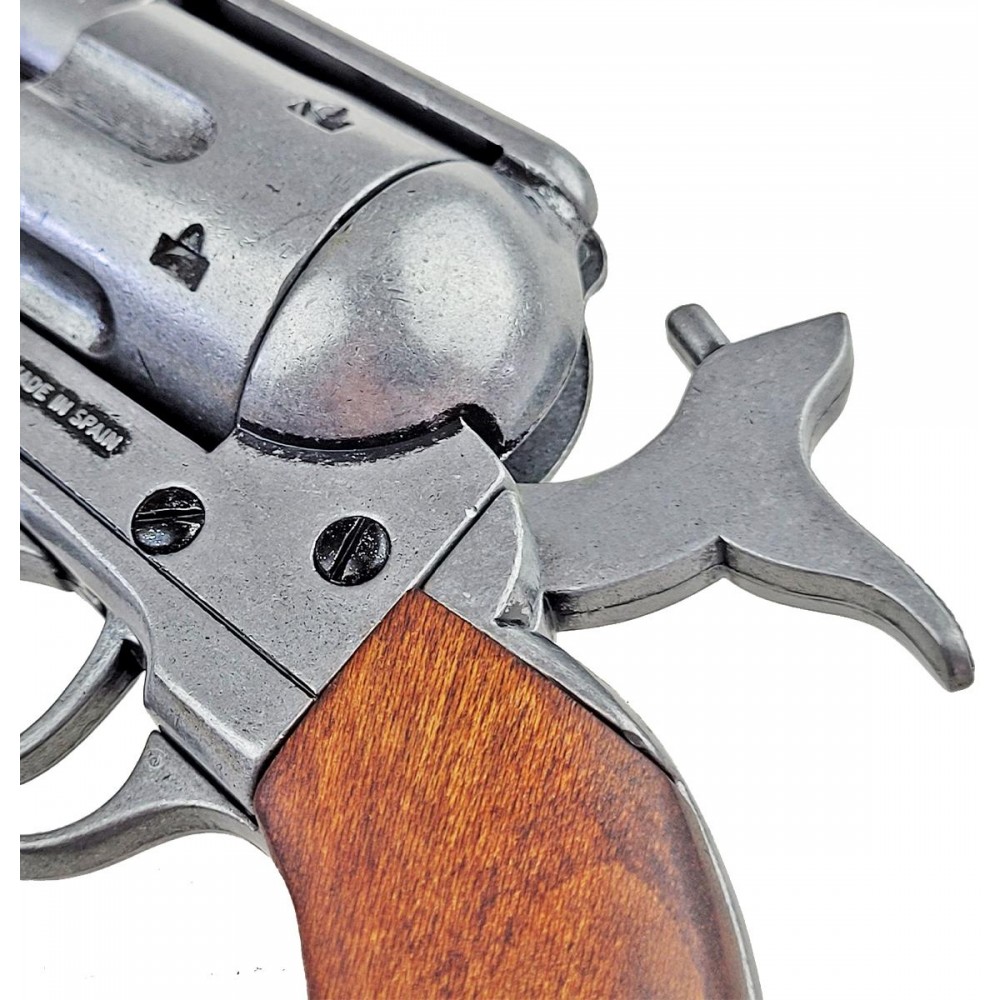 Celý revolver je vyroben z kvalitní oceli, elegantní dřevěná rukojeť dodává revolveru příjemný takt a zvýrazňuje jeho tradiční design. Revolver pochází z továren Španělské firmy Denix. S hmotností 870 gramů je tento revolver skvělým doplňkem k Vašemu kovbojskému kostýmu nebo dekorací do westernového prostředí. Rozjasní vaše tematické akce, party nebo kostýmové akce a přenesou vás přímo do doby, kdy západ byl stále divoký.