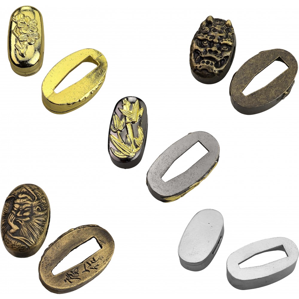 Sada fuchi a kashira představuje elegantní způsob, jak dodat samurajskému meči osobitý charakter. Každý pár kombinuje tradiční japonské motivy a detailní reliéfní zpracování, které okamžitě přitáhne pozornost a zvýrazní estetiku celé rukojeti.
