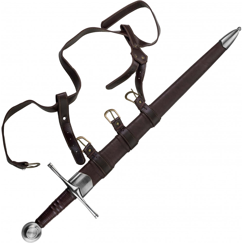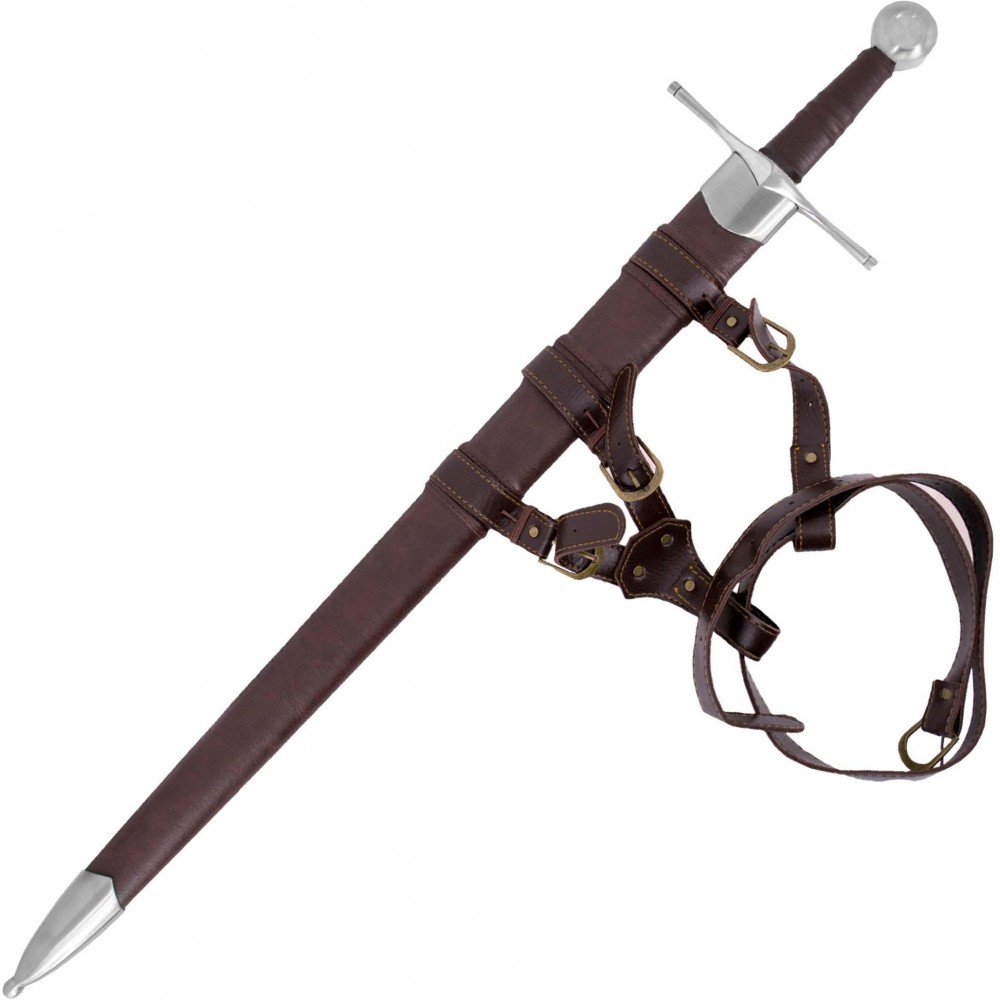Pochva meče je vyrobena ze dřeva a potažena kvalitní eko-kůží, která zajišťuje autentický vzhled i odolnost. Součástí je praktický pásek pro pohodlné nošení, takže meč můžete mít vždy po ruce, ať už trénujete nebo vystupujete. S hmotností 1190 g poskytuje dostatečnou stabilitu pro realistický zážitek z boje.