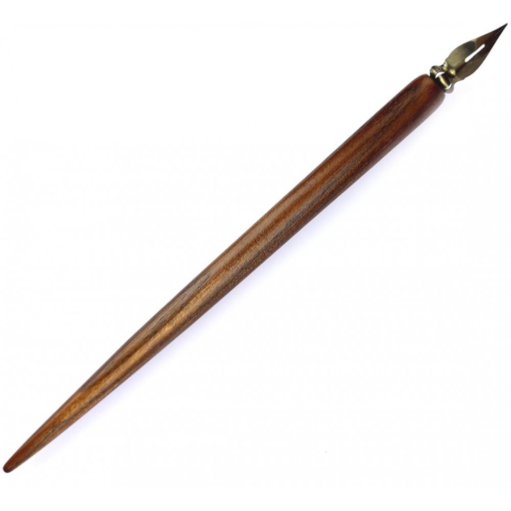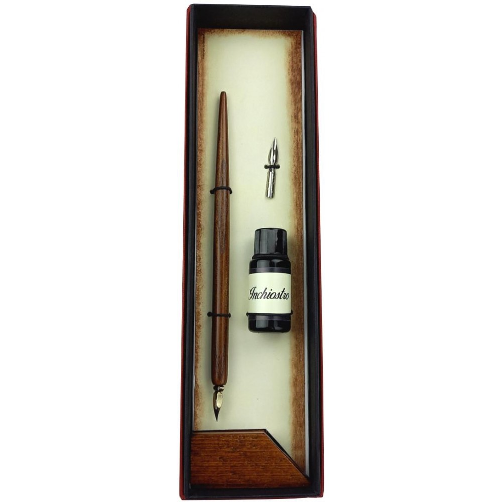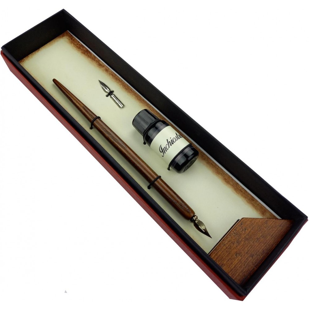 Dřevěné psací pero "ELOQUENTIA" je kvalitně vyhotovené pero s kovovou násadkou a dvěma vyměnitelnými hroty. Je nejen krásný na pohled, ale plně funkční! Součástí této luxusní sady je samozřejmě i lahvička s inkoustem, která jí dodá na dobové atmosféře.