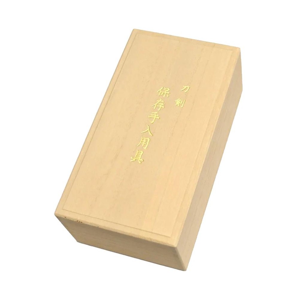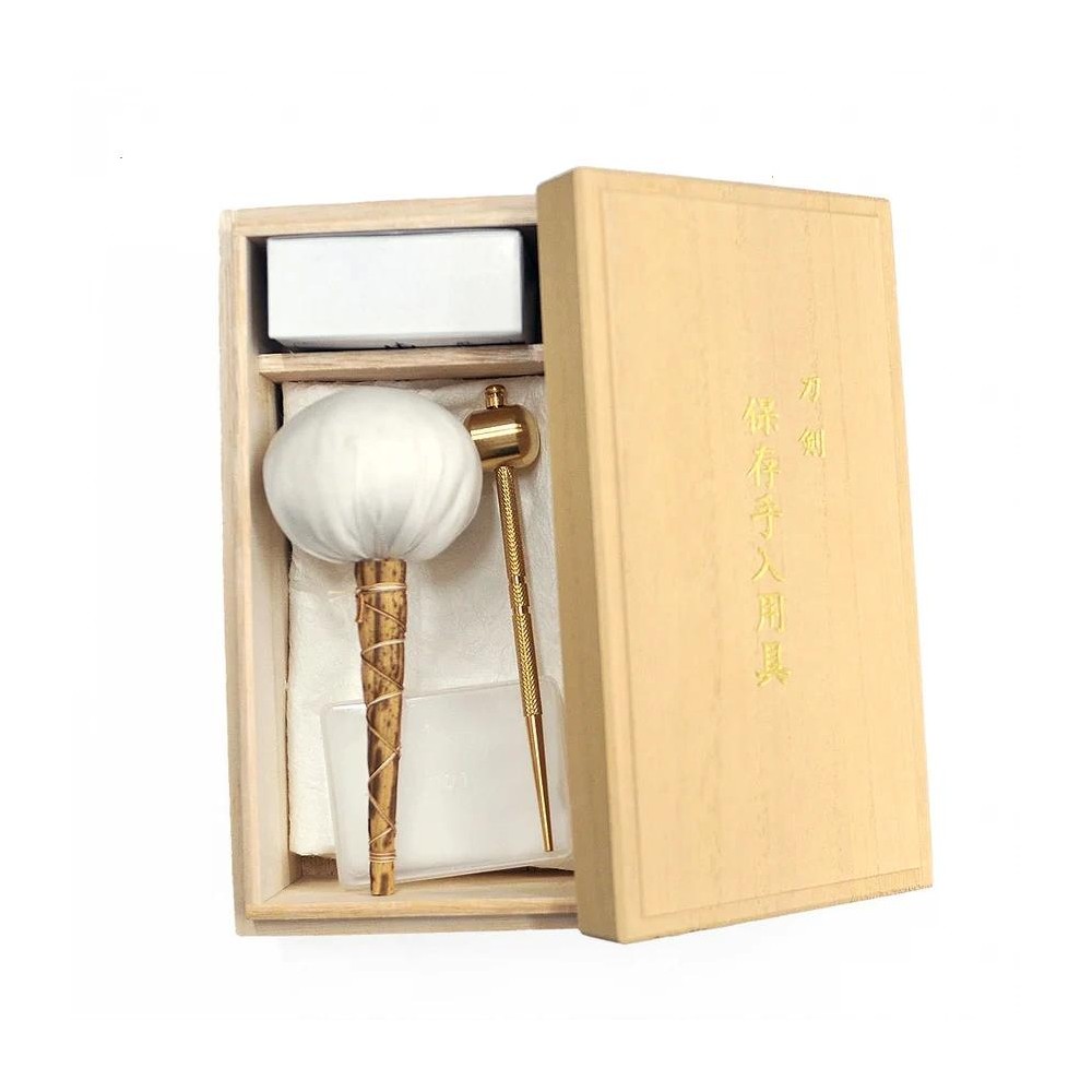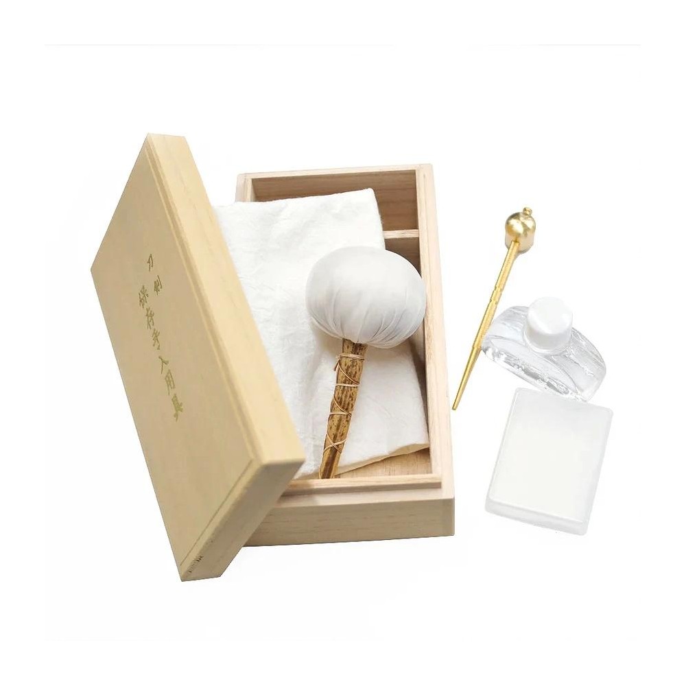 Uvnitř sady se nachází větší prémiové balení prášku uchiko, nástroj mekuginuki, papír nuguigami, kvalitní olej na meče a flanelové pouzdro pro uložení příslušenství. Jednotlivé prvky odpovídají běžným potřebám při čištění a konzervaci čepele, kdy je důležité odstranit nečistoty, starý olej a následně povrch znovu ošetřit. Celý set je uložen v krabičce ze dřeva paulownie, která působí elegantně a zároveň dobře odpovídá charakteru tradiční japonské údržbové výbavy.