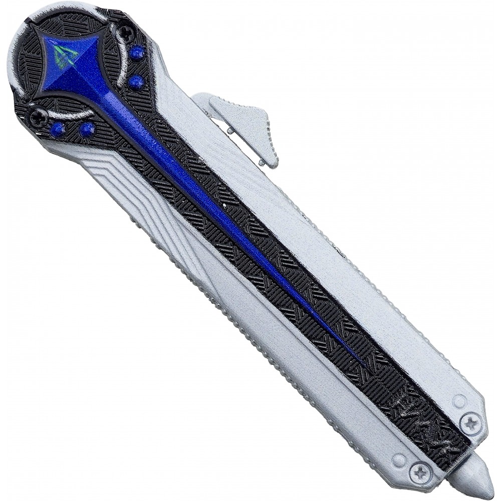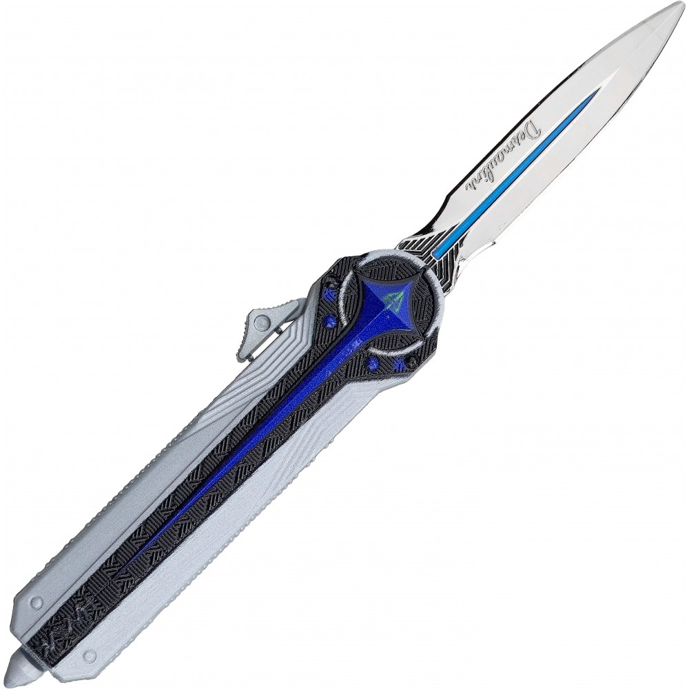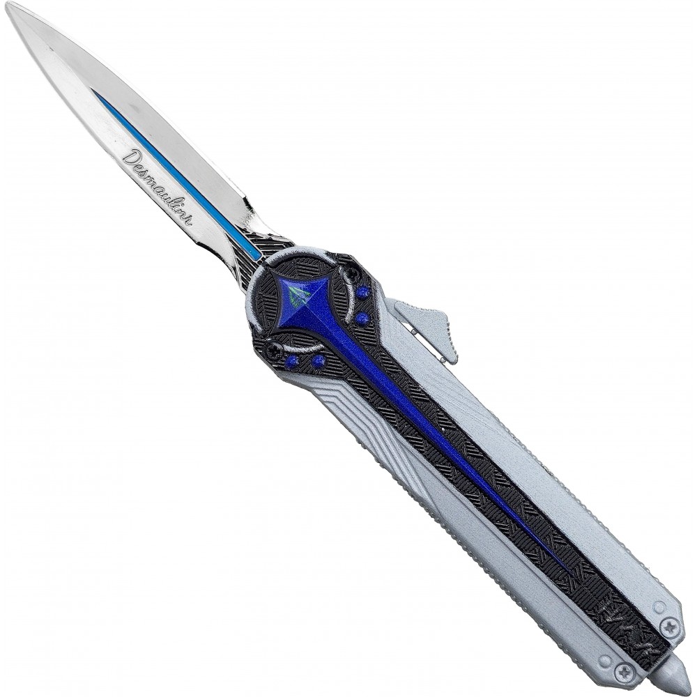 OTF nůž Desmoulin's Edge zaujme fanoušky herních replik futuristickým vzhledem inspirovaným hrou Delta Force. Kombinace stříbrného těla, tmavých linií a modrých detailů působí výrazně a dobře vynikne ve vitríně, na polici i jako doplněk ke cosplayi. Už na první pohled je znát, že jde hlavně o efektní kousek pro sbírku a vystavení, ne o nůž na běžné používání.