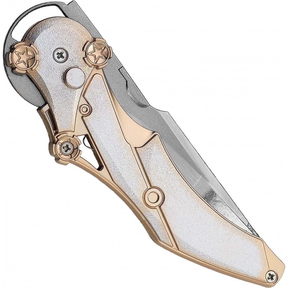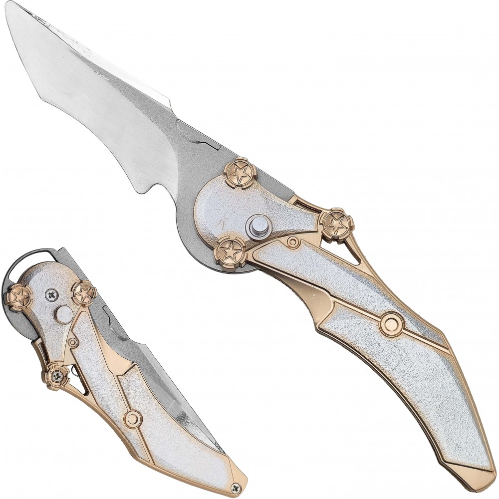 Tělo je vyrobeno ze slitiny zinku a čepel není ostrá, takže se hodí především jako dekorativní a sběratelský kus. V otevřeném stavu měří 21,3 cm, samotná čepel má 9 cm a po zavření nožík měří 13 cm. Je dobré počítat s tím, že jde o levnější kousek, takže se mohou objevit vůle v konstrukci. Právě proto je lepší brát ho hlavně jako efektní repliku pro vystavení nebo do kolekce, ne jako něco na náročnější používání.