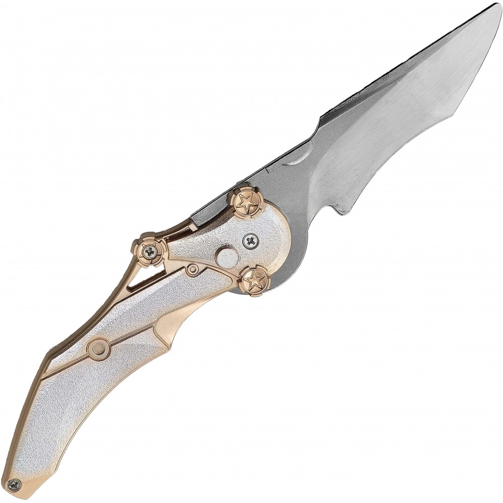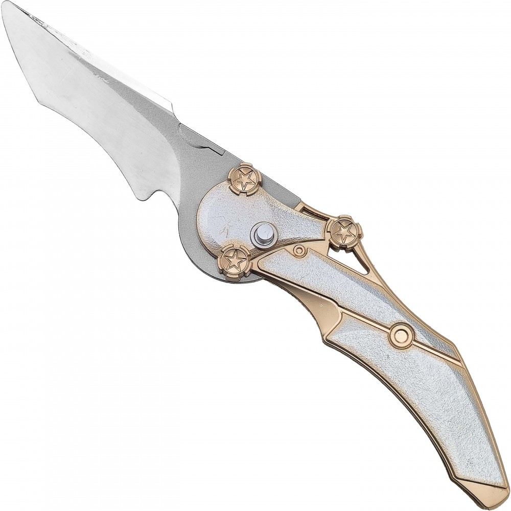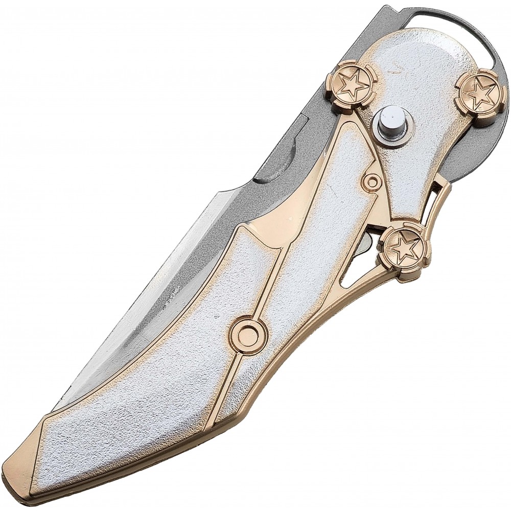 Vystřelovací nožík Blade of Mercy zaujme fanoušky herních zbraní hlavně svým netradičním sci-fi vzhledem, který vychází z nože inspirovaného hrou Delta Force. Kombinace stříbrného a zlatého provedení působí výrazně a futuristicky, takže nožík dobře vynikne ve sbírce, na poličce i jako doplněk pro fanoušky herních replik. Už na první pohled je jasné, že tady hraje hlavní roli design a herní atmosféra.