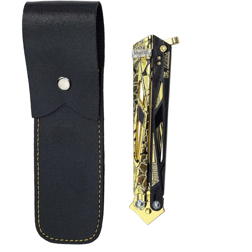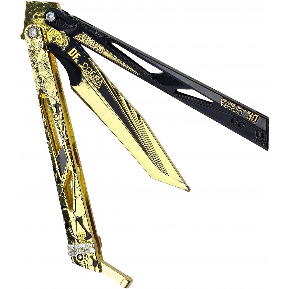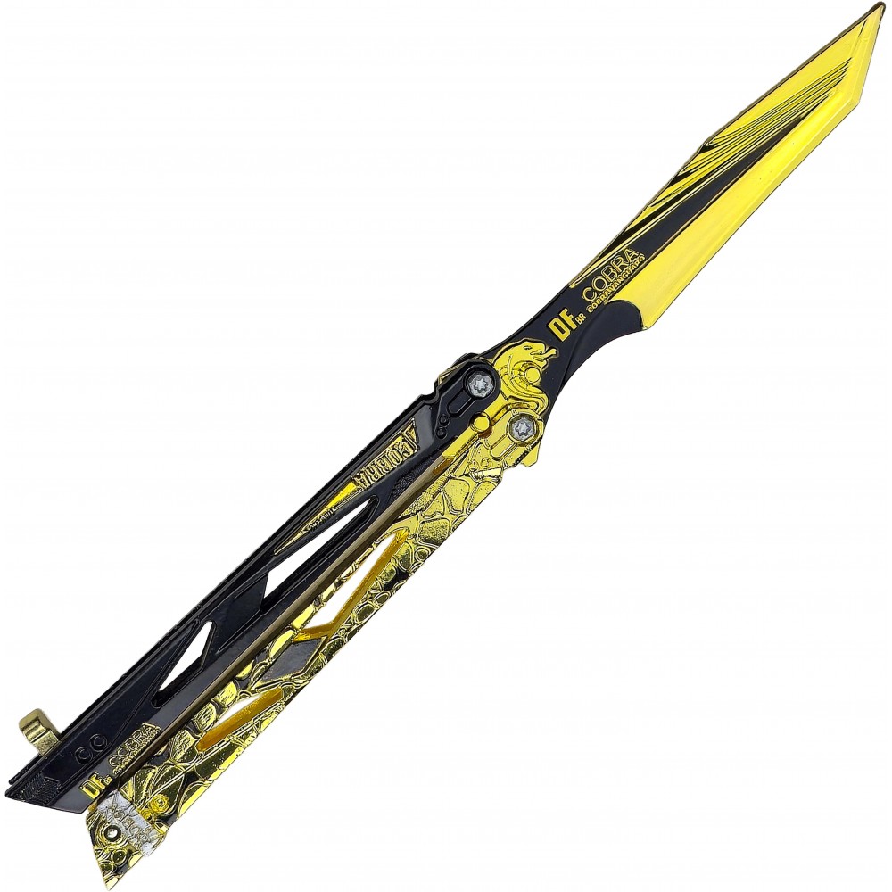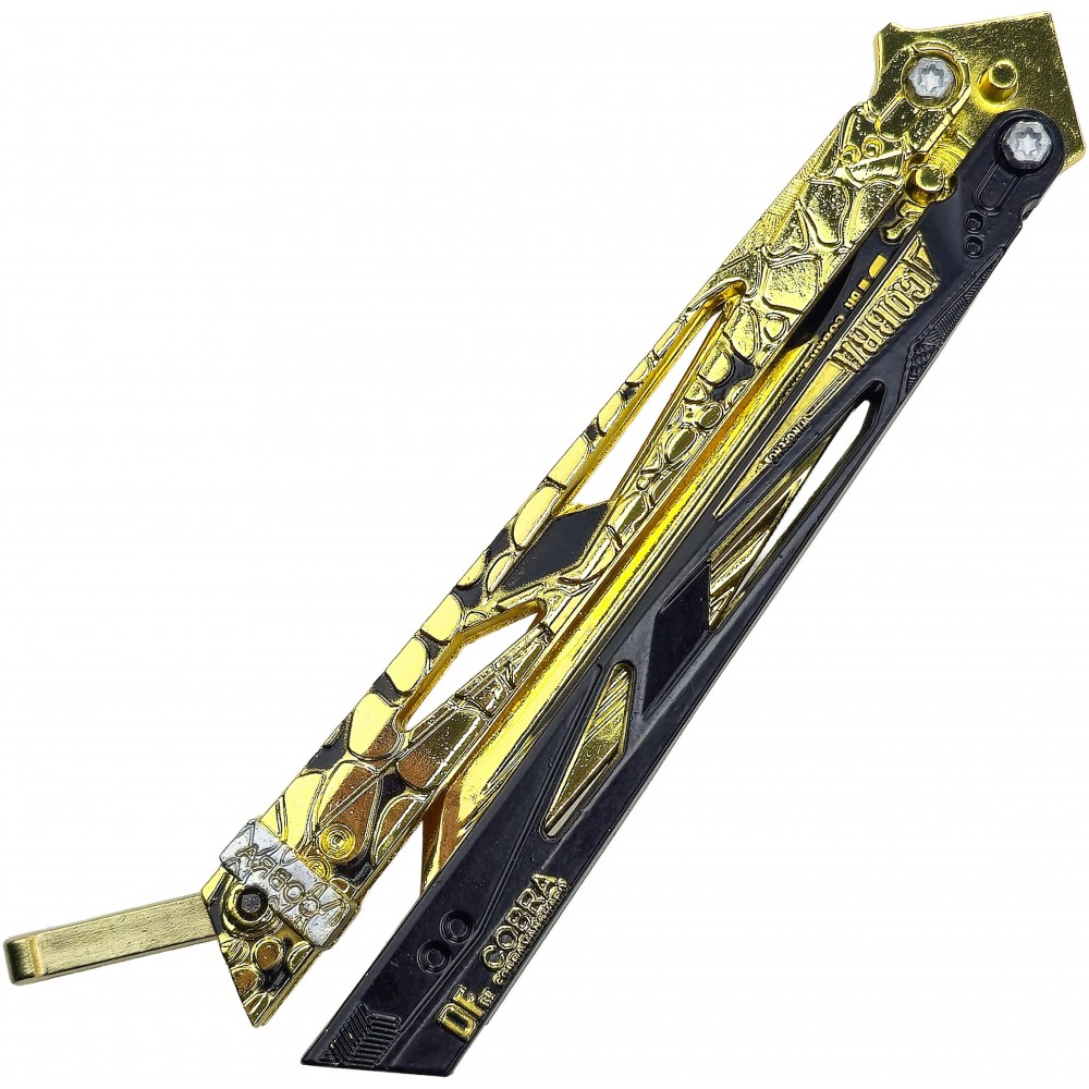 Balisong Cobra Vanguard zaujme na první pohled výrazným zlato-černým designem, který připomíná futuristické zbraně ze světa Delta Force. Ostré linie, dekorativní výřezy a kontrastní barevné detaily dávají tomuto motýlku agresivní a technologický vzhled, který dobře zapadne mezi herní repliky i fantasy nože. Ve vitríně nebo na stole působí jako nepřehlédnutelný kousek, který si okamžitě získá pozornost.