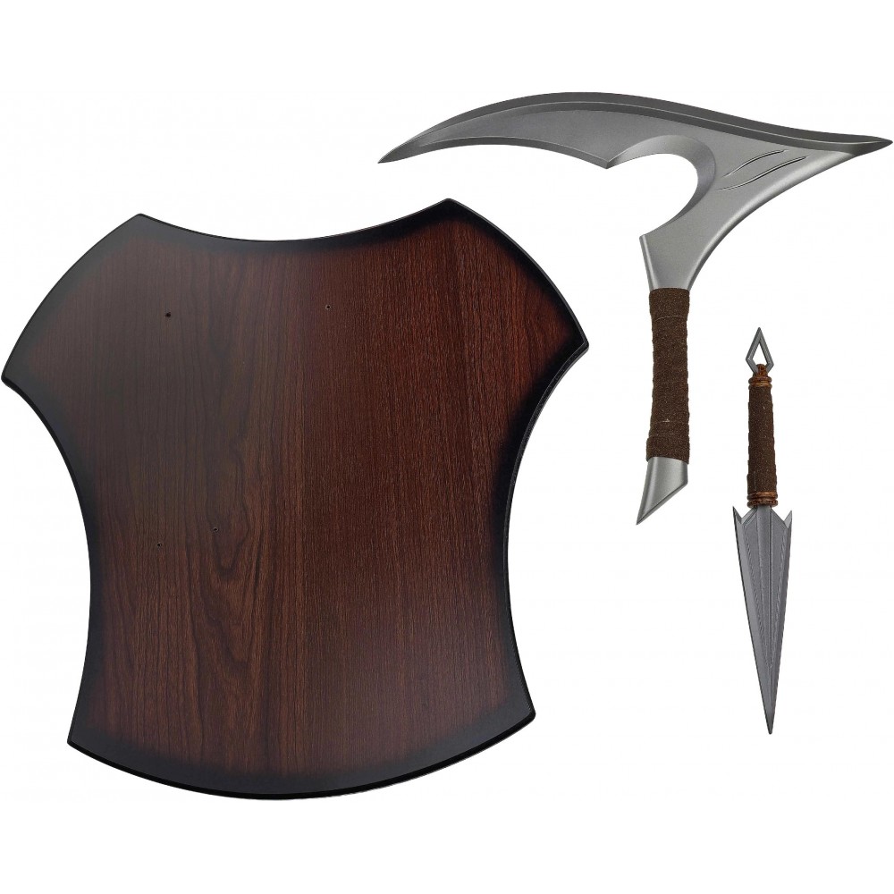 Konstrukce vychází z nerezové oceli a zachovává realistické proporce odpovídající herní předloze. Čepele jsou z bezpečnostních důvodů neostřené, což umožňuje bezpečné vystavení nebo použití jako rekvizity. Rukojeti jsou omotané umělou kůží pro lepší úchop a vizuální autenticitu. Součástí je také tvarovaná dřevěná plaketa, která umožňuje elegantní montáž na zeď a prezentaci celé sady.