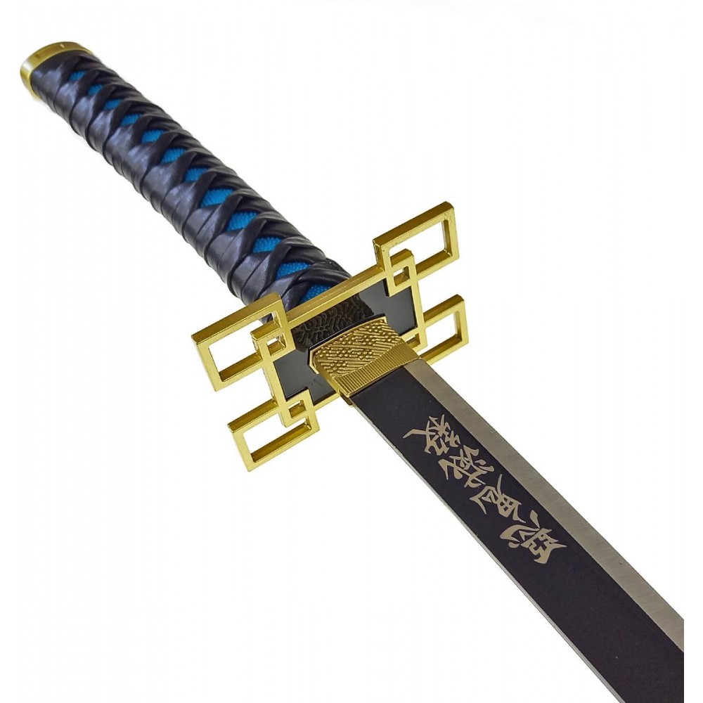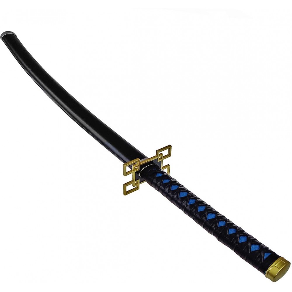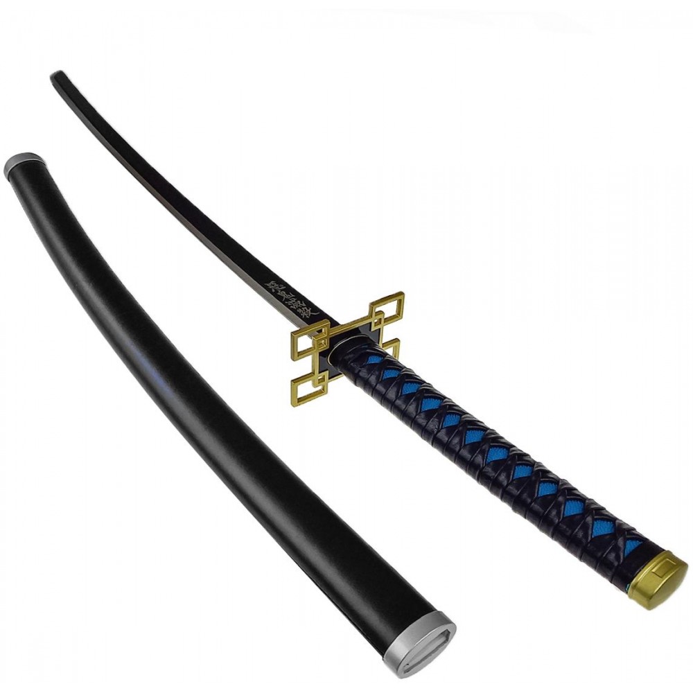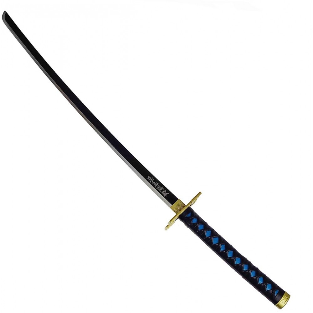Na spodní straně čepele najdeme Japonské znaky, které znamenají "Ničit démony". Na čepel navazuje zdobená 1:1 s originální předlohou. Umělohmotná rukojeť o délce 26,5 centimetrů je vyvedena v modré barvě a překryta opletem z černé eko-kůže. Rukojeť Vám díky svému tvaru krásně zapadne do ruky a díky jejímu povrchu je pohodlná na dotek.