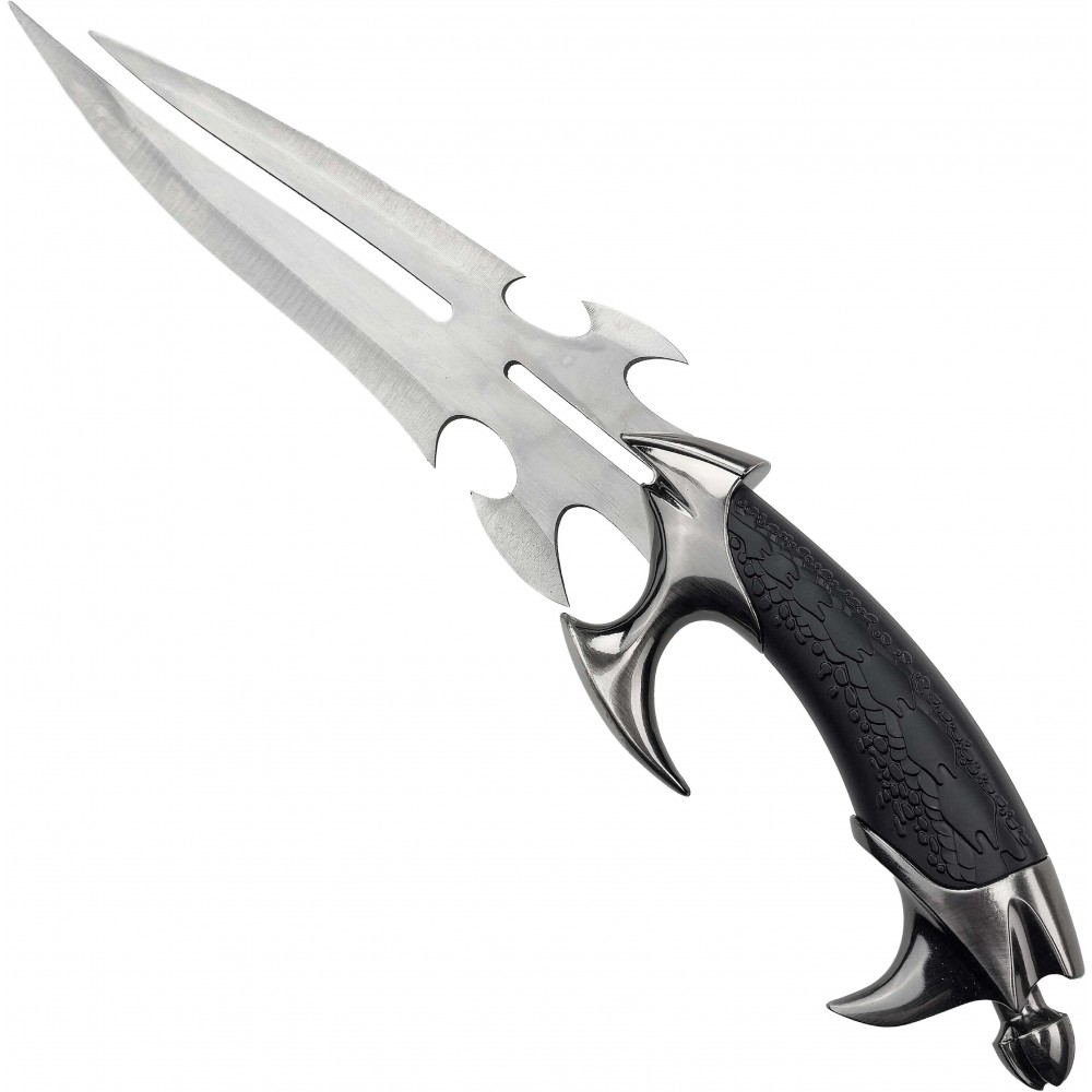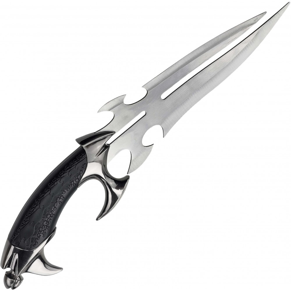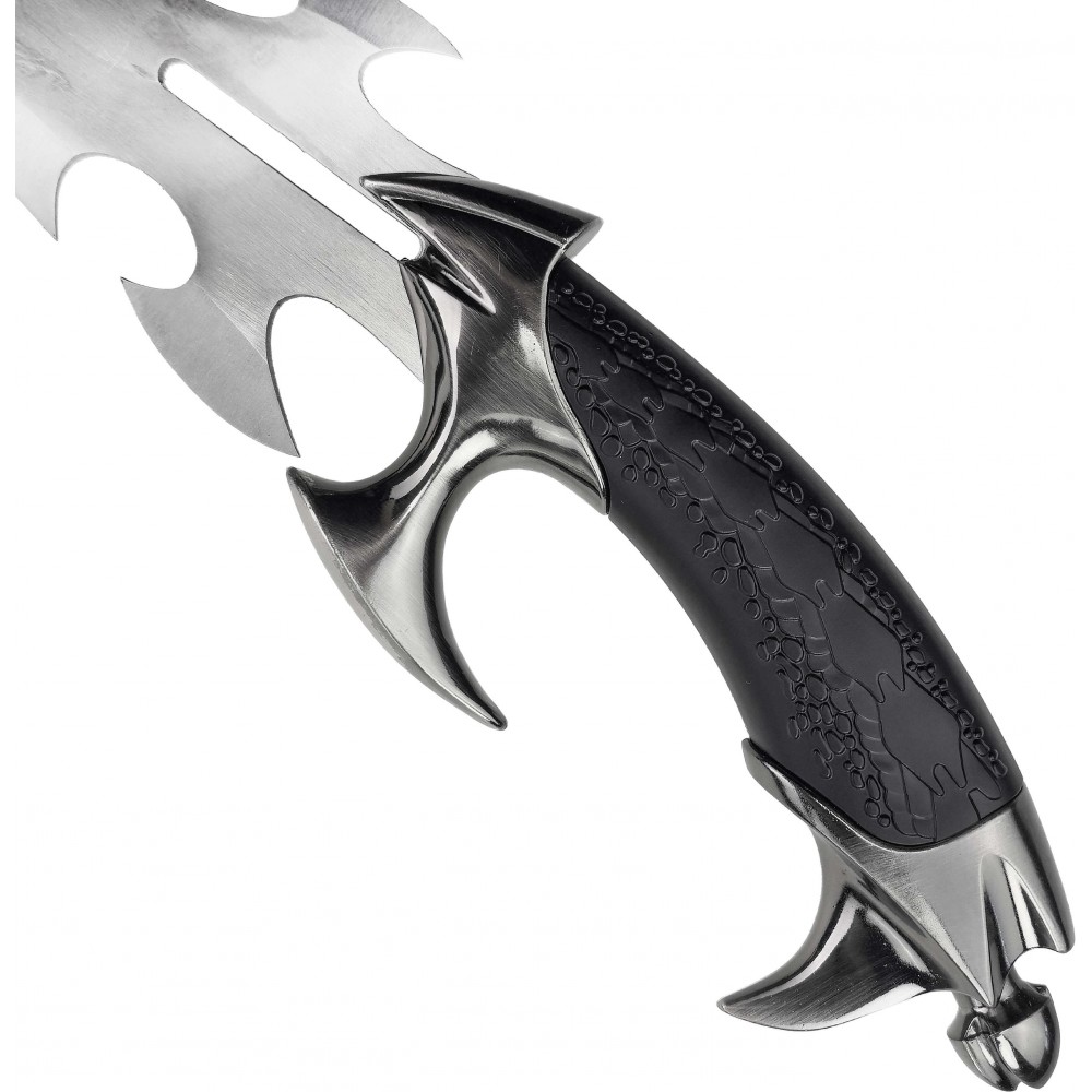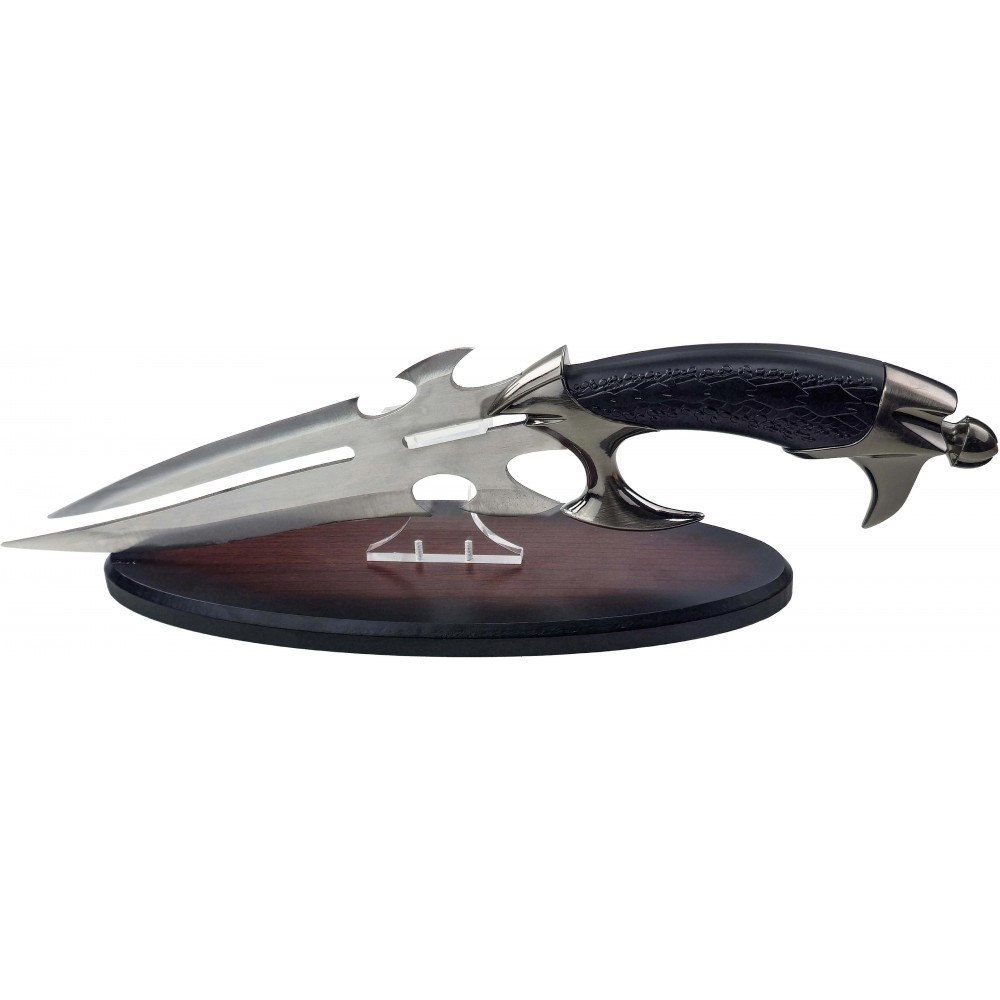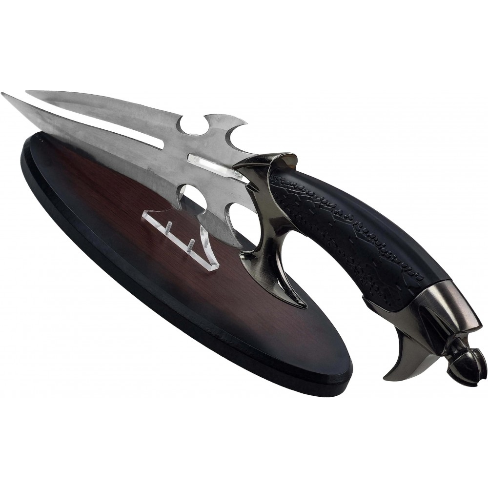 Čepel je vyrobena z nerezové oceli a je neostřená, což odpovídá výstavnímu charakteru. Tvar čepele s výraznými výřezy a symetrickým profilem podtrhuje fantasy design. Rukojeť z ABS plastu je ergonomicky tvarovaná a doplněná o kovové prvky, které zajišťují pevný úchop i vizuální autenticitu. Součástí je také dřevěný stojánek, který umožňuje bezpečné a stylové vystavení.