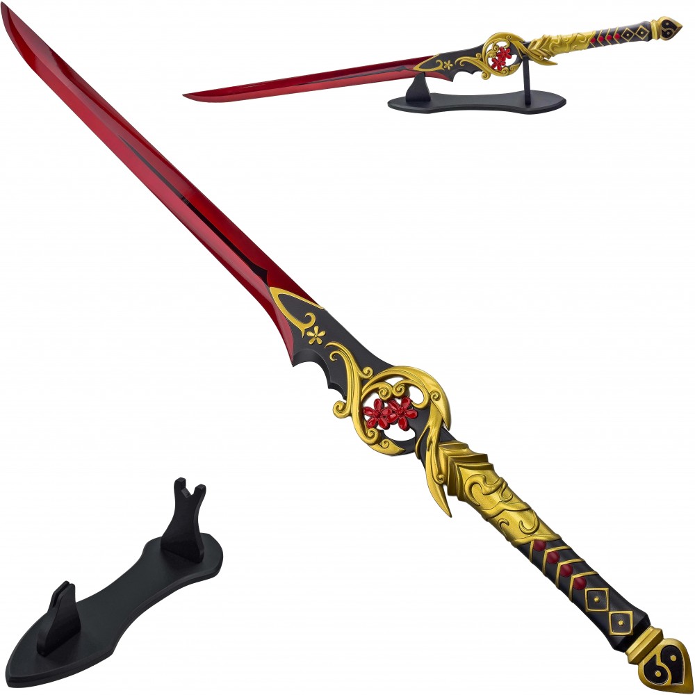 Čepel je vyrobena z nerezové oceli a není ostrá, meč tak slouží jako dekorace nebo cosplay doplněk. Rukojeť ze slitiny hliníku doplňují zdobené prvky v kontrastních barvách, které zvýrazňují fantasy vzhled. Součástí balení je také dřevěný stojánek umožňující vystavení na stole nebo polici.