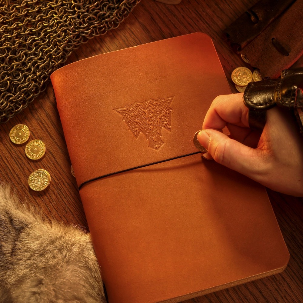 Ručně vyrobený kožený zápisník s vyraženým symbolem vlčí hlavy, inspirované zaklínačskou Školou vlka. Stylový zápisník na cesty, do kterého si můžete zaznamenávat vaše úkoly, recepty na zaklínačské lektvary, nebo ho můžete využít jako bestiář. S tímhle zápisníkem zkrátka uděláte skvělý dojem na Kaer Morhen, v Novigradu i v Toussaintu. Zápisník sestává z obalu, který je ručně vyroben z hovězí kůže v naší dílně, a z nelinkované náplně, která je vyměnitelná. Do obalu tak pohodlně umístíte jakýkoli sešit formátu A5. Zápisník má elegantní zaoblené rohy a je opatřen gumičkou, která zabraňuje nechtěnému otevření.